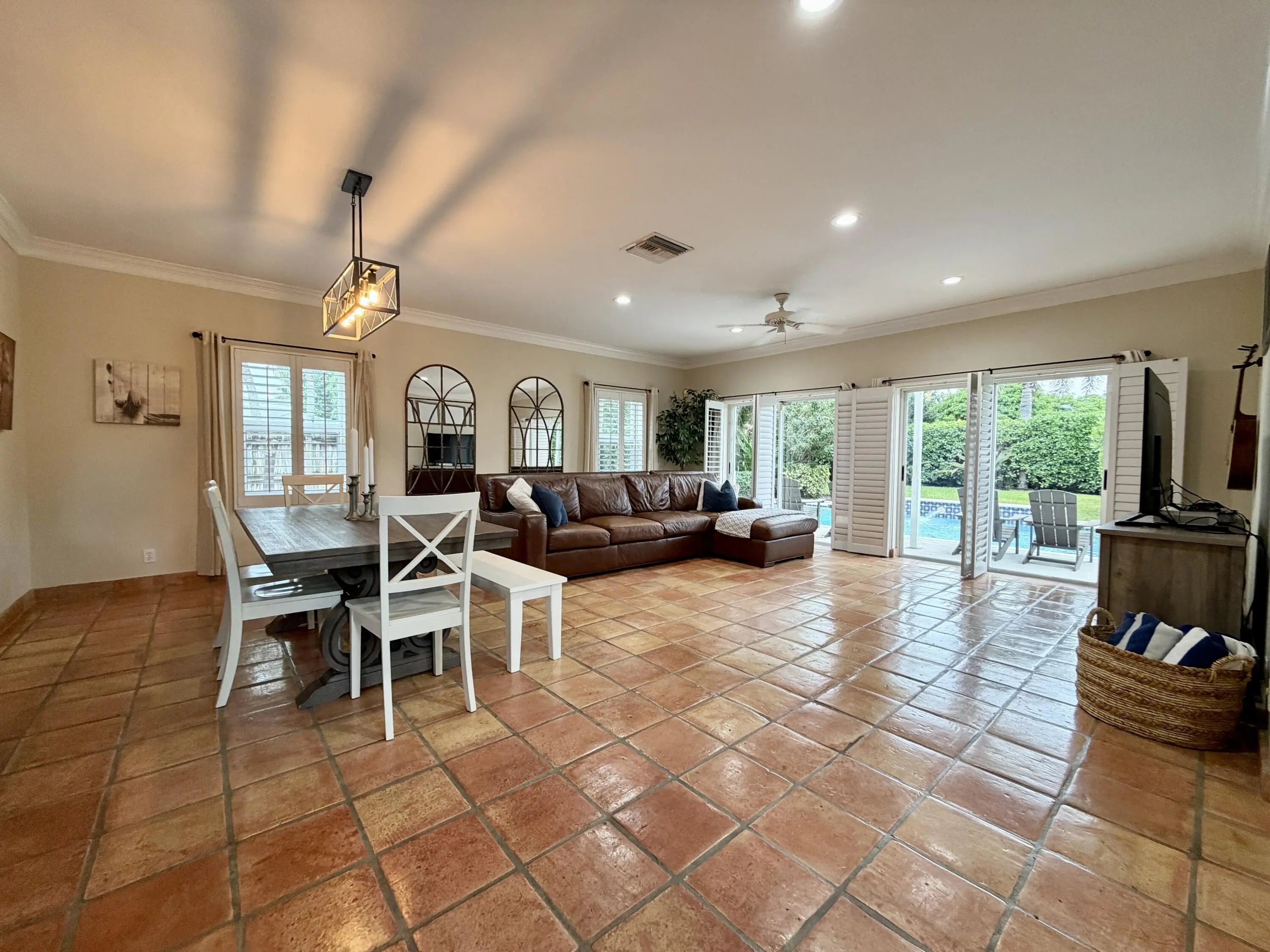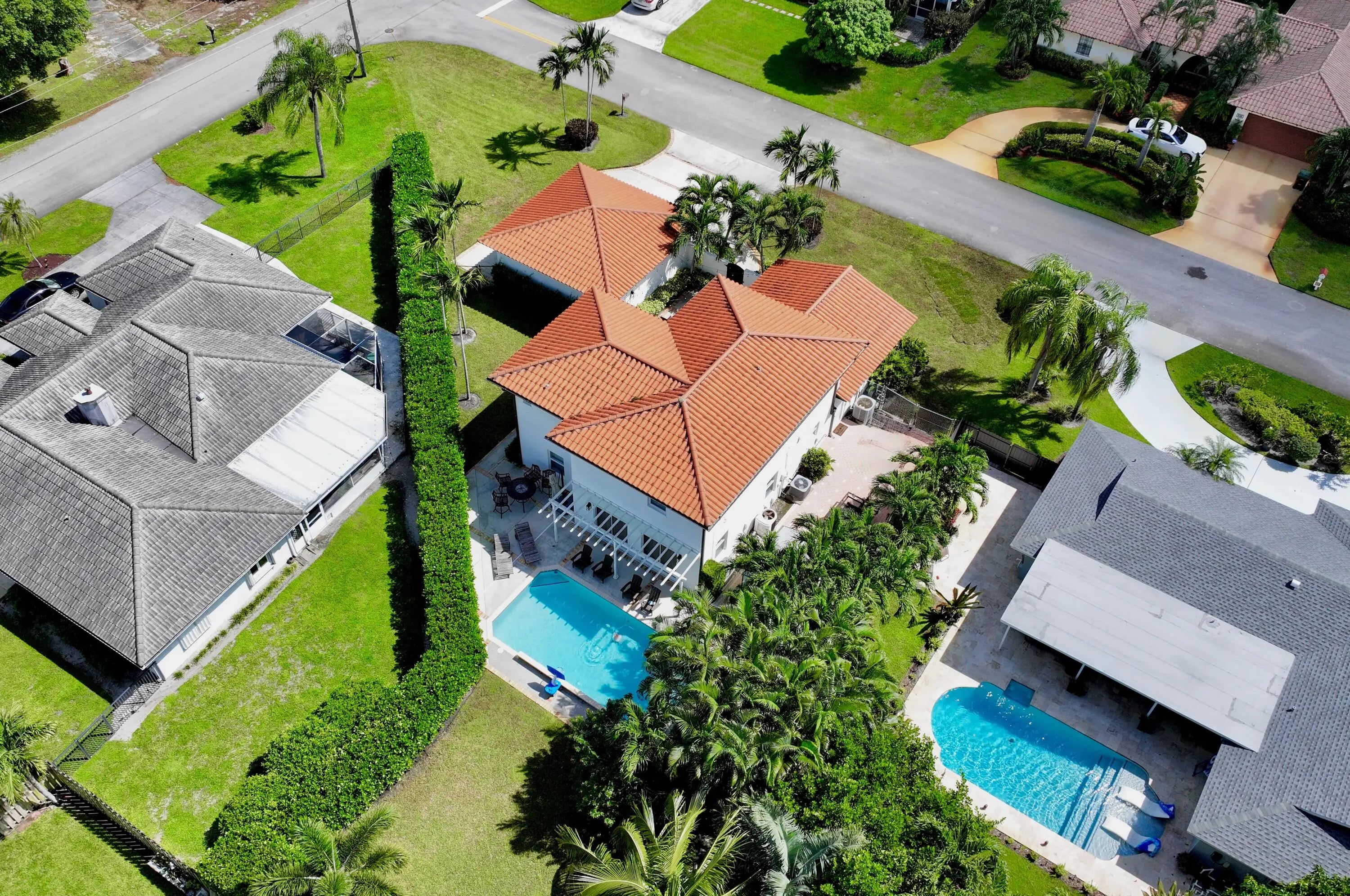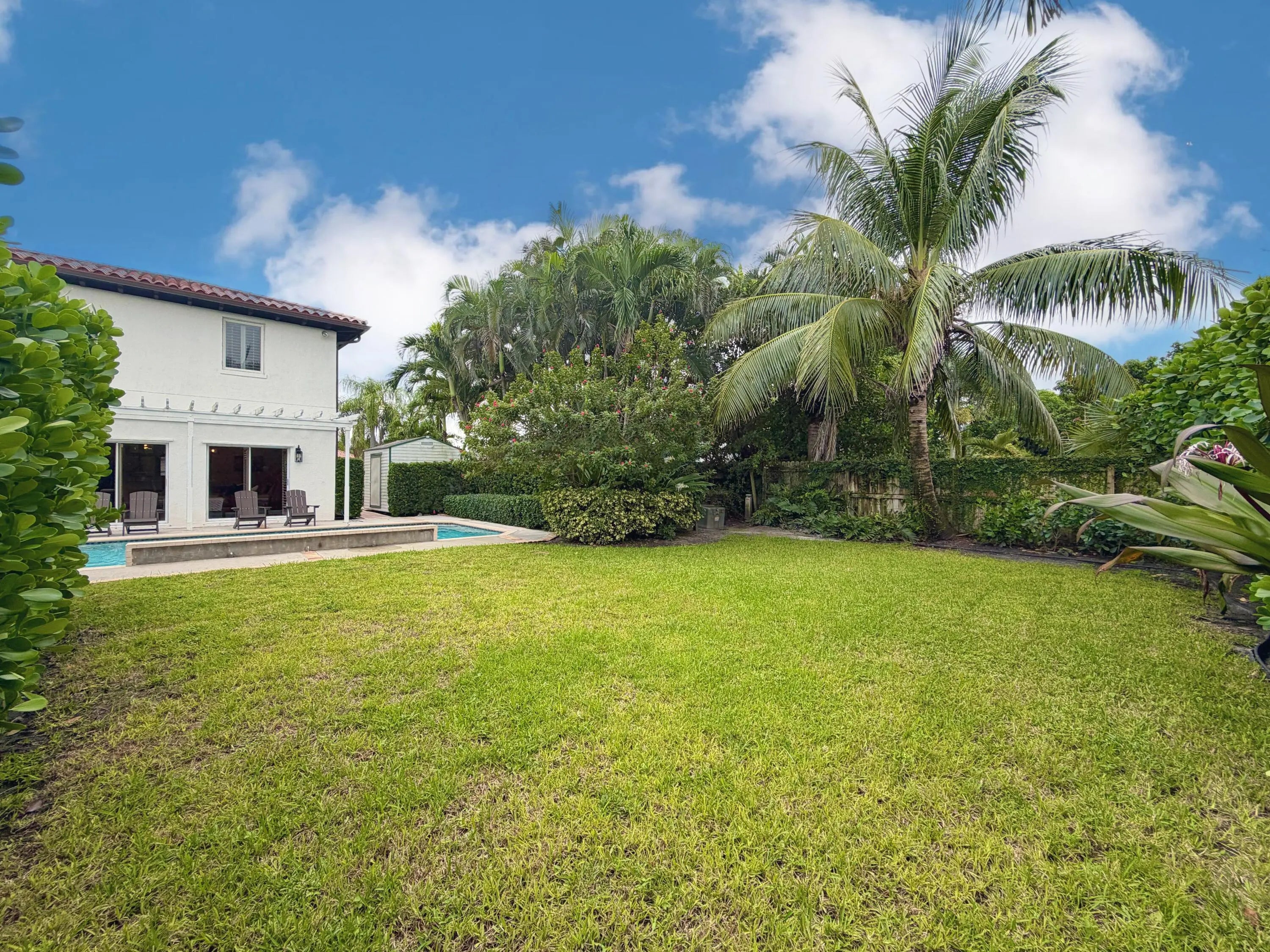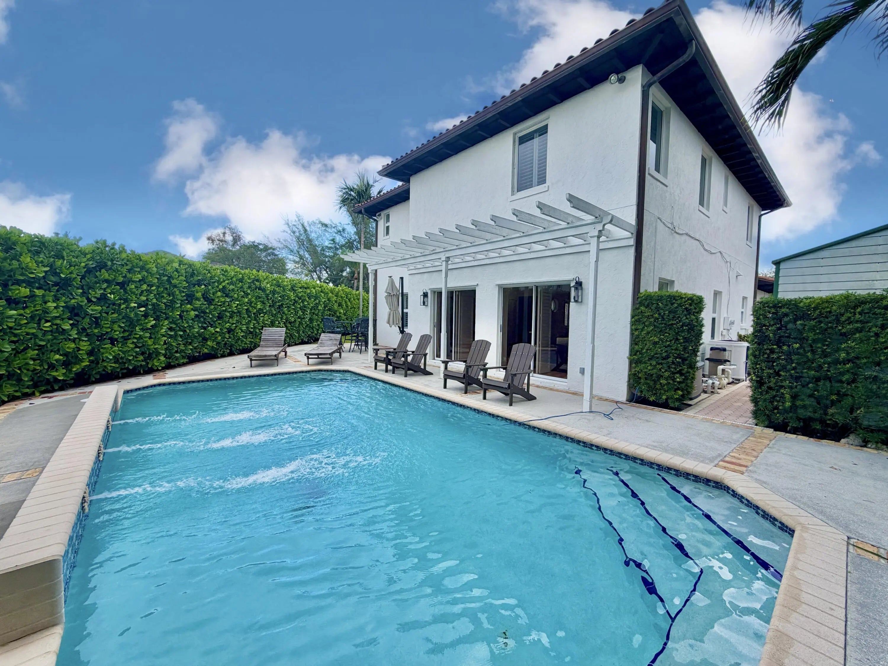 Spacious 4-bedroom, 3-bath pool home with 2,509 sq. ft. under air, offering a private resort-style setting and exceptional outdoor space. Features include a detached 2-car garage, large driveway, and a backyard with pool, covered patio, and storage shed. The first floor offers two living areas, dining room, U-shaped kitchen, laundry, and one bedroom. Upstairs includes a large primary suite with walk-in closet, built-ins, and dual sinks. Enjoy privacy with mature hedges and plenty of space for outdoor fun. Take a ride in this golf-cart-friendly community to the nearby pickleball courts! Pet friendly and no HOA. Near Lake Clarke Shores boat ramp for easy water access.