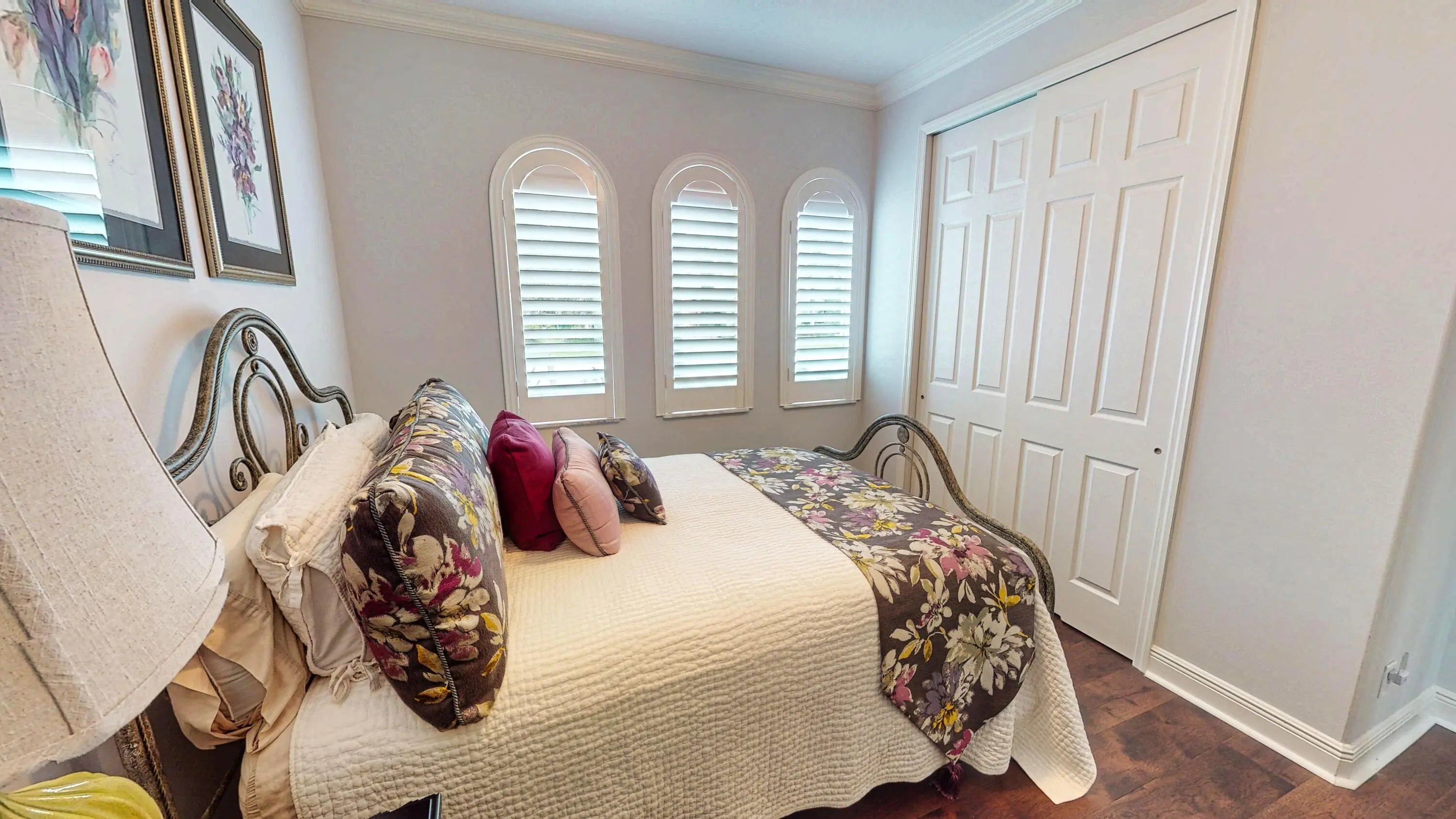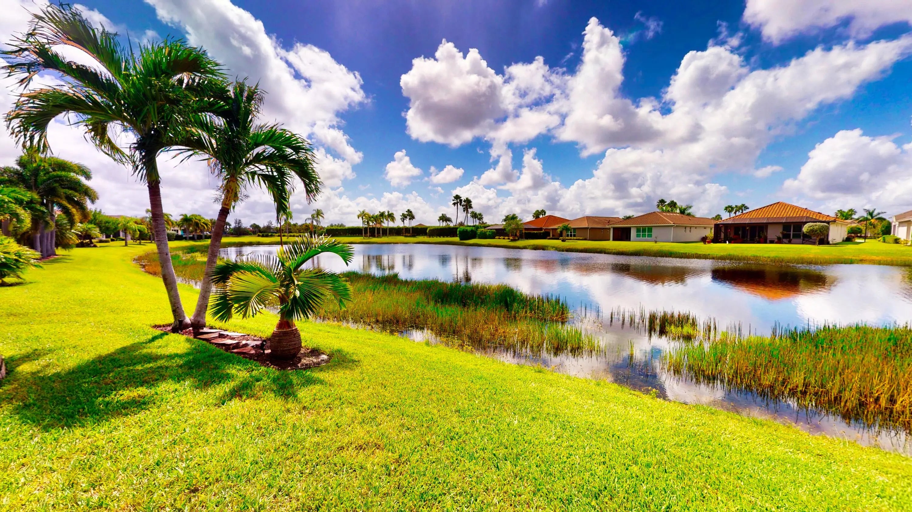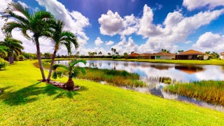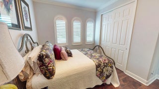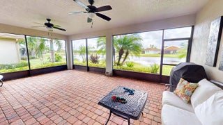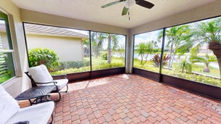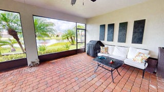 This beautifully appointed 2-bedroom, 2-bath home with a den offers over 2100 sq. ft. of luxurious living space and impeccable design throughout. The open floor plan features a spacious great room that flows seamlessly into the dining area and gourmet kitchen, complete with quartz countertops, 42-inch cabinets, and an upgraded gas range. Unique double glass French doors lead to an extended, covered lanai where you can enjoy stunning lake views and lush, upgraded landscaping, the perfect setting for entertaining or quiet relaxation. The home showcases elegant details such as crown molding, custom cabinetry, a barrel tile roof, and impact windows for peace of mind. The den includes built-in dual desks and cabinets, ideal for a home office or creative space.