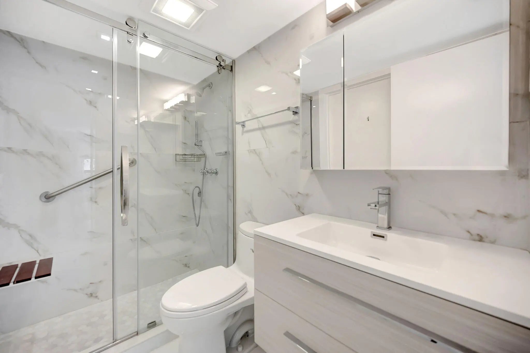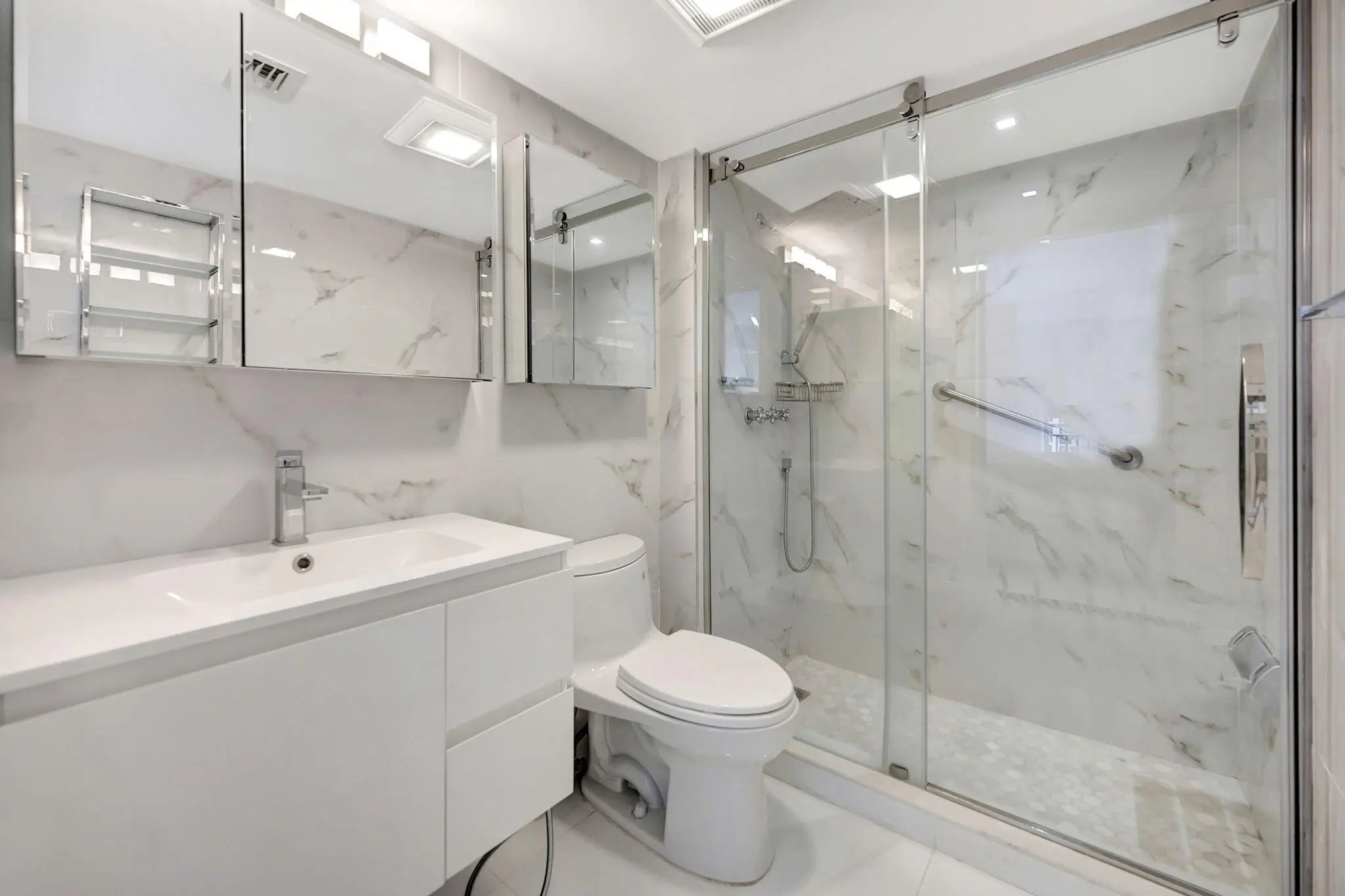 Experience Brickell Key living in this modern fully renovated 2 bedroom, 2 bath condo with stunning water views. Located in one of Miami's exclusive island communities. Steps from world-class shopping, dining, and entertainment, the building features a heated saltwater pool, Jacuzzi, fitness center, 24-hour concierge, and valet. Features include an in-unit washer and dryer and one parking space, with additional parking for rent. From the moment you enter you know you have found something special. Large format white marble tiles on the floor, modern furnishings, white and wood cabinets with quartz counters and marble baths make this the perfect home. Why go through the hassle and cost of renovating when you can move right into this stunning home.