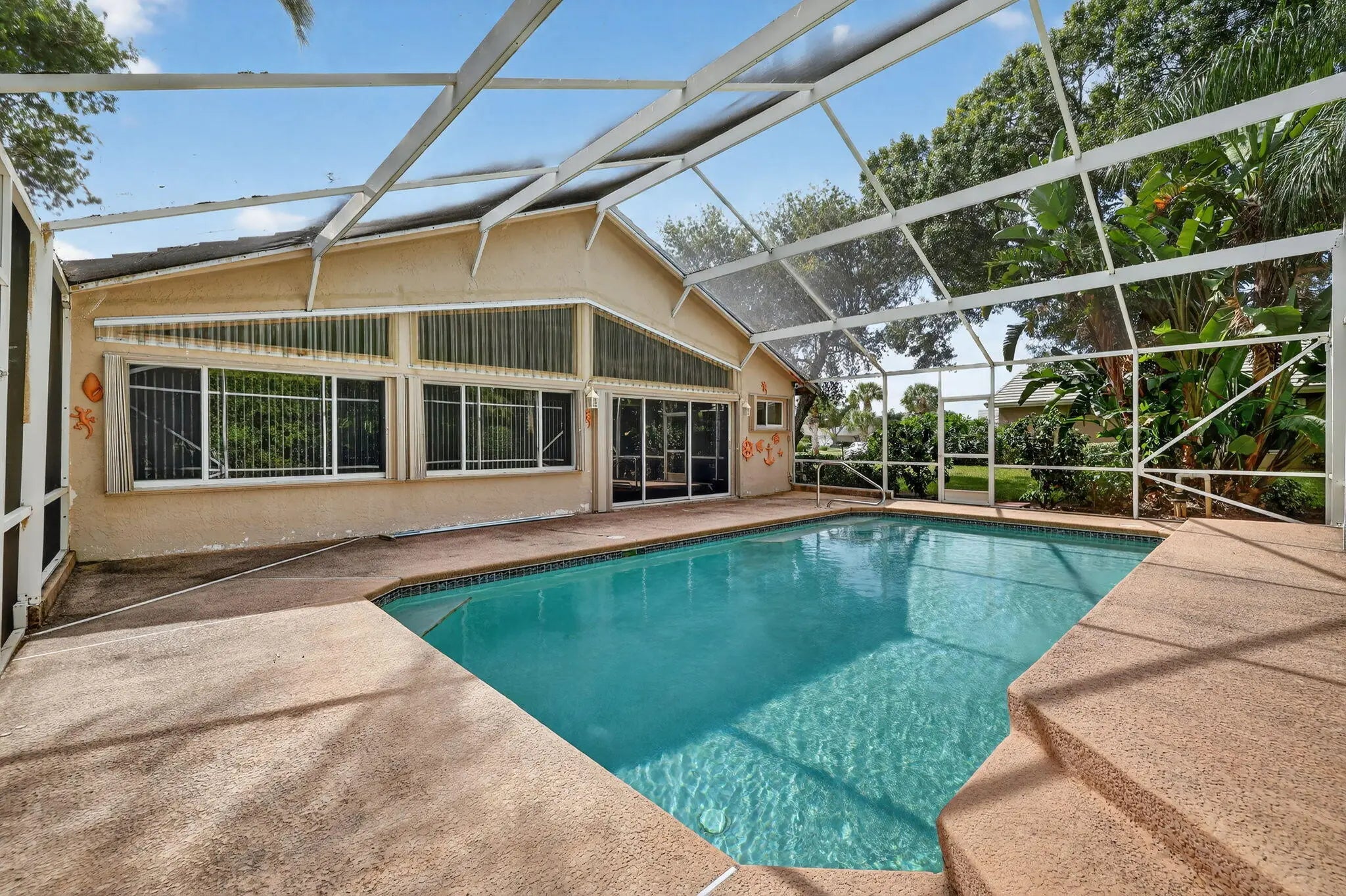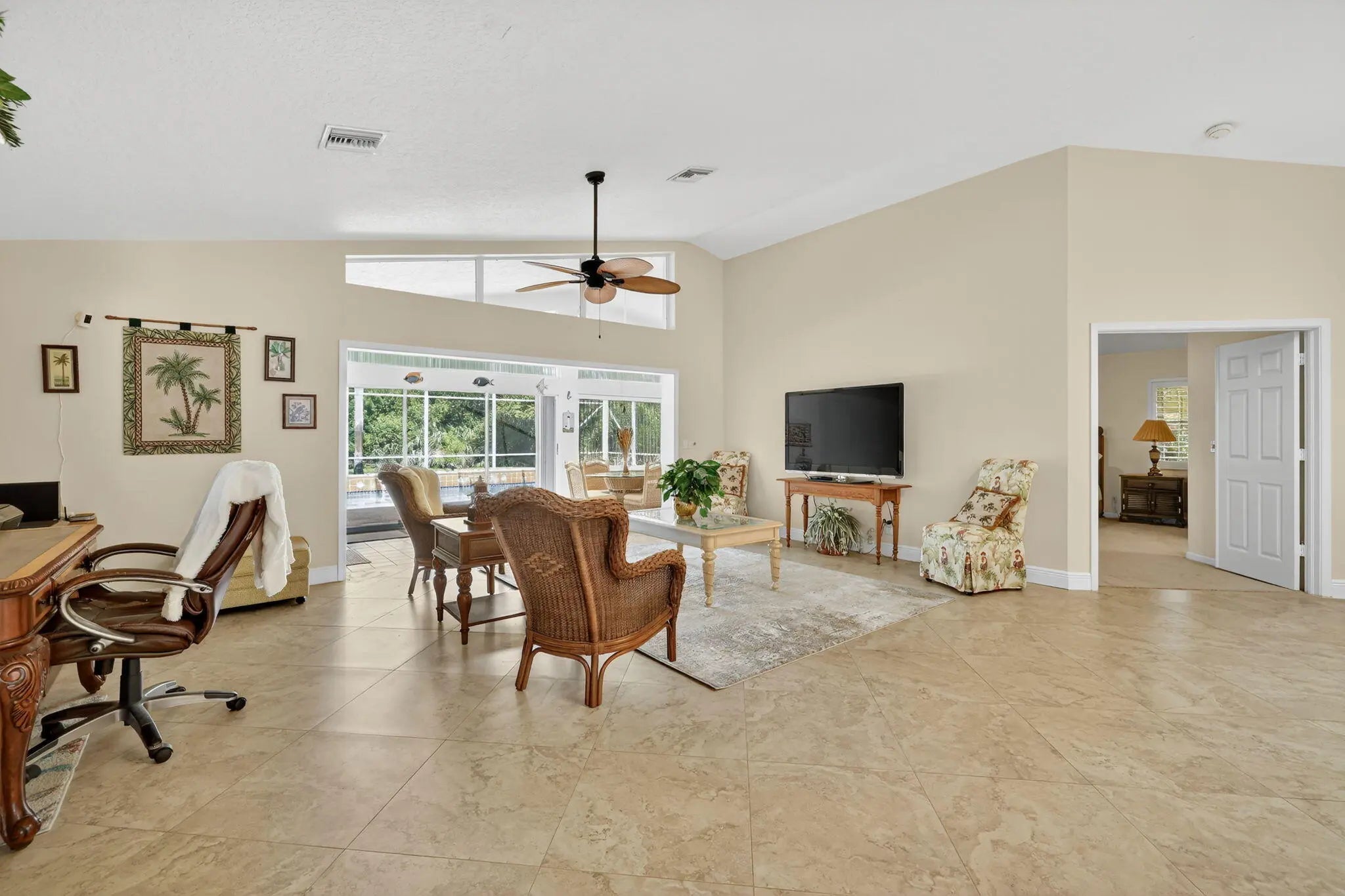 Welcome to Marsh Landings at PGA Village! This 3-bedroom, 3-bath pool home with a 2-car garage is ideally located on a quiet cul-de-sac within the golf community of PGA Village. The home offers a spacious split floor plan filled with natural light, providing comfortable living spaces for everyday life.The master bathroom has been recently renovated and features dual sinks and modern finishes. Enjoy the Florida lifestyle with a screened pool and covered patio area, perfect for relaxing or entertaining guests. The main living areas feature ceramic tile flooring, while all bedrooms have carpet for comfort.Residents enjoy access to resort-style amenities, including large pool