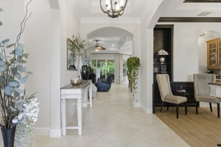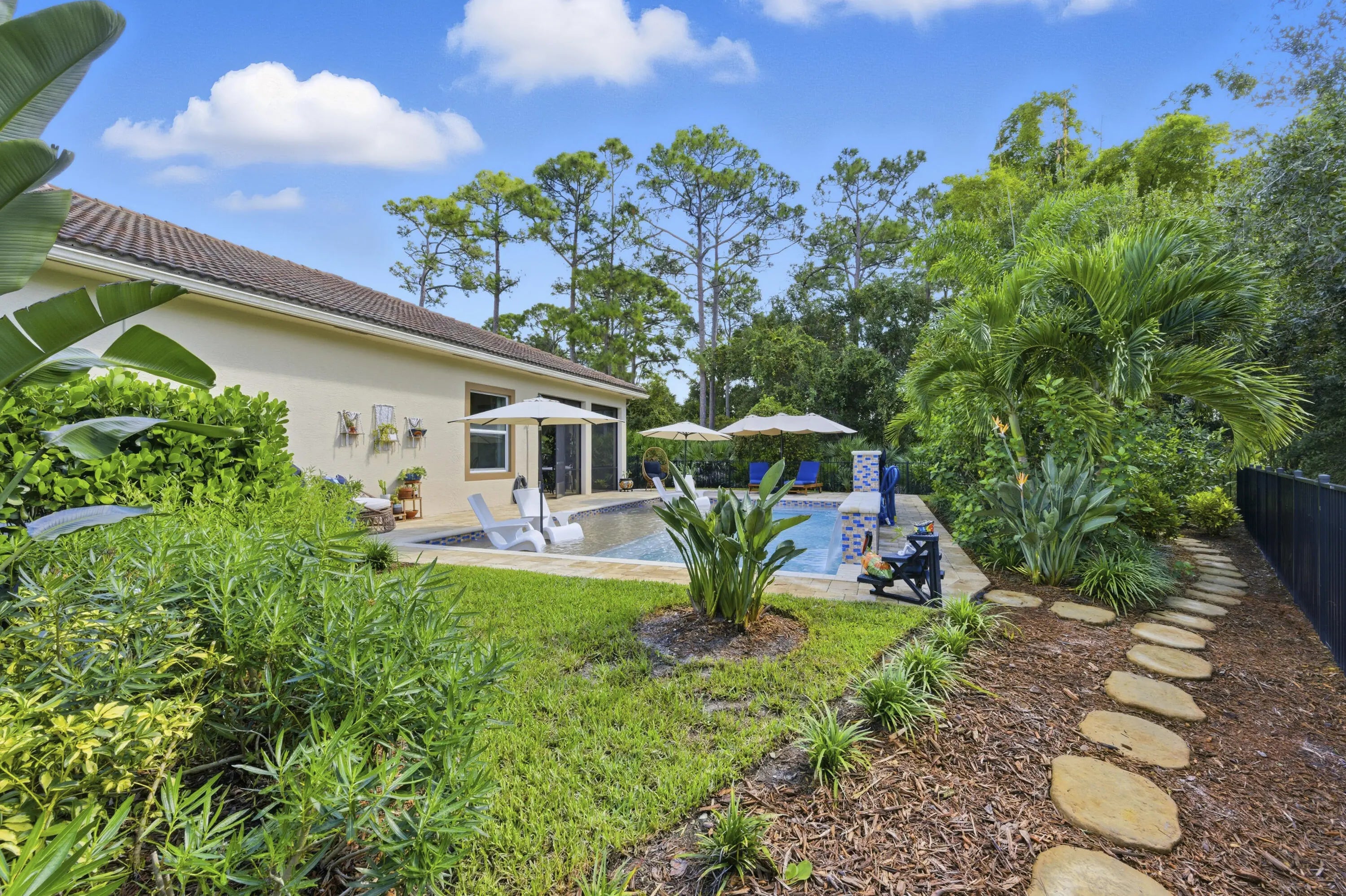 Welcome to Savannah Estates (aka Venetian Village), a gated community of just 50 homes. This well-maintained CBS 3BR/2.5BA pool home offers a 3-car air-conditioned garage with epoxy flooring and is ideally located on a cul-de-sac. Built in 2013, features include impact windows, crown molding, tiled common areas, and refreshed 2024 landscaping with remote irrigation. The driveway, patio, and pool deck are covered with brick-pavers. Enjoy a screened lanai overlooking the heated saltwater pool and spa with lighted waterfalls (2024) --perfect for entertaining or relaxing in style. A kitchen window was added for more natural light and a pool view. Convenient to I-95, schools, shops, medical services dining, parks, beaches, and golf. PBI is approx 45 minutes away. Up to three pets welcome.