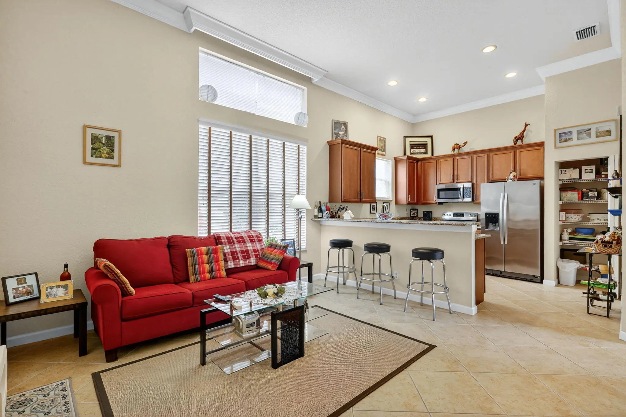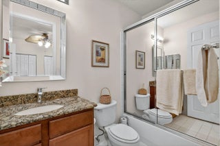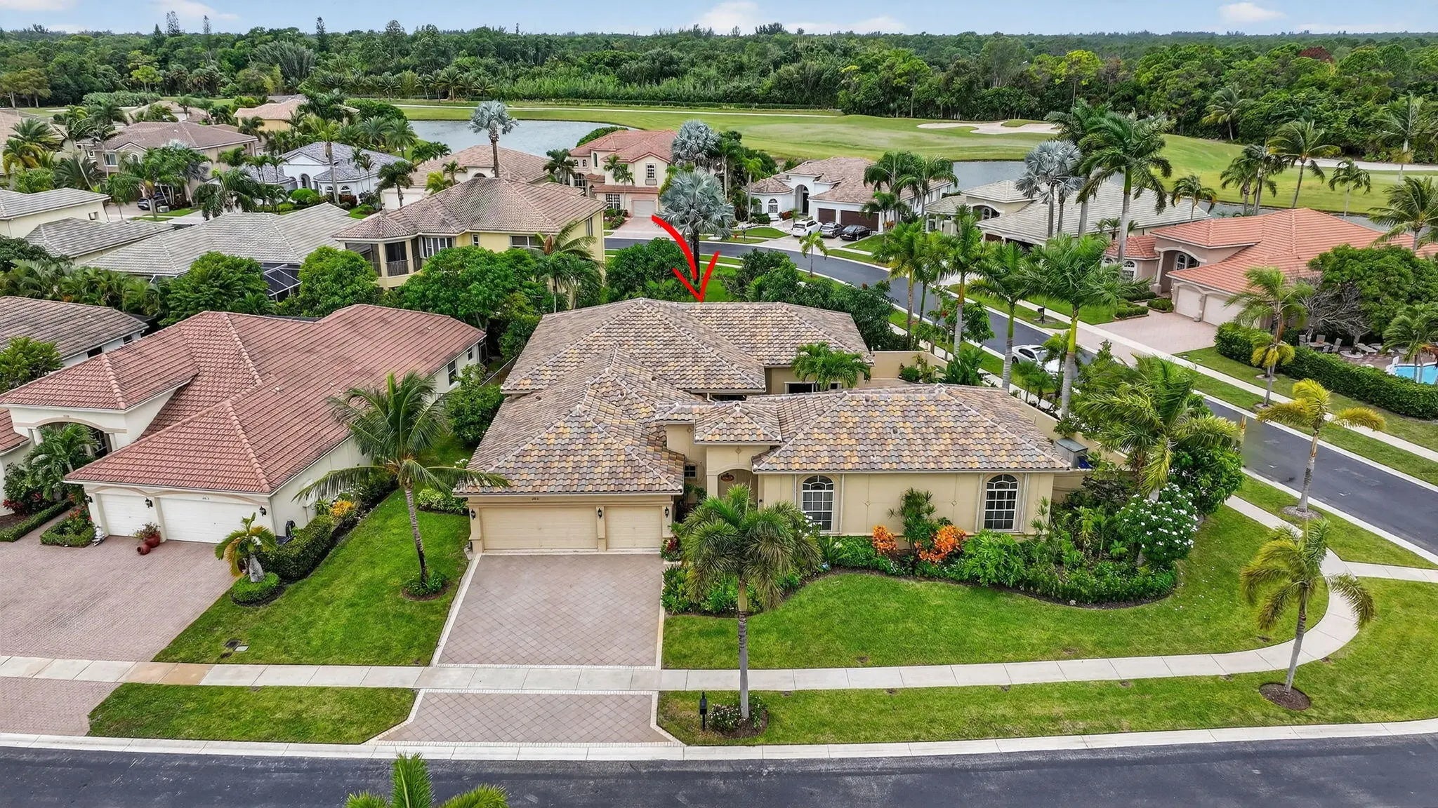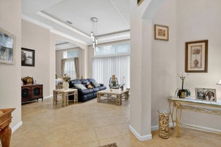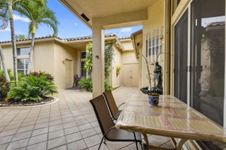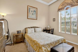 Large guest house or in-law quarters! This very rare courtyard style residence has an expanded guest house and a brand new roof! You enter through a double door entry into a private and tropical courtyard area with free-form pool. The main house features 3 bedrooms , 3 baths with a spacious and open floorplan, formal living, dining and family rooms, indoor utility with extra cabinetry and a laundry tub and a 3 car garage. 12' ceilings throughout, updated appliances, split bedrooms, unique master with private entry and giant 12 x 10 walk in closet and nicely appointed bath with dual vanities, roman tub and separate shower. The guest house has a private entrance living room and kitchen w all appliances, 2 spacious brs, bath & washer/dryer. Gated community, terrific clubhouse, golf avail!