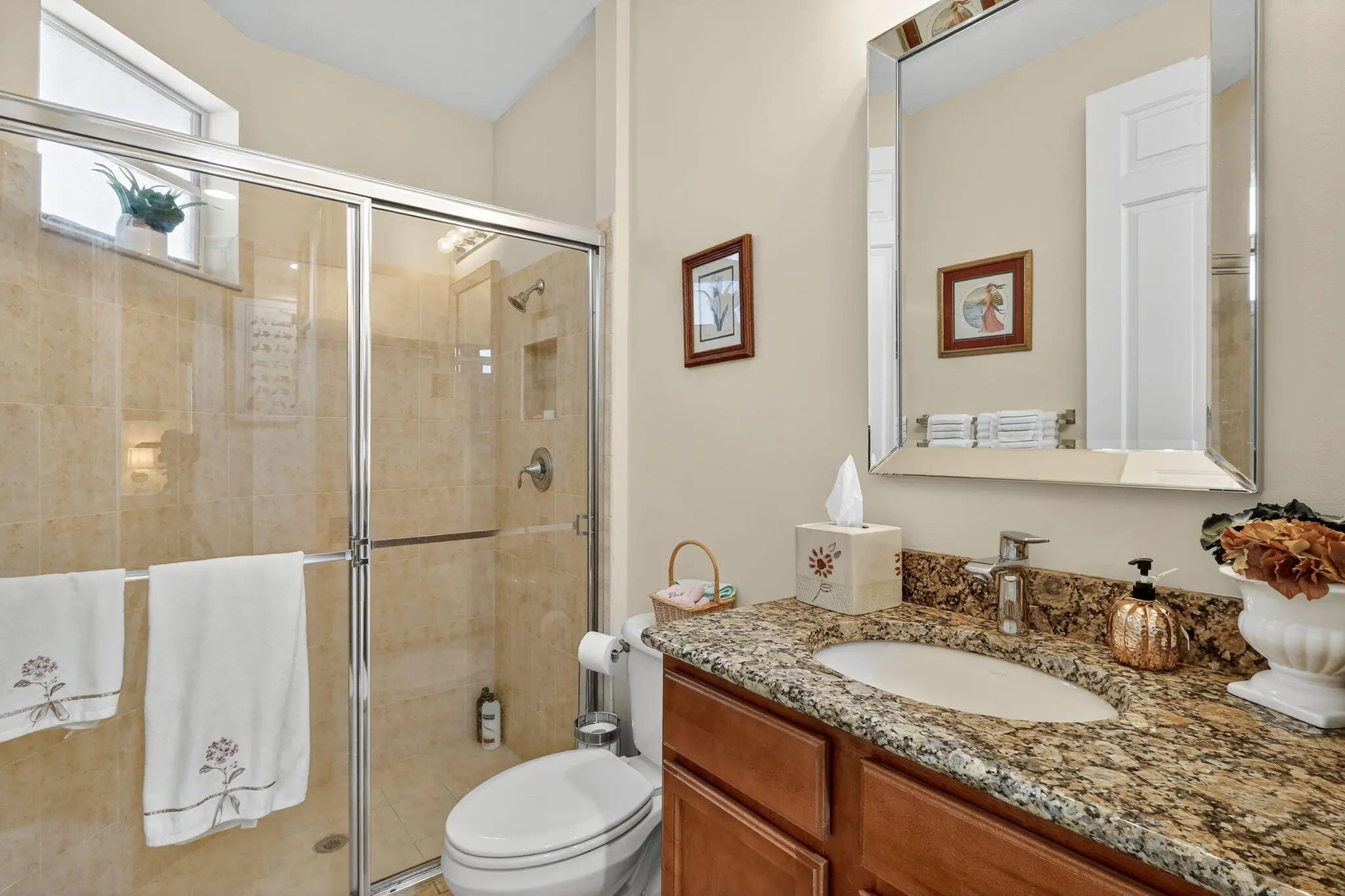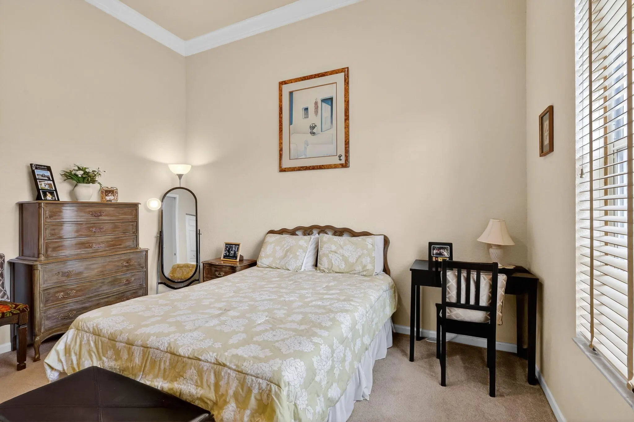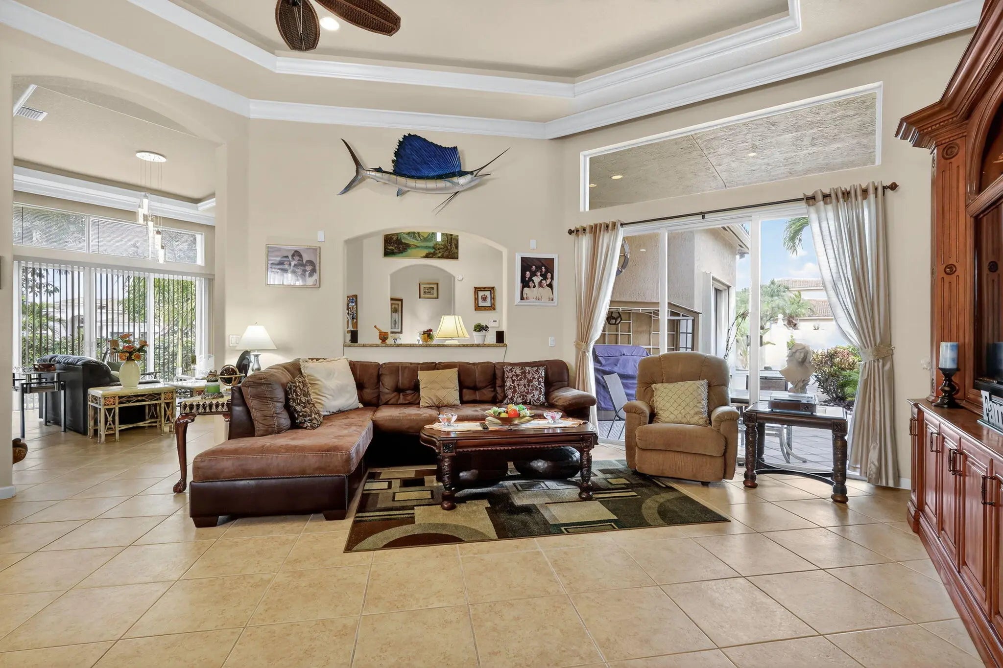 Large guest house or in-law quarters! This very rare courtyard style residence has an expanded guest house and a brand new roof! You enter through a double door entry into a private and tropical courtyard area with free-form pool. The main house features 3 bedrooms , 3 baths with a spacious and open floorplan, formal living, dining and family rooms, indoor utility with extra cabinetry and a laundry tub and a 3 car garage. 12' ceilings throughout, updated appliances, split bedrooms, unique master with private entry and giant 12 x 10 walk in closet and nicely appointed bath with dual vanities, roman tub and separate shower. The guest house has a private entrance living room and kitchen w all appliances, 2 spacious brs, bath & washer/dryer. Gated community, terrific clubhouse, golf avail!