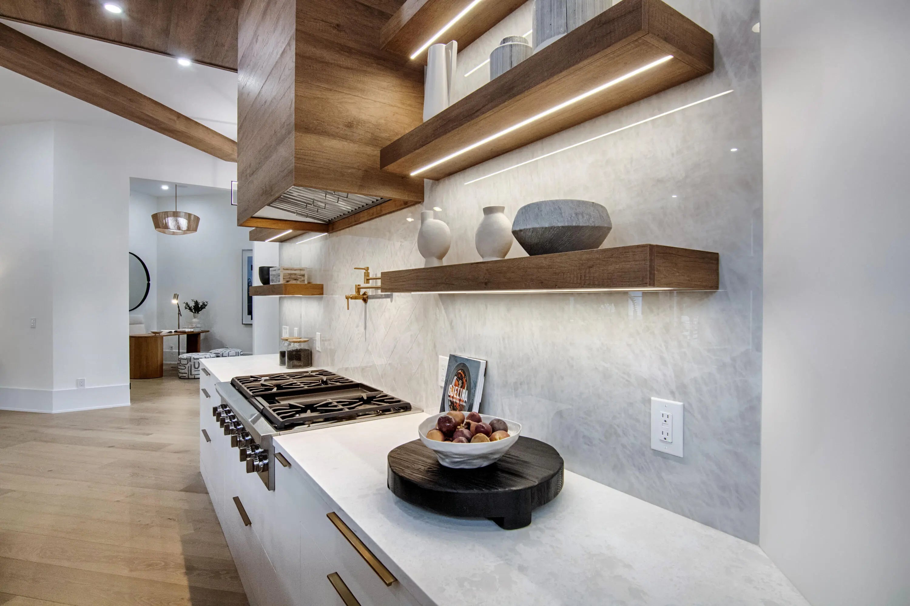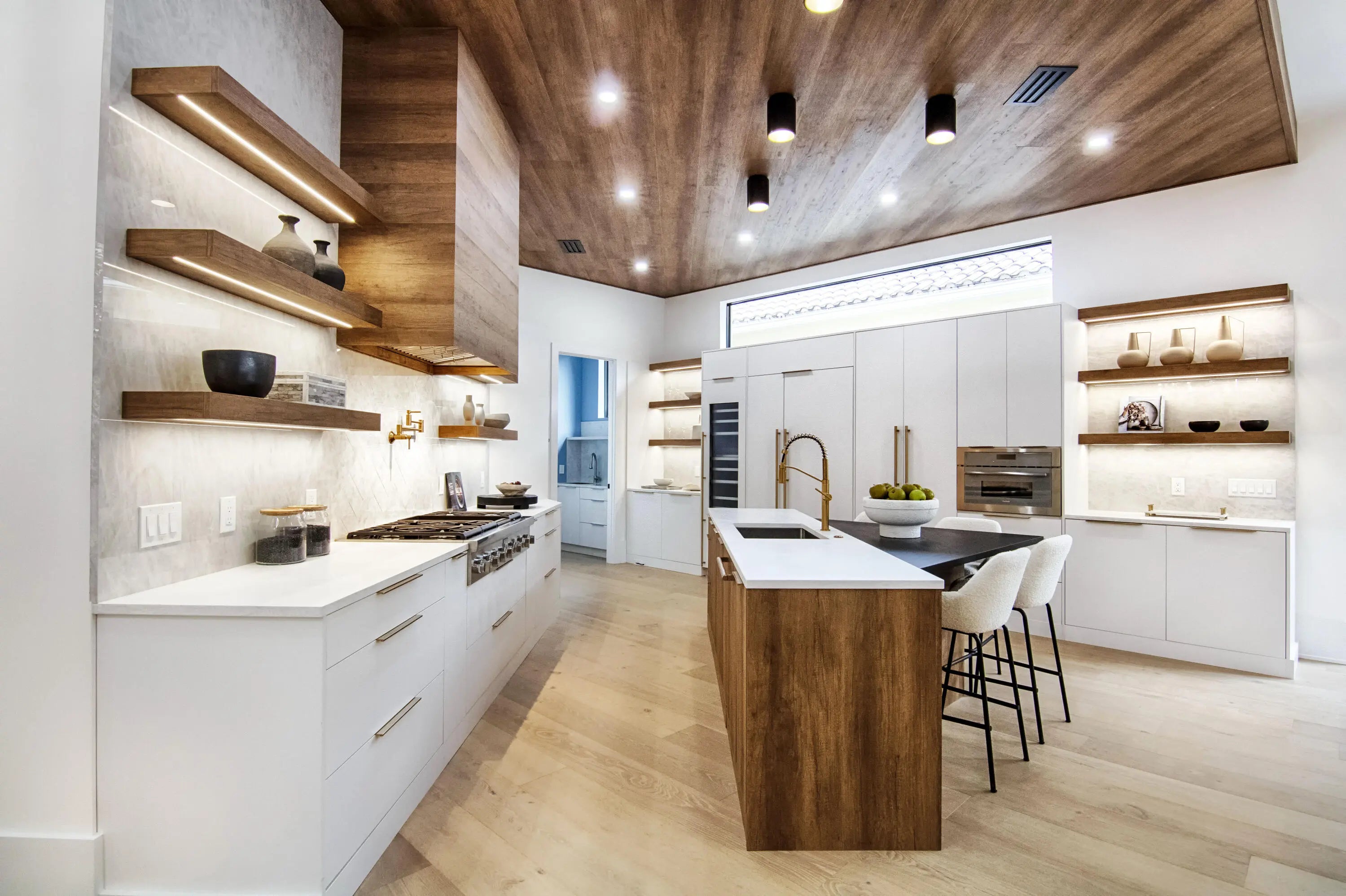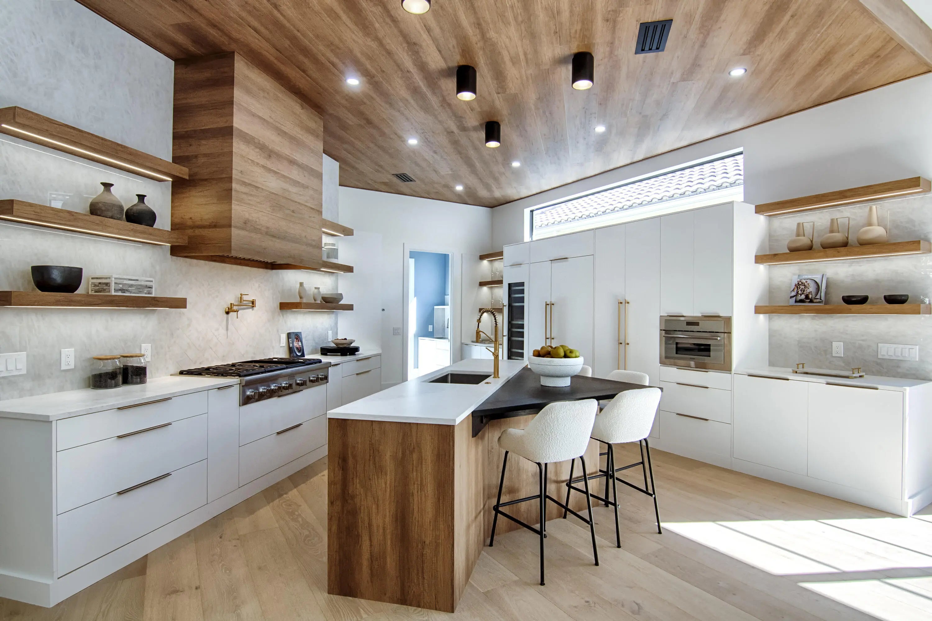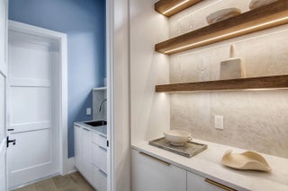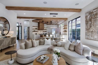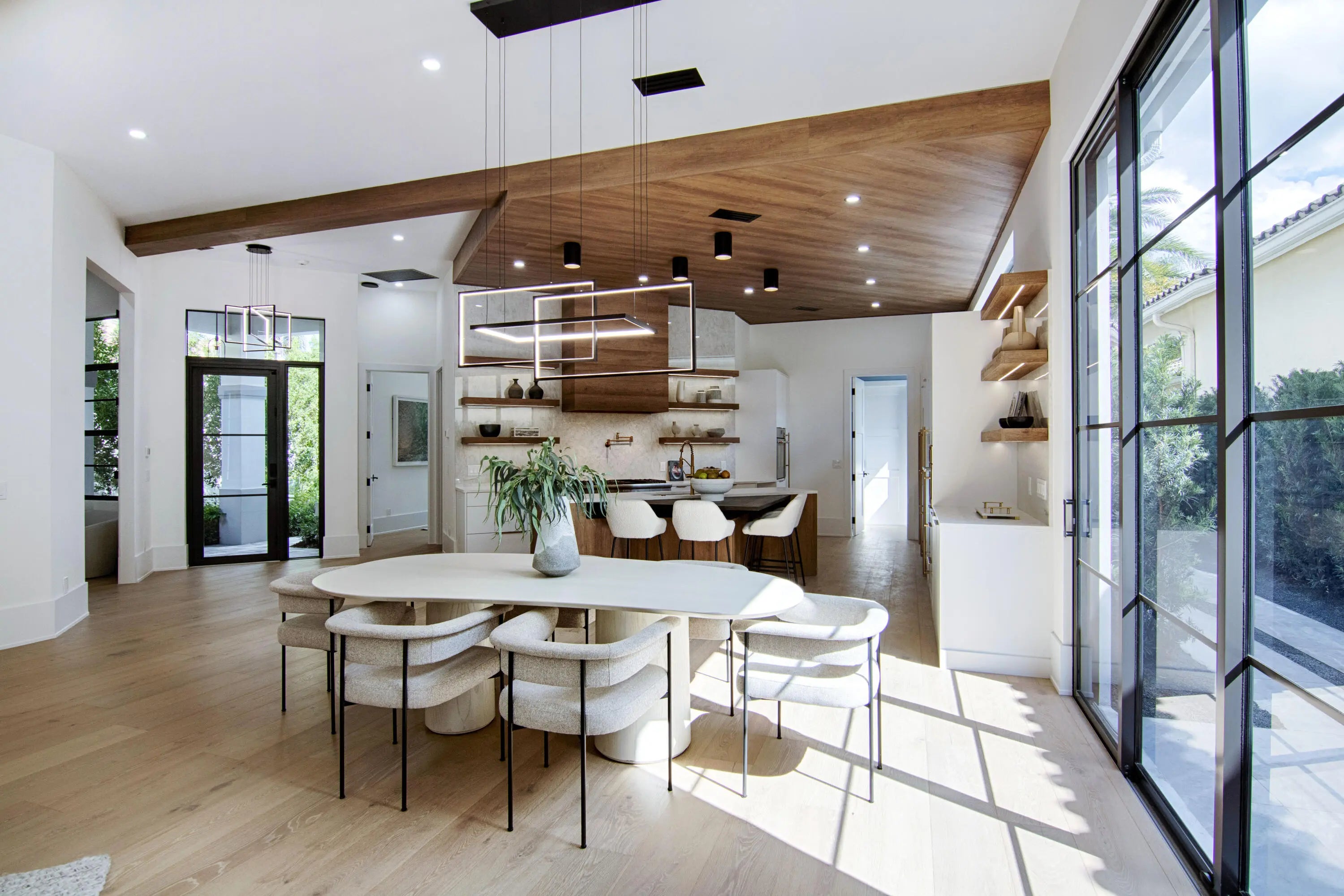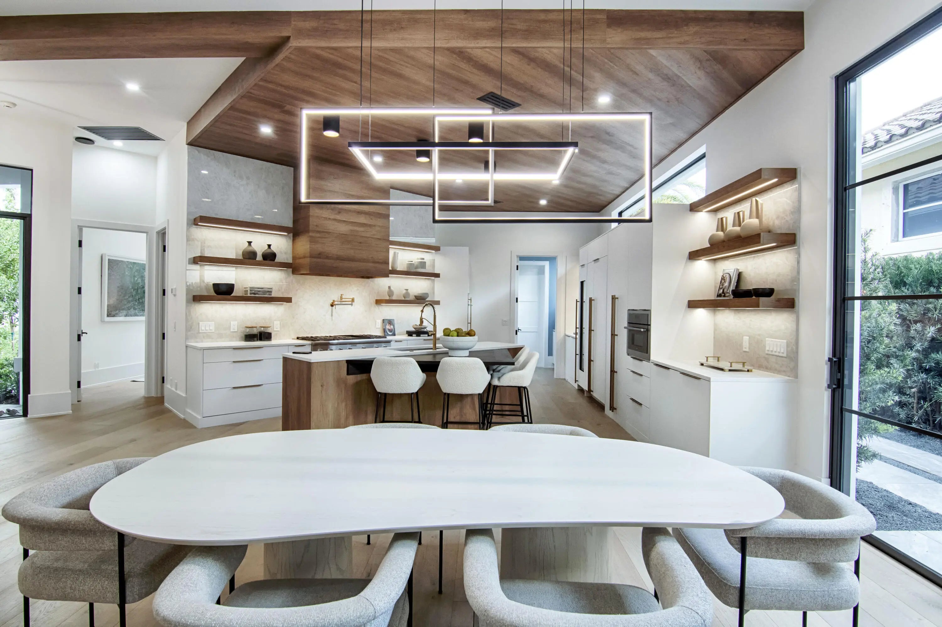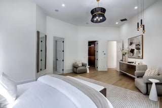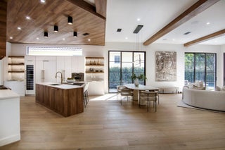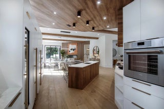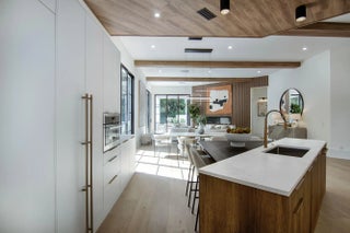 Step into this newly constructed residence that transcends the ordinary, a home where architectural artistry meets effortless livability. Every space has been curated with exquisite attention to detail, blending natural textures, timeless materials, and cutting -edge design. A show -stopping kitchen anchors the home with rich wood finishes, quartz countertops, & floating shelves framed against a soft porcelain back splash. The dramatic island with custom wood inlay invite both gathering and gourmet creation. Integrated professional grade appliances & statement lighting complete this sophisticated culinary space.
