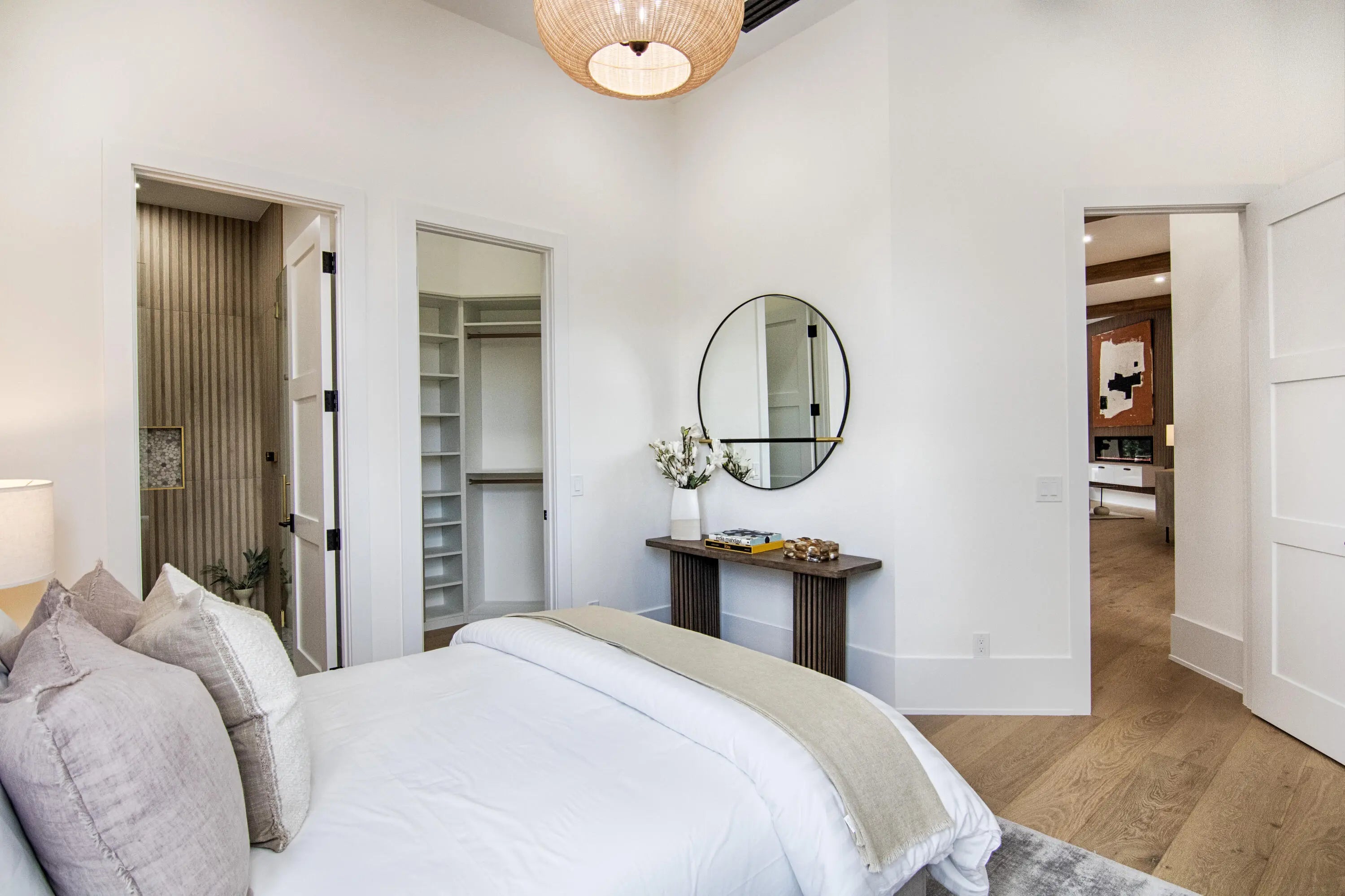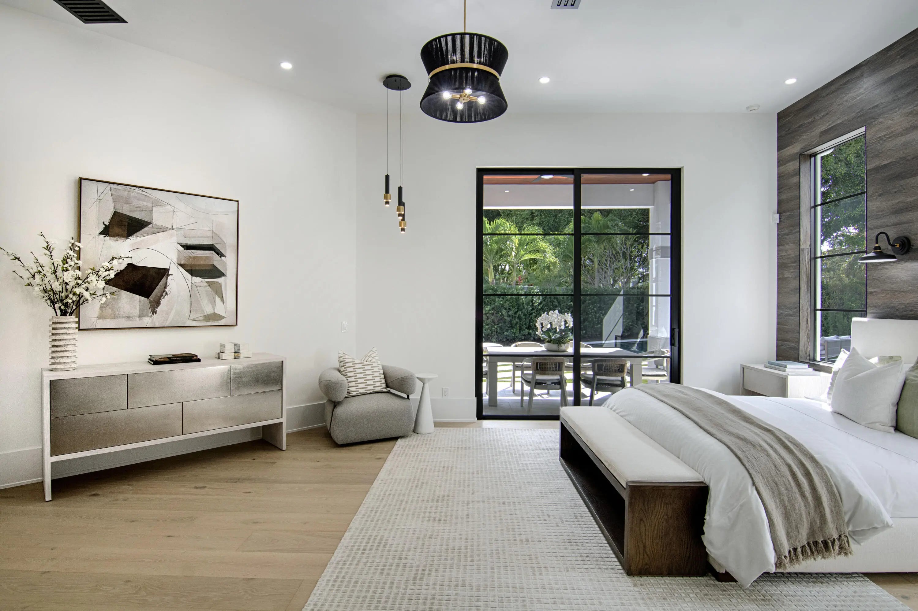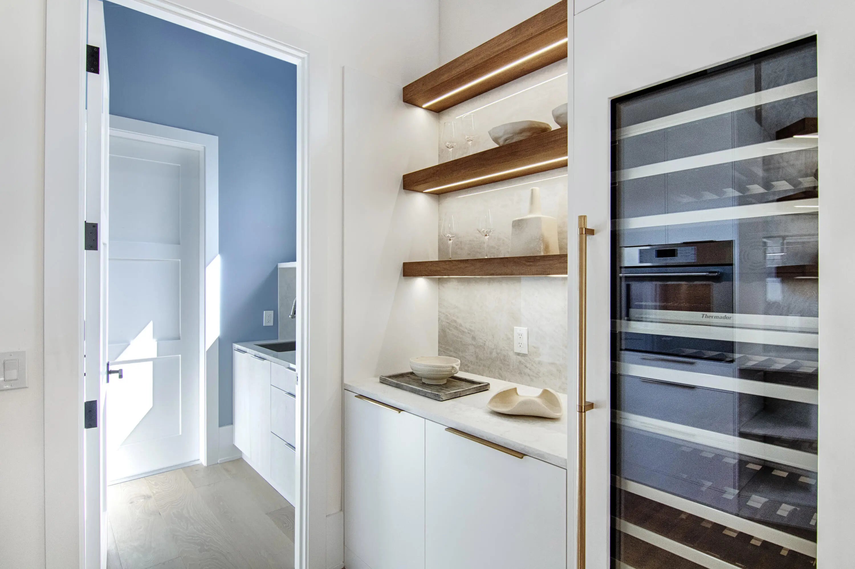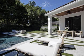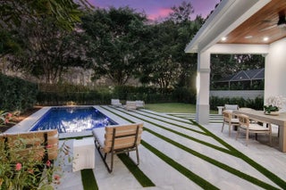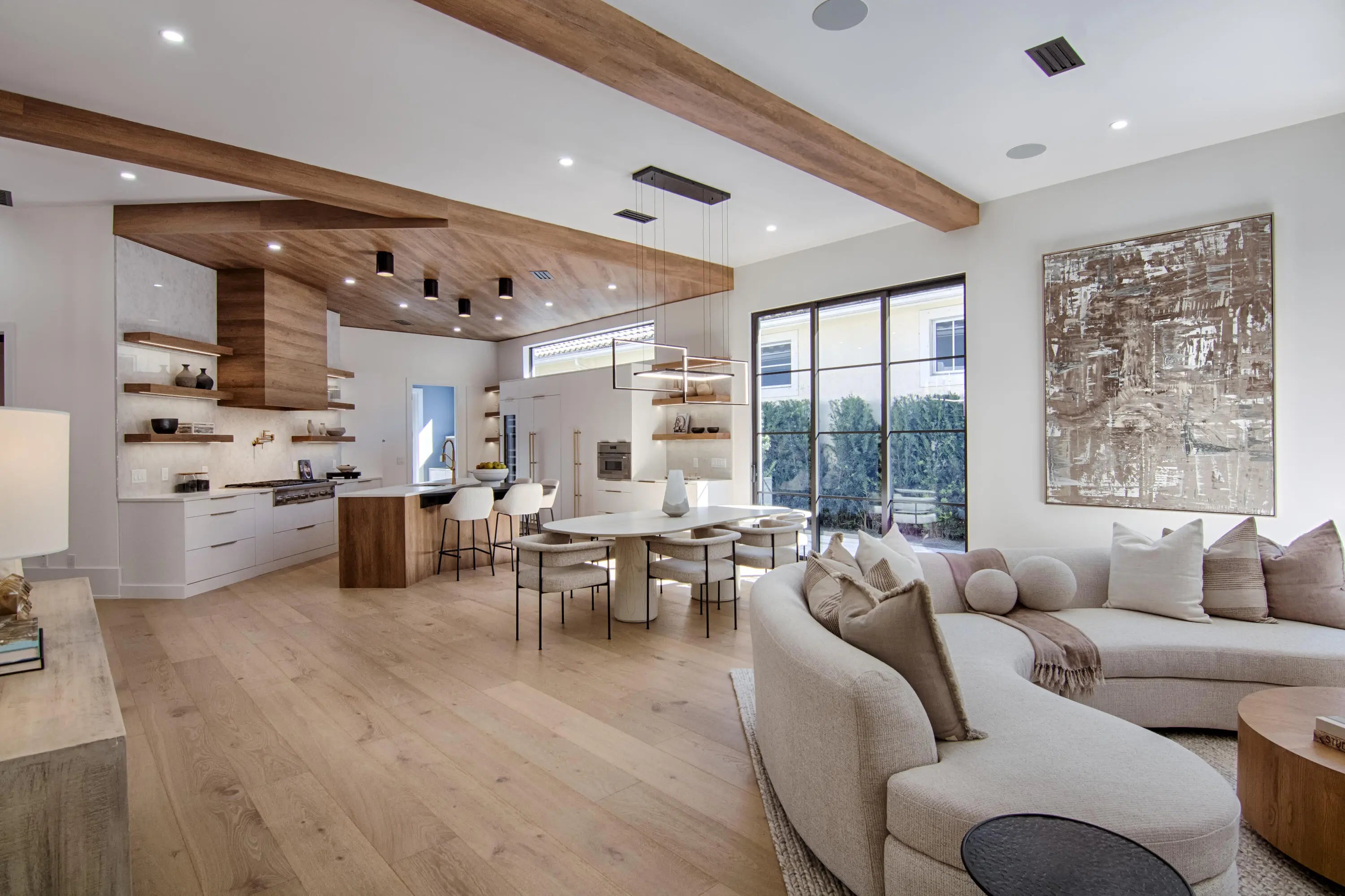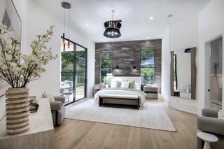 Step into this newly constructed residence that transcends the ordinary, a home where architectural artistry meets effortless livability. Every space has been curated with exquisite attention to detail, blending natural textures, timeless materials, and cutting -edge design. A show -stopping kitchen anchors the home with rich wood finishes, quartz countertops, & floating shelves framed against a soft porcelain back splash. The dramatic island with custom wood inlay invite both gathering and gourmet creation. Integrated professional grade appliances & statement lighting complete this sophisticated culinary space.