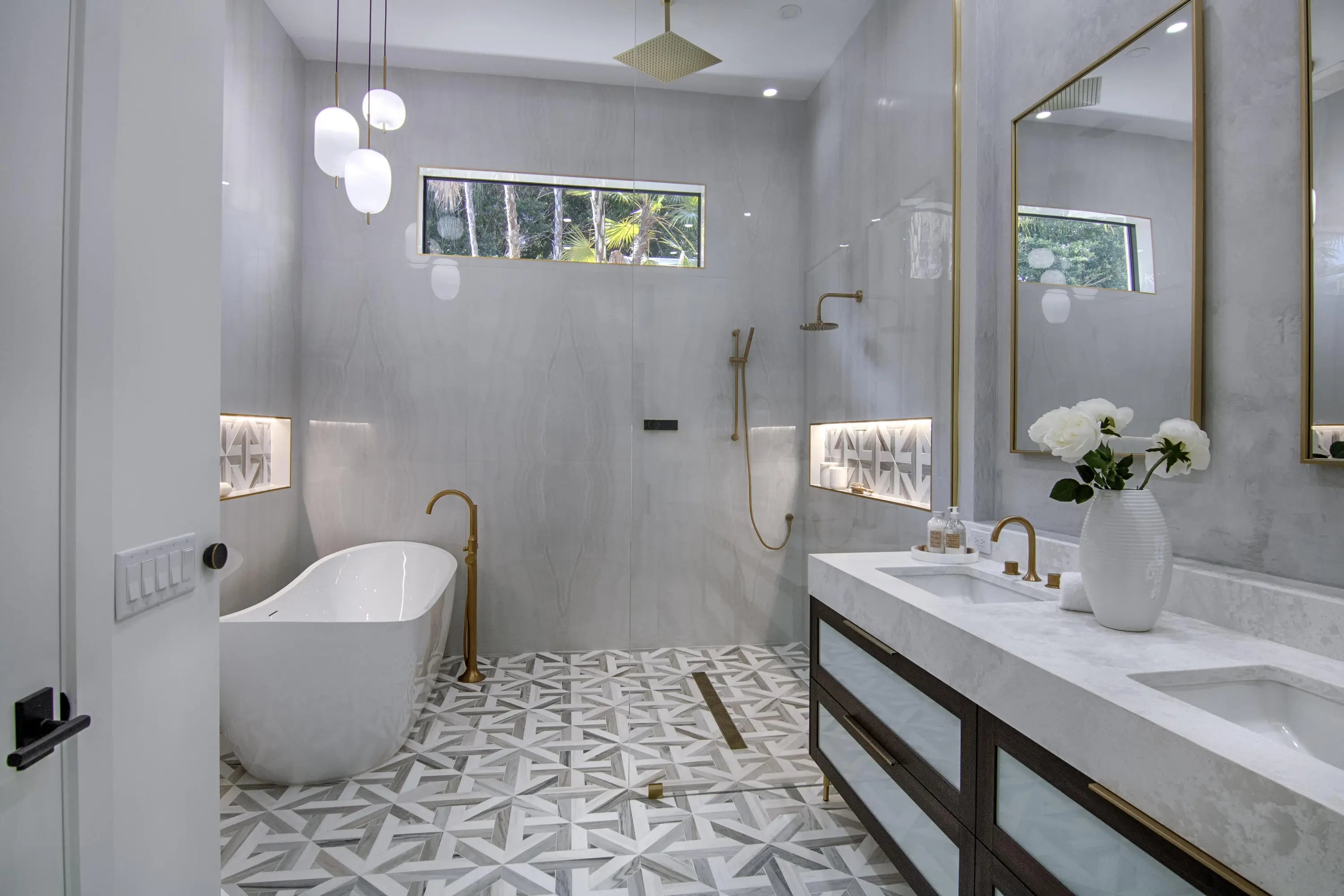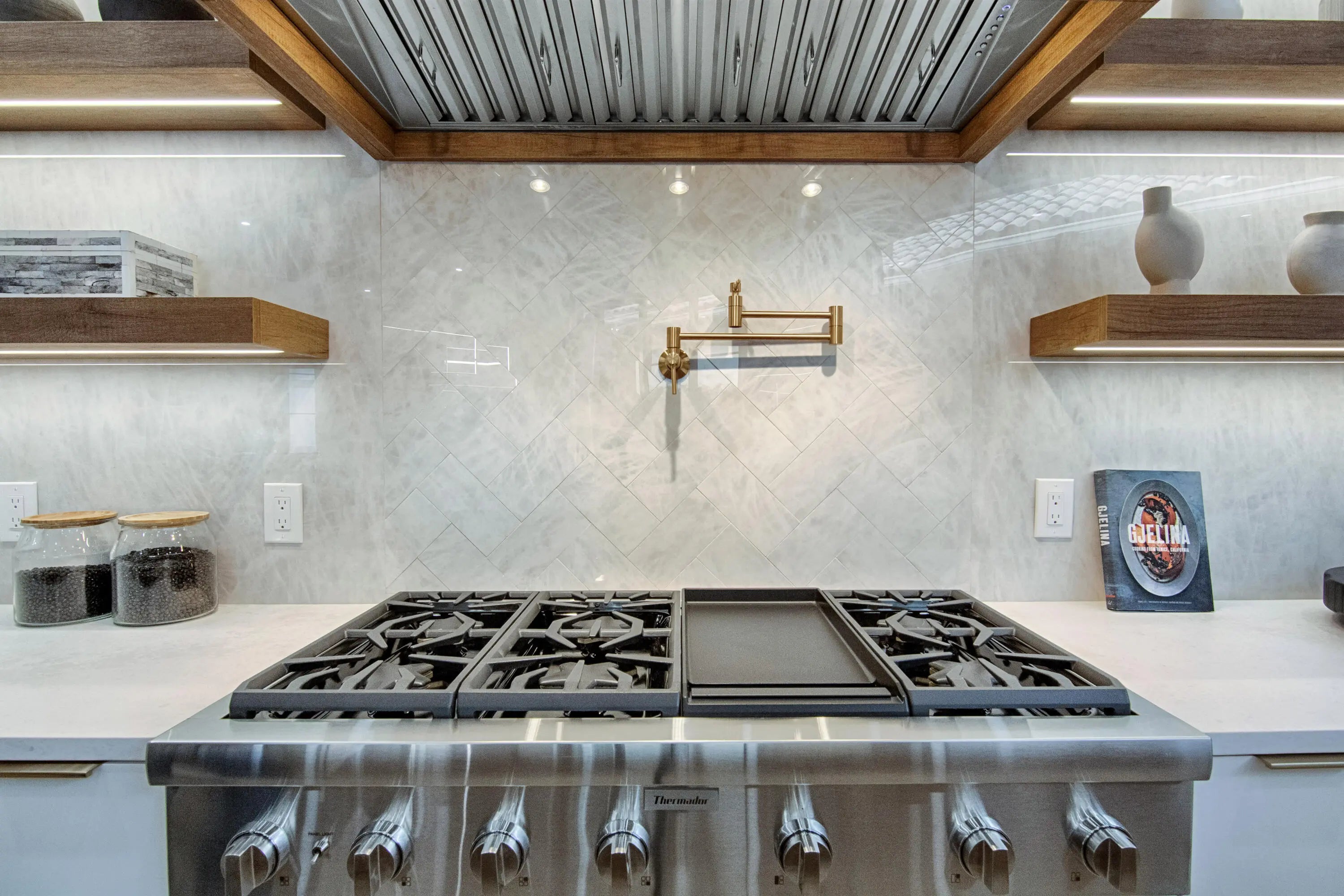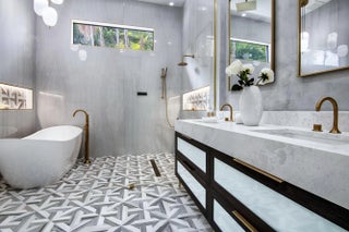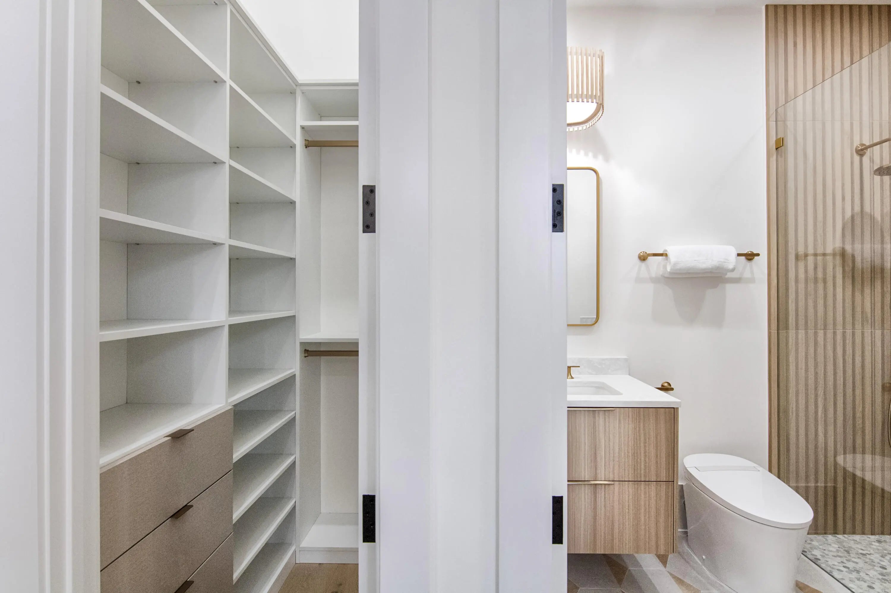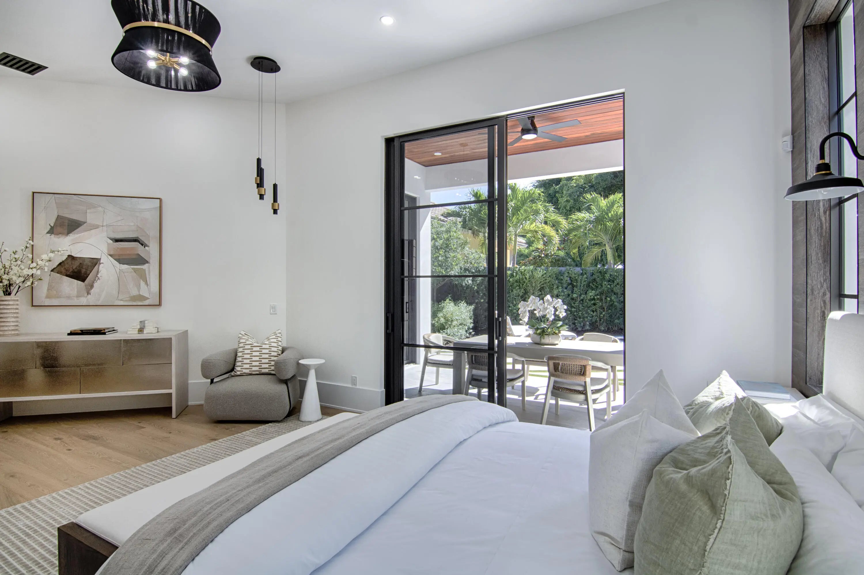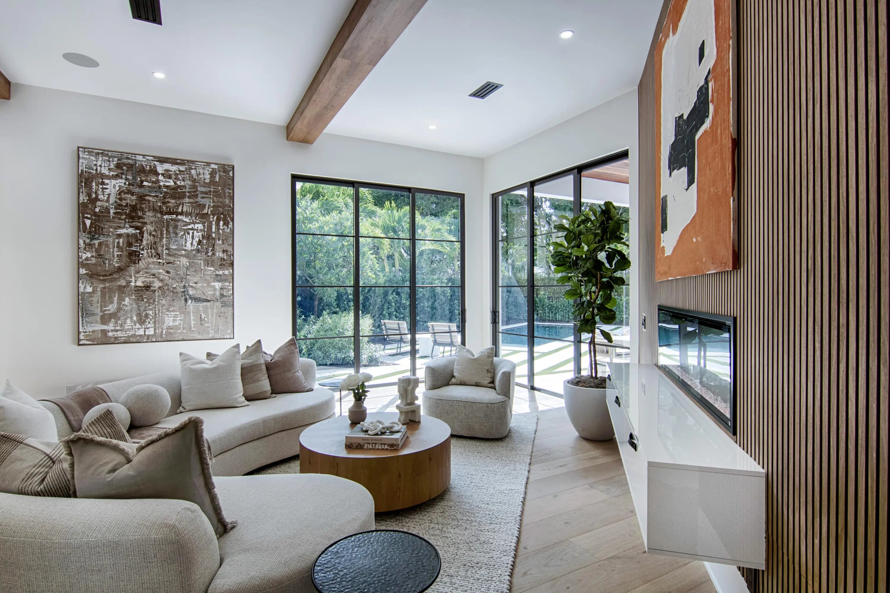 Step into this newly constructed residence that transcends the ordinary, a home where architectural artistry meets effortless livability. Every space has been curated with exquisite attention to detail, blending natural textures, timeless materials, and cutting -edge design. A show -stopping kitchen anchors the home with rich wood finishes, quartz countertops, & floating shelves framed against a soft porcelain back splash. The dramatic island with custom wood inlay invite both gathering and gourmet creation. Integrated professional grade appliances & statement lighting complete this sophisticated culinary space.