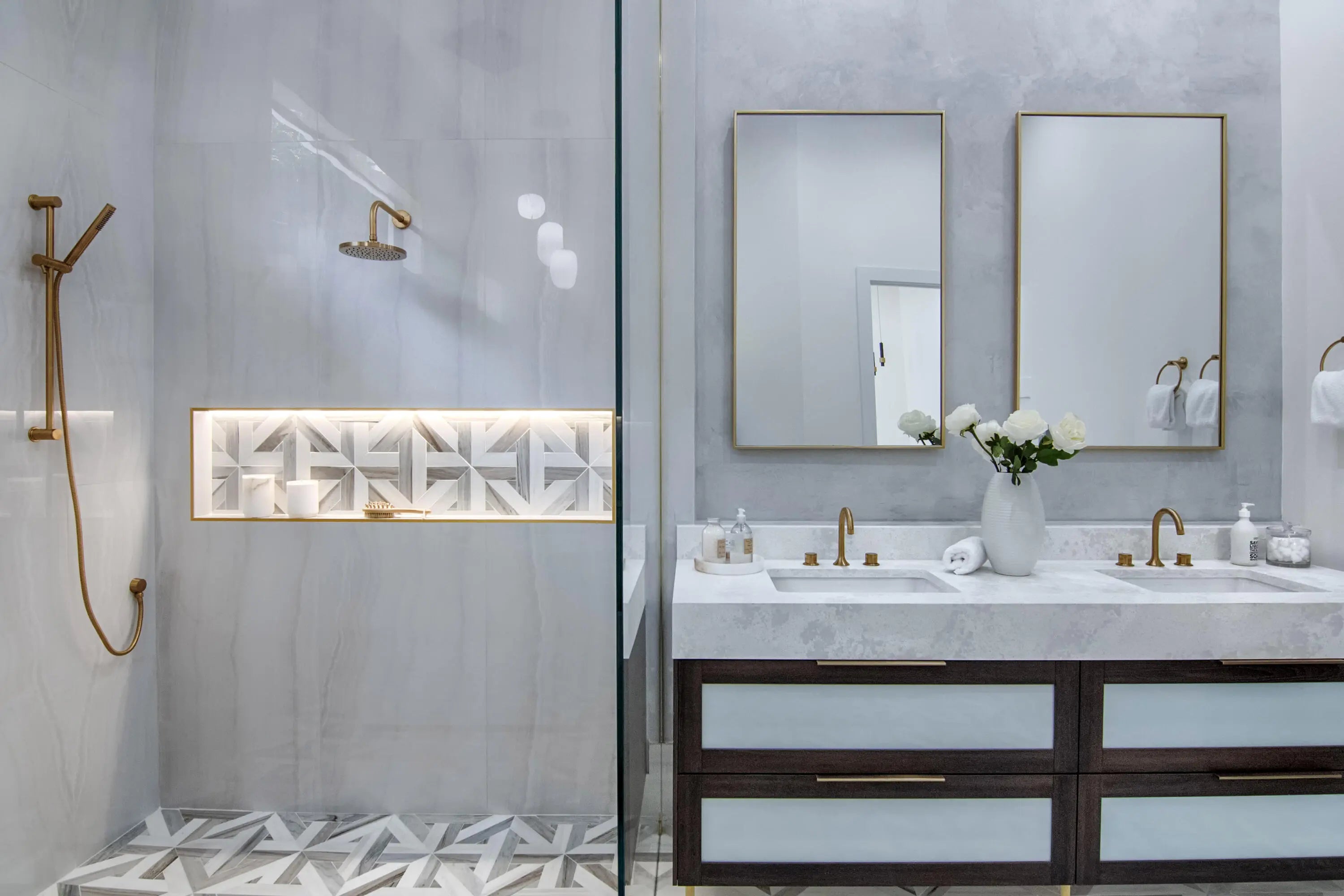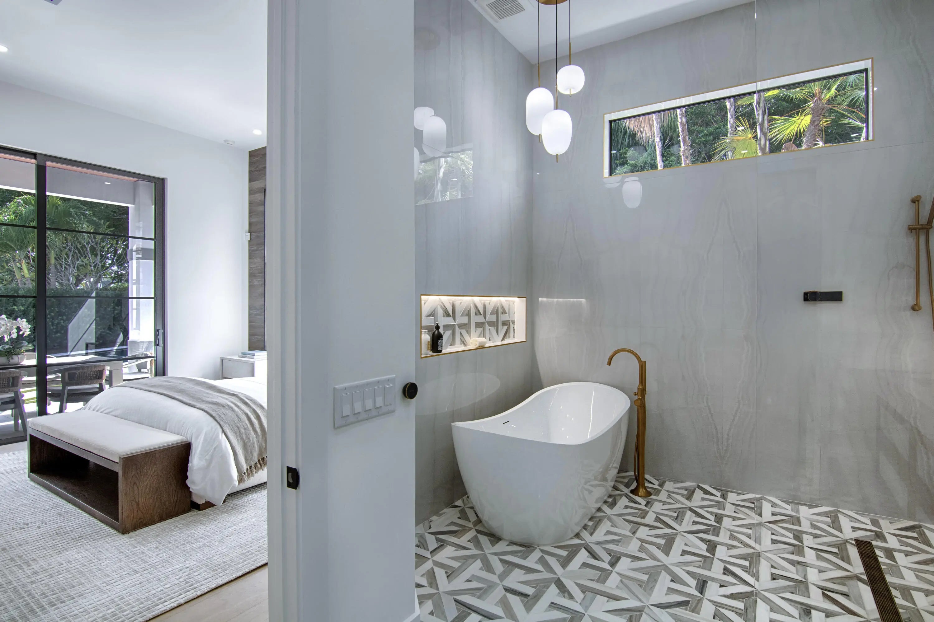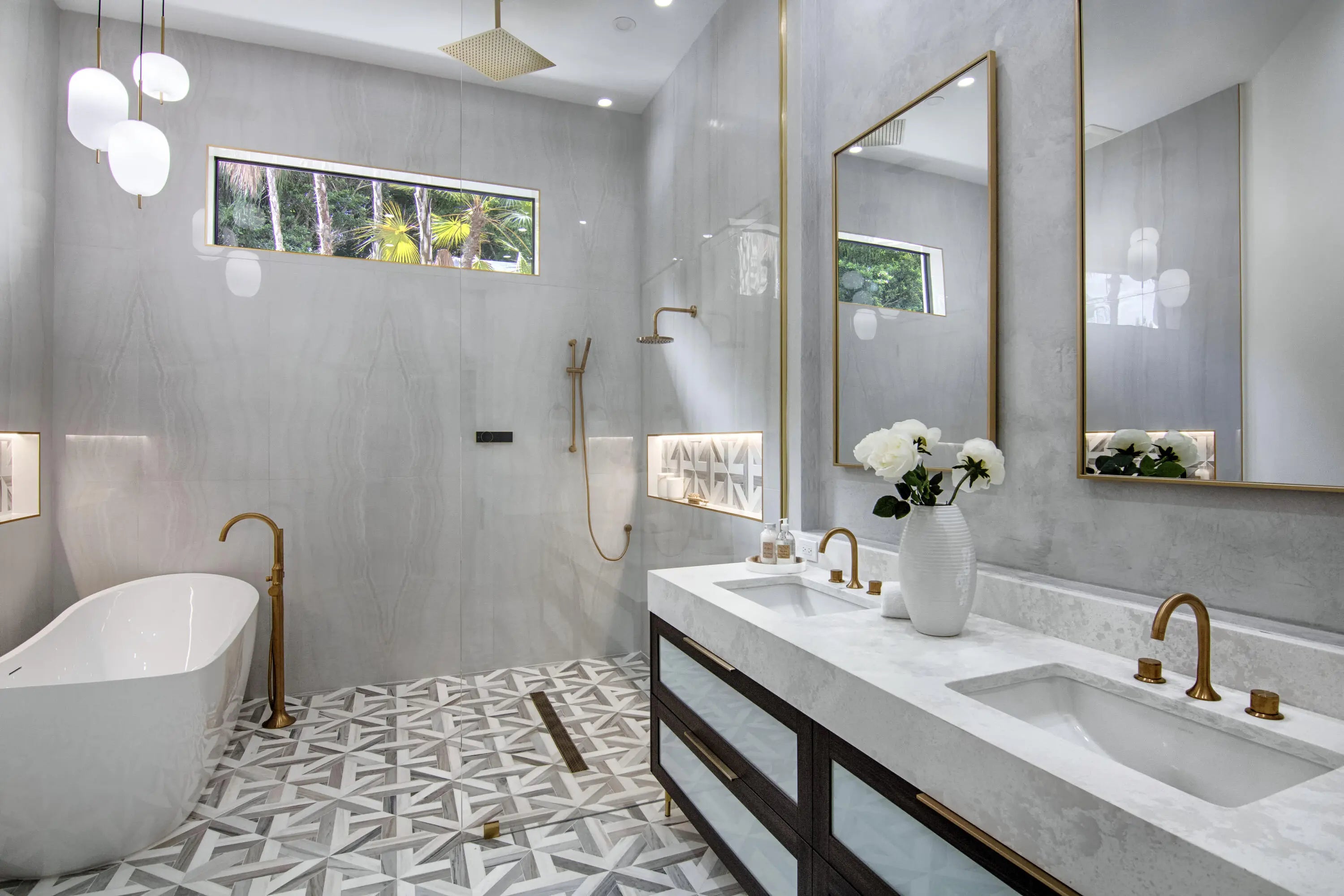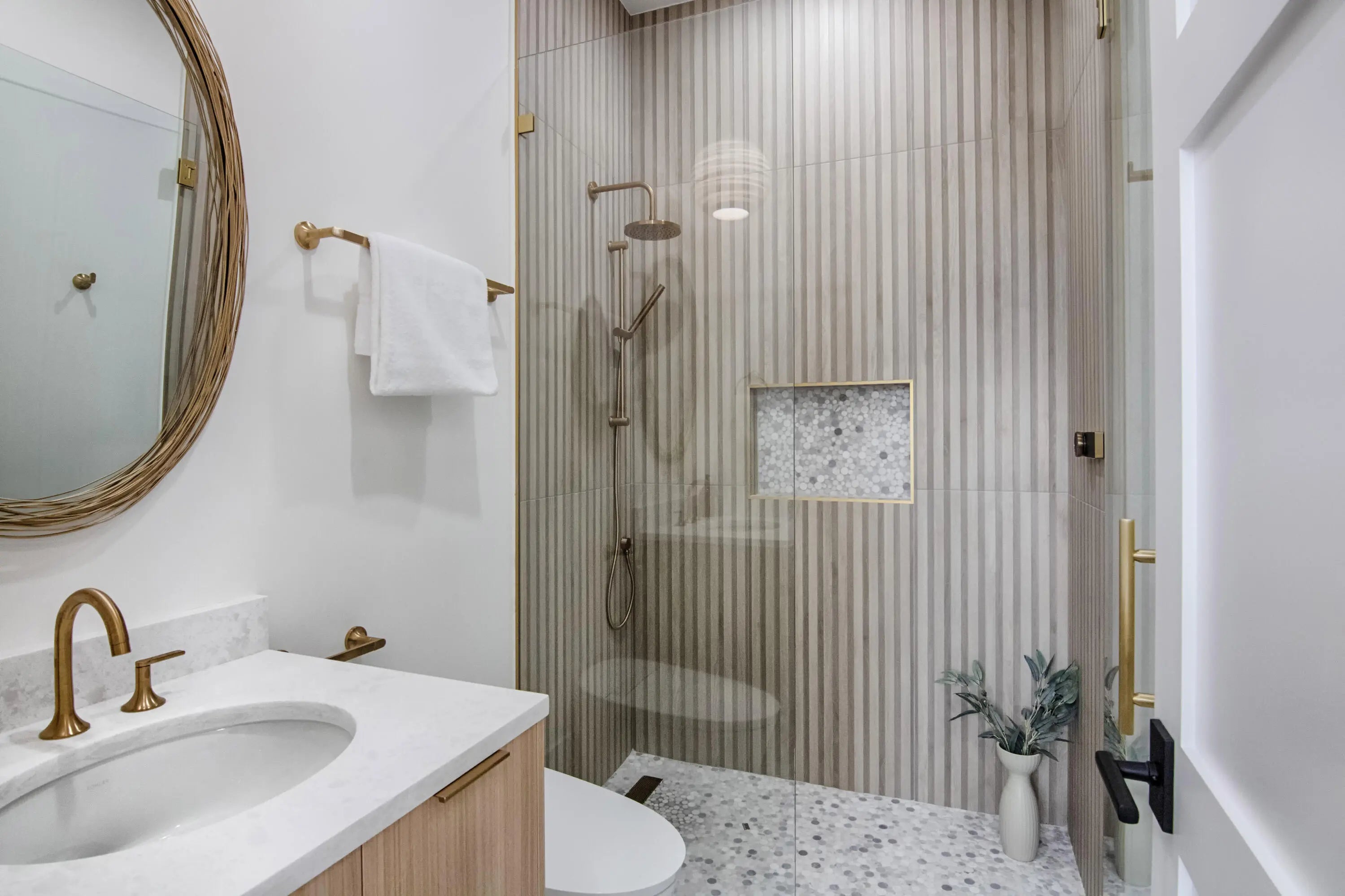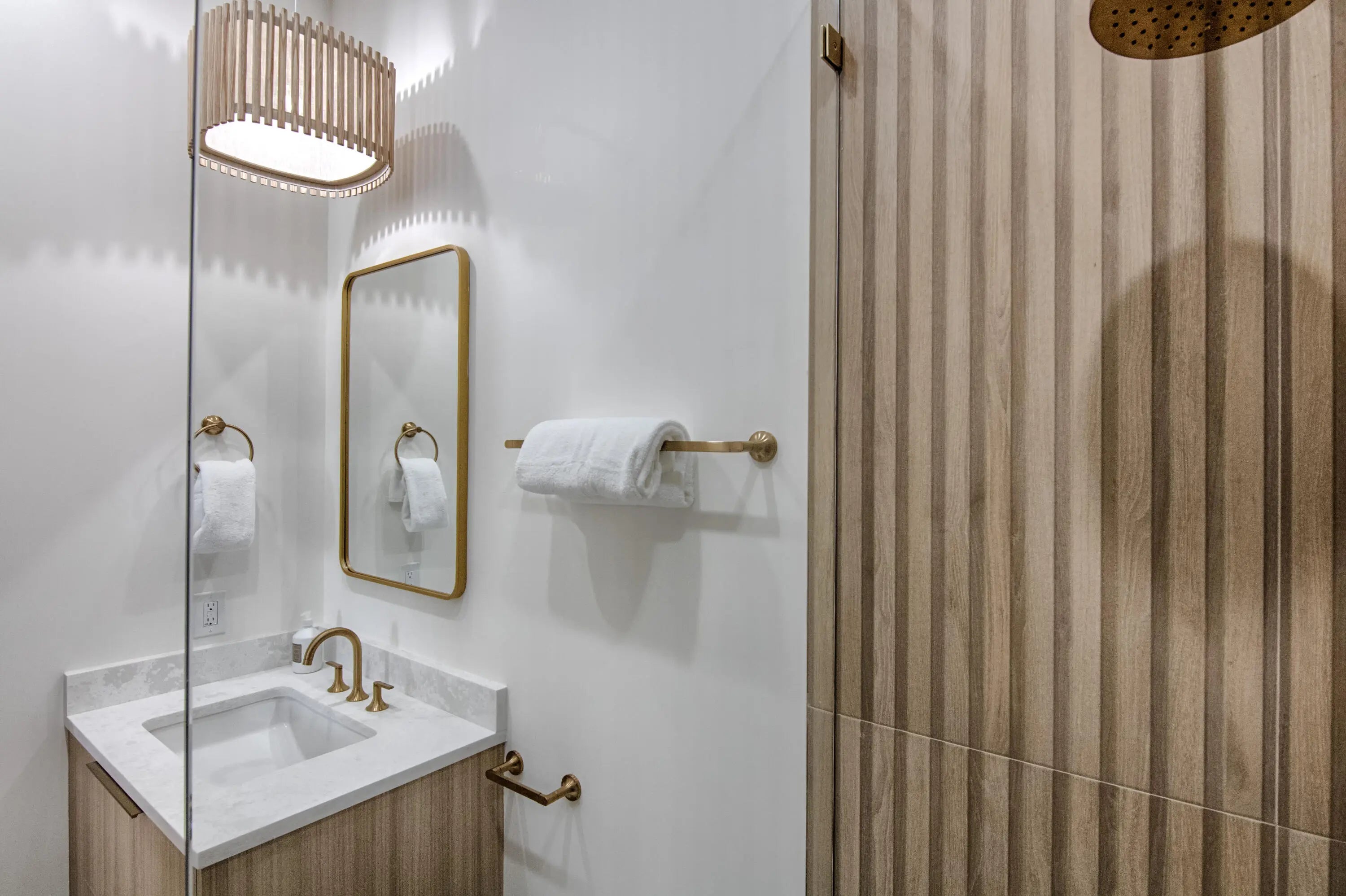 Step into this newly constructed residence that transcends the ordinary, a home where architectural artistry meets effortless livability. Every space has been curated with exquisite attention to detail, blending natural textures, timeless materials, and cutting -edge design. A show -stopping kitchen anchors the home with rich wood finishes, quartz countertops, & floating shelves framed against a soft porcelain back splash. The dramatic island with custom wood inlay invite both gathering and gourmet creation. Integrated professional grade appliances & statement lighting complete this sophisticated culinary space.
