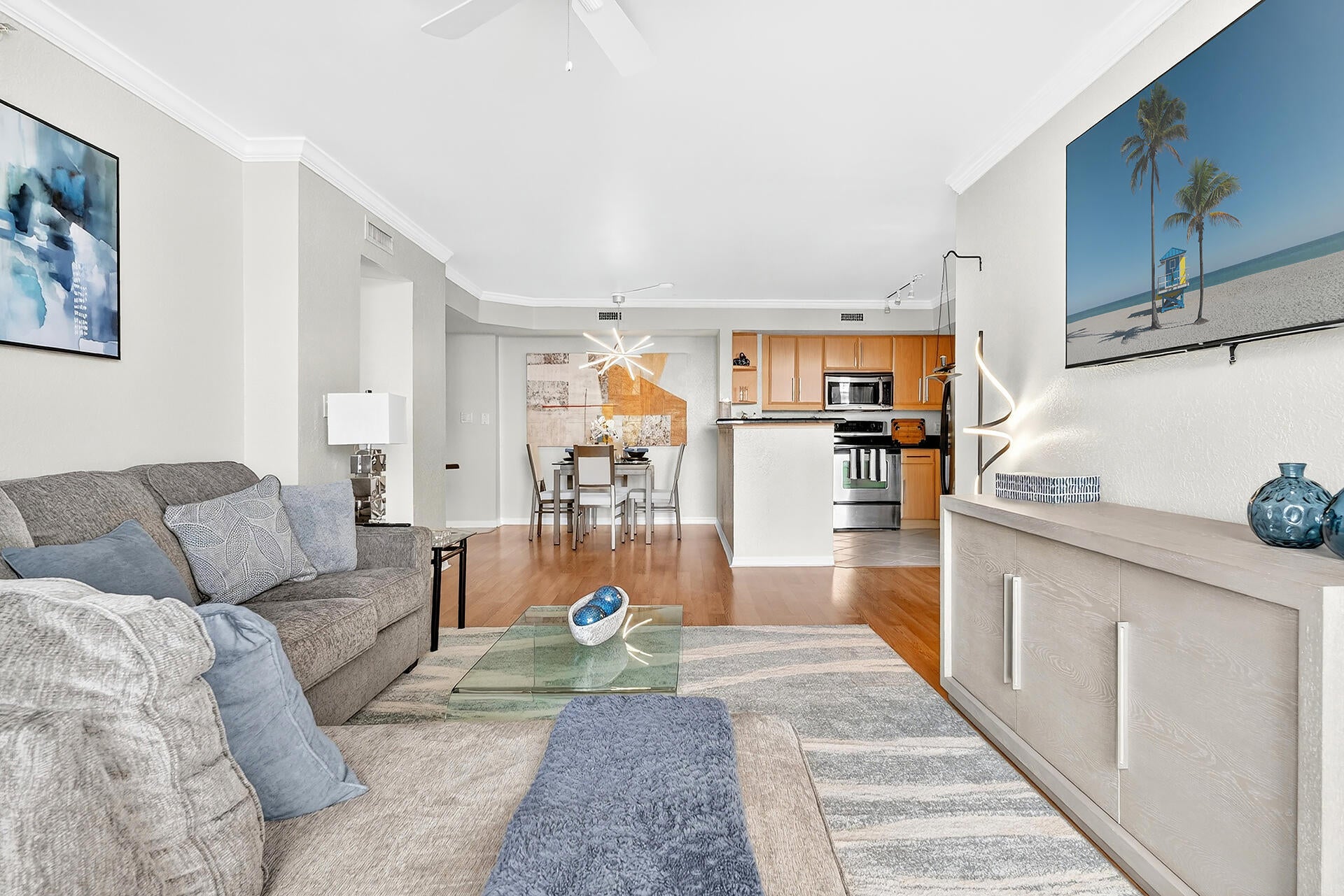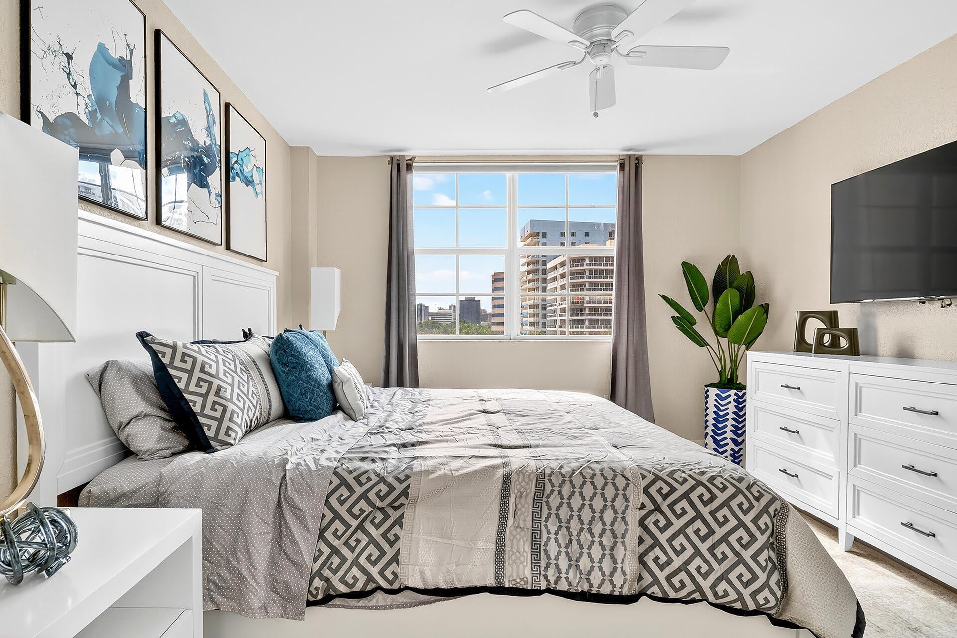 Beautiful two bedroom/ two bathroom Condo with fabulous water views. Available seasonal or annual. This gorgeous condo is newly furnished and fully stocked for a turnkey experience. The primary bedroom has a brand new king size bed & bedroom set including a brand new TV and a newly remodeled spa like bathroom. There is a 65 inch flatscreen TV on the newly remodeled/decorated living room. Just minutes from Palm Beach and city place. Seasonal rates are $6500 for 3 mo, $6000 per mo for 4 mo, $5500 for 5 mo & $5250 for 6 mo and no tax!