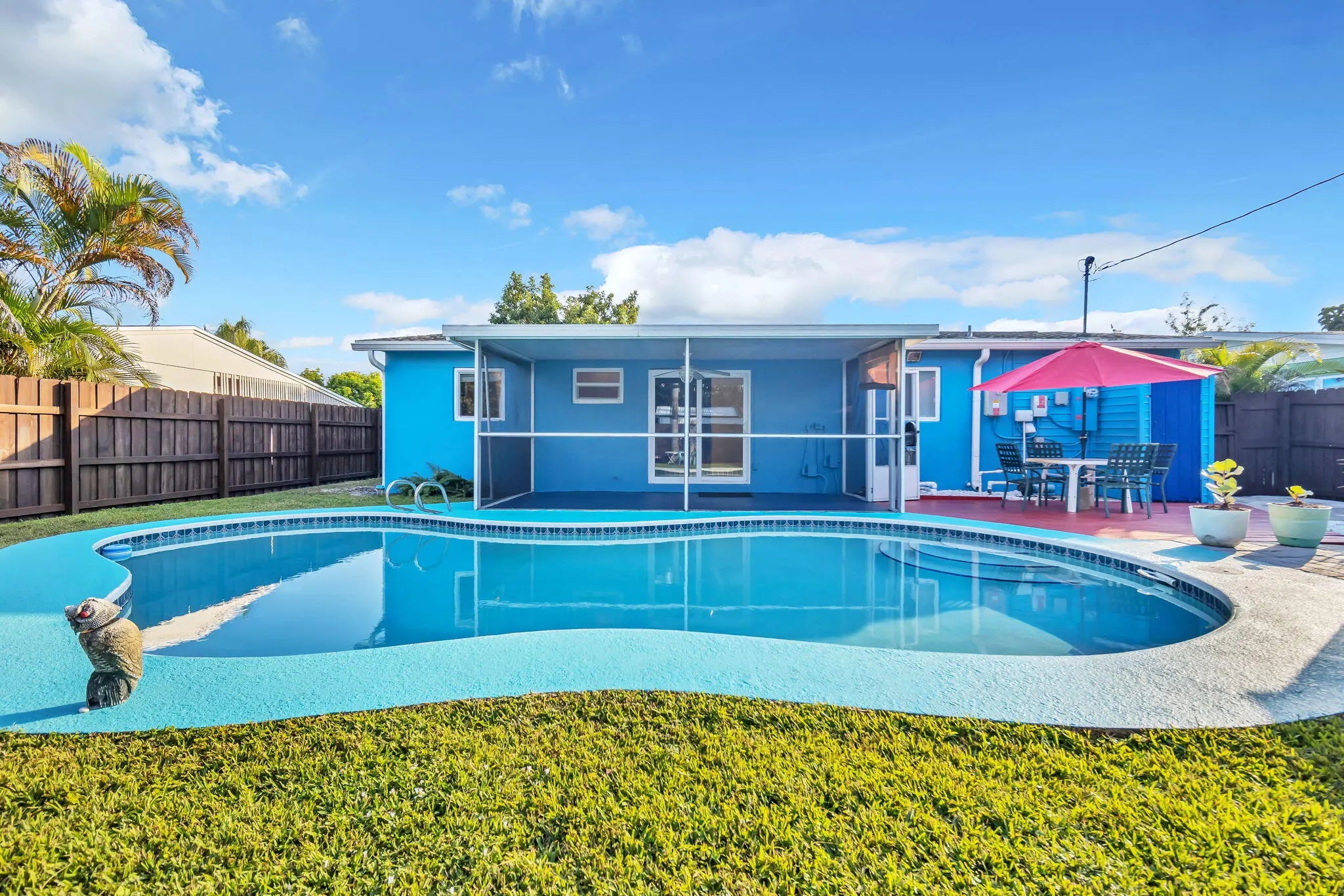 Welcome home to this inviting 3-bedroom, 2-bathroom pool property in the desirable Lake Worth Hills neighborhood. This home has been thoughtfully updated with a new roof (2021), upgraded hurricane impact windows, newer AC (2019), solar panels for energy efficiency, and refreshed fixtures and finishes throughout. Step outside to a private, fenced backyard oasis featuring lush, well-kept greenspace, fruit trees, a sparkling pool, and an open patio--plus a screened outdoor living area perfect for al fresco dining. A large storage shed adds extra convenience. Inside, the open kitchen offers custom cabinetry, newer appliances, and a bar-height counter ideal for entertaining. The primary suite includes an en-suite bath with a step-in shower. Washer & Dryer included!