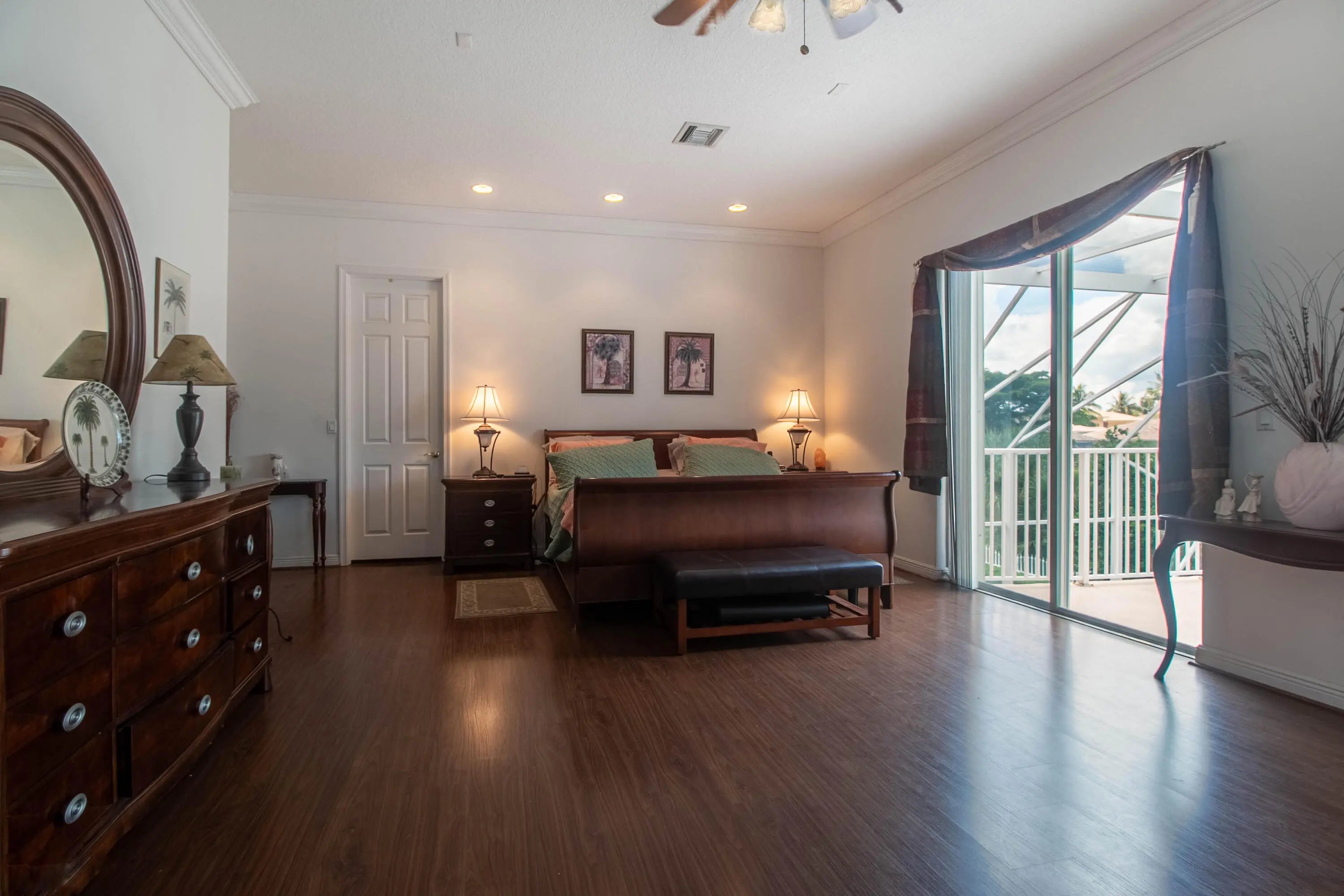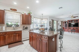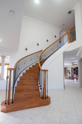 Roof 2025! Enter through double stain glass front doors to a soaring 2 story foyer & grand spiral staircase. This 4 bedrm 4 bath home also has formal living and dining room. The spacious family room has a triple slider out to the screened pool and patio. The large island kitchen has plenty of counter space, huge walk-in pantry, breakfast area, double oven and cooktop. There is 1 bedroom and full bath downstairs making it a great option for guests or in-laws. New flooring in the living and dining room. Stairs flooring also updated as well as the 2nd story bedrooms. Master suite boosts of a sitting area, den/office space, walk-in closet with custom shelving. There is a dressing area that leads into the double bathroom- 2 spacious vanities and sinks, 2 toilets! large walk thru