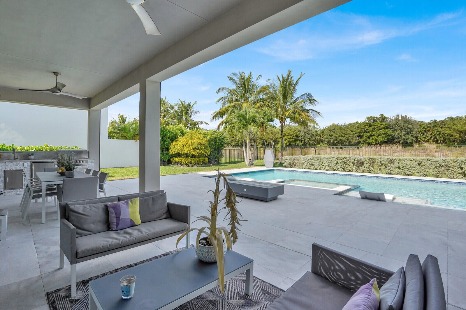 Auto Sprinkler, Built-in Grill, Covered Balcony, Covered Patio, Custom Lighting, Fence, Open Patio, Screened Patio, Summer Kitchen, Zoned Sprinkler