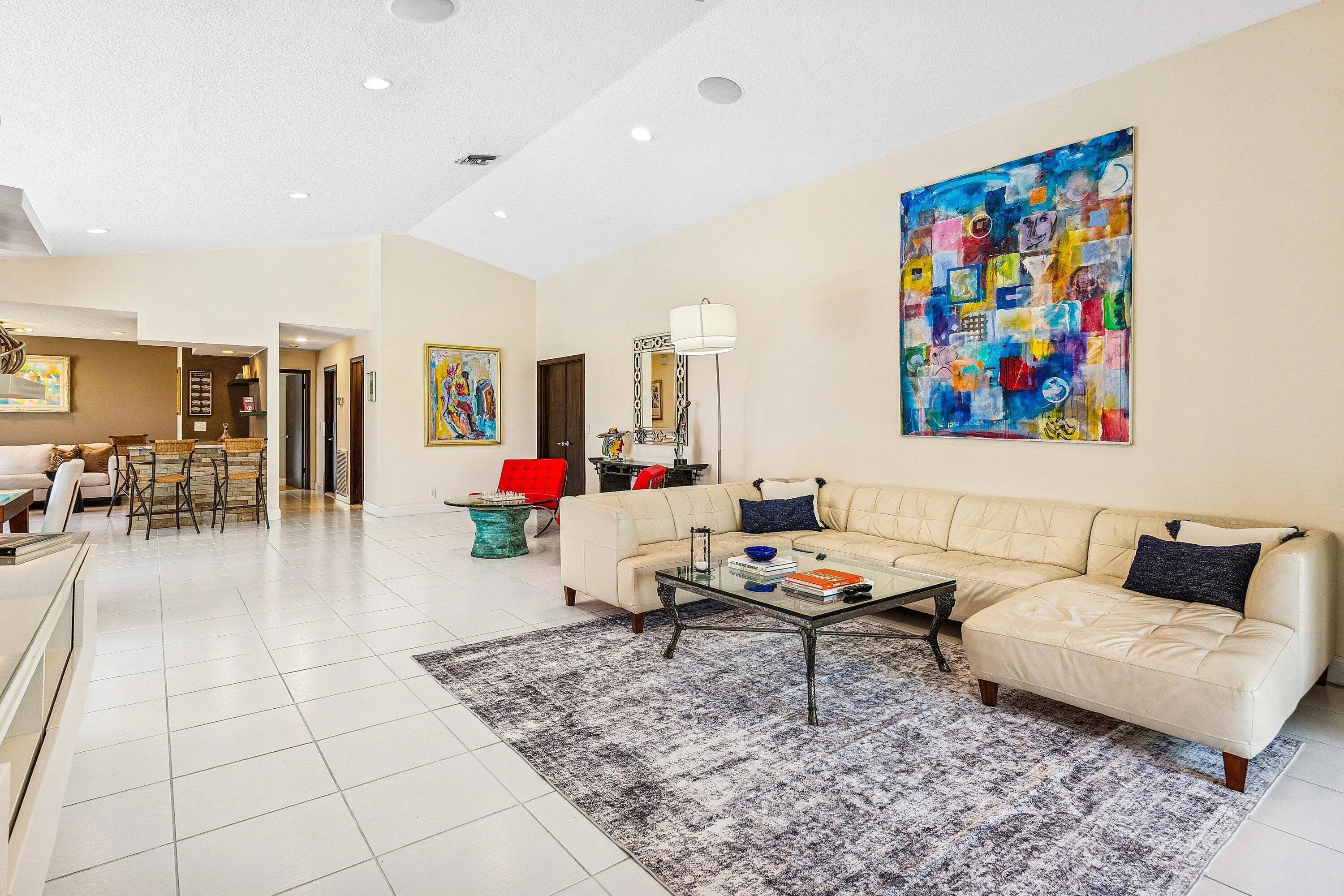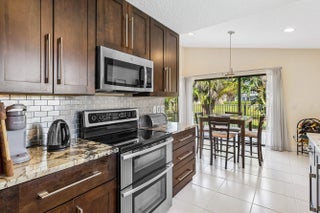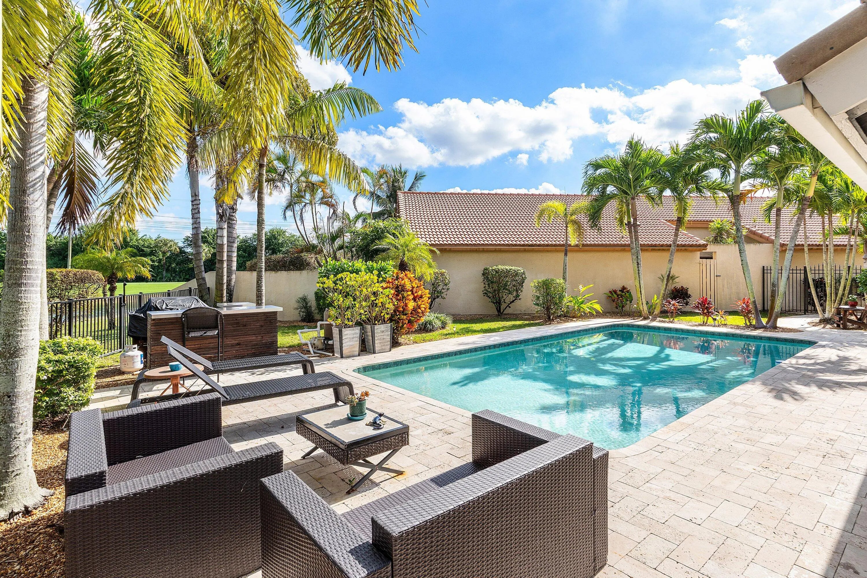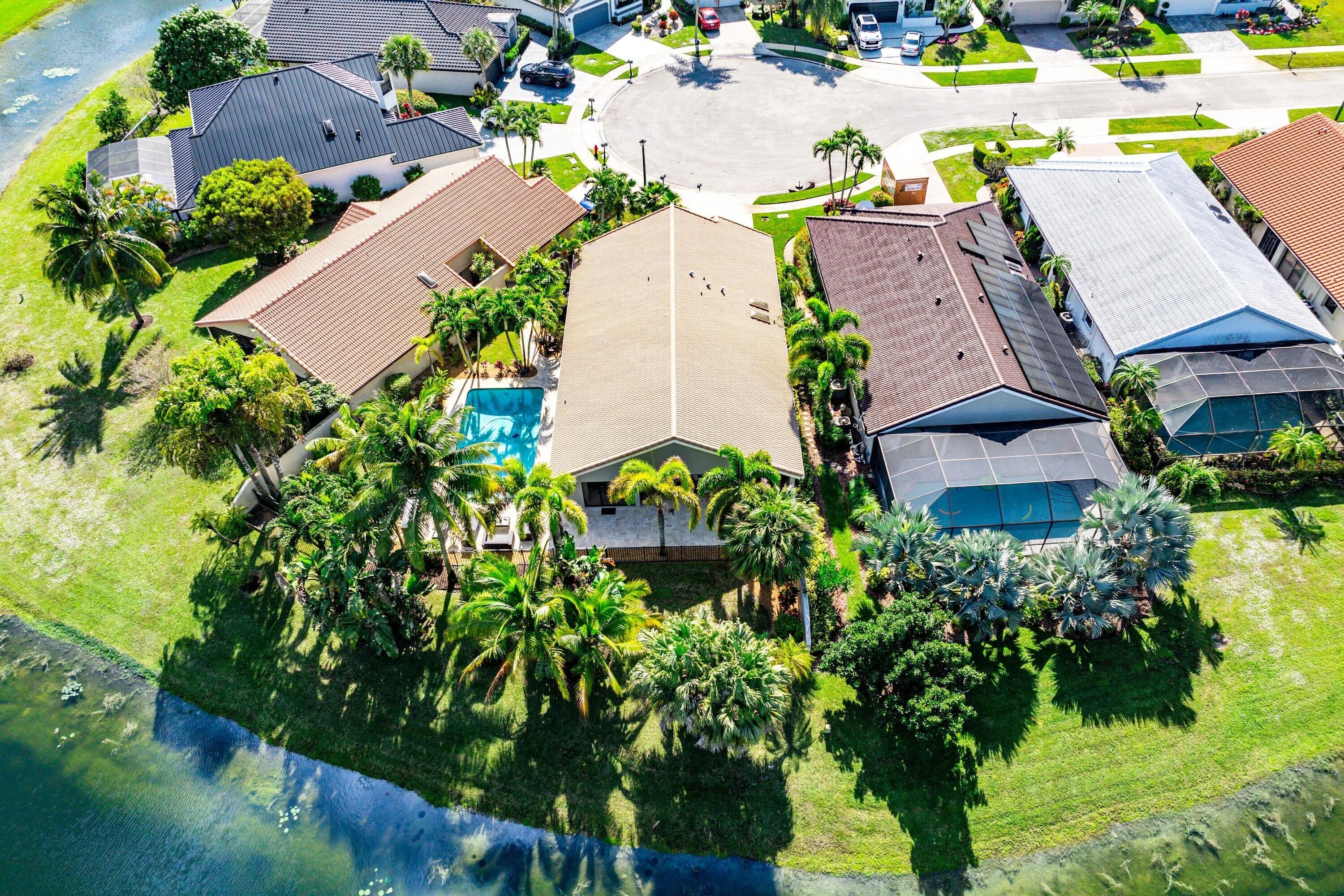 Rare opportunity to own one of the prime patio lots in Boca Woods, approximately 30% larger than most Patio homes located on the premier point of the cul-de-sac. The den is easily converted to a 3rd bedroom. This unique property features a fenced, resort-style backyard with lush landscape and beautiful palms, offering complete privacy and a true tropical escape. Enjoy expansive lake views and watch them Tee off on partial golf views.Boca Woods boasts one of the best hole-to-home ratios for golfers, providing easy access and exceptional playability. There is NO WAITING list for golf! ''The Woods'' course was recently redesigned by Rees Jones, and ''The Lakes'' course is equally beautiful--challenging or forgiving, depending on how you choose to play it.