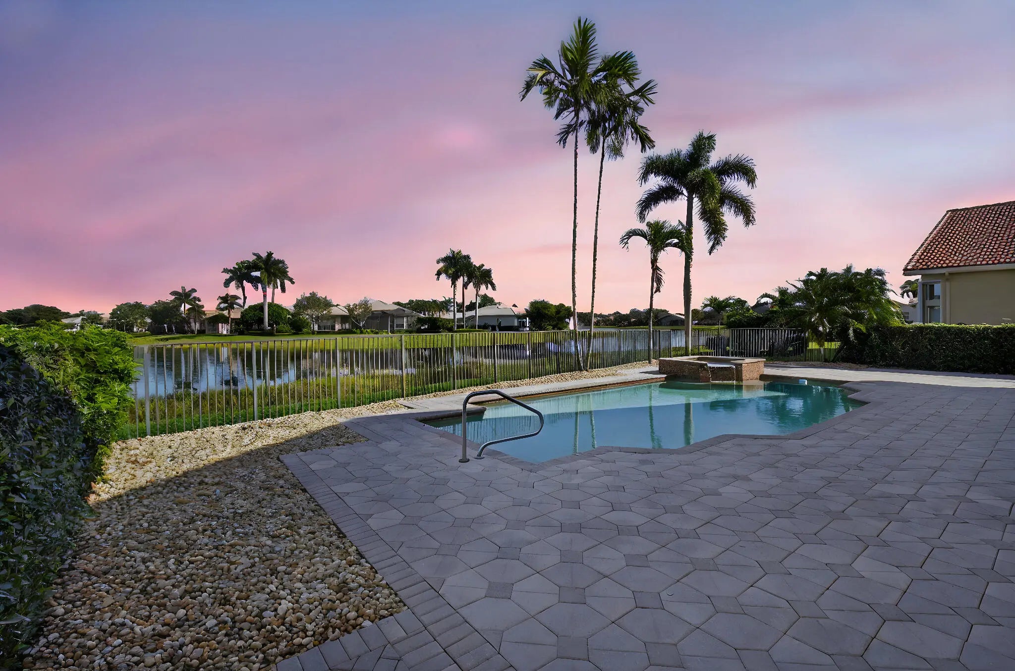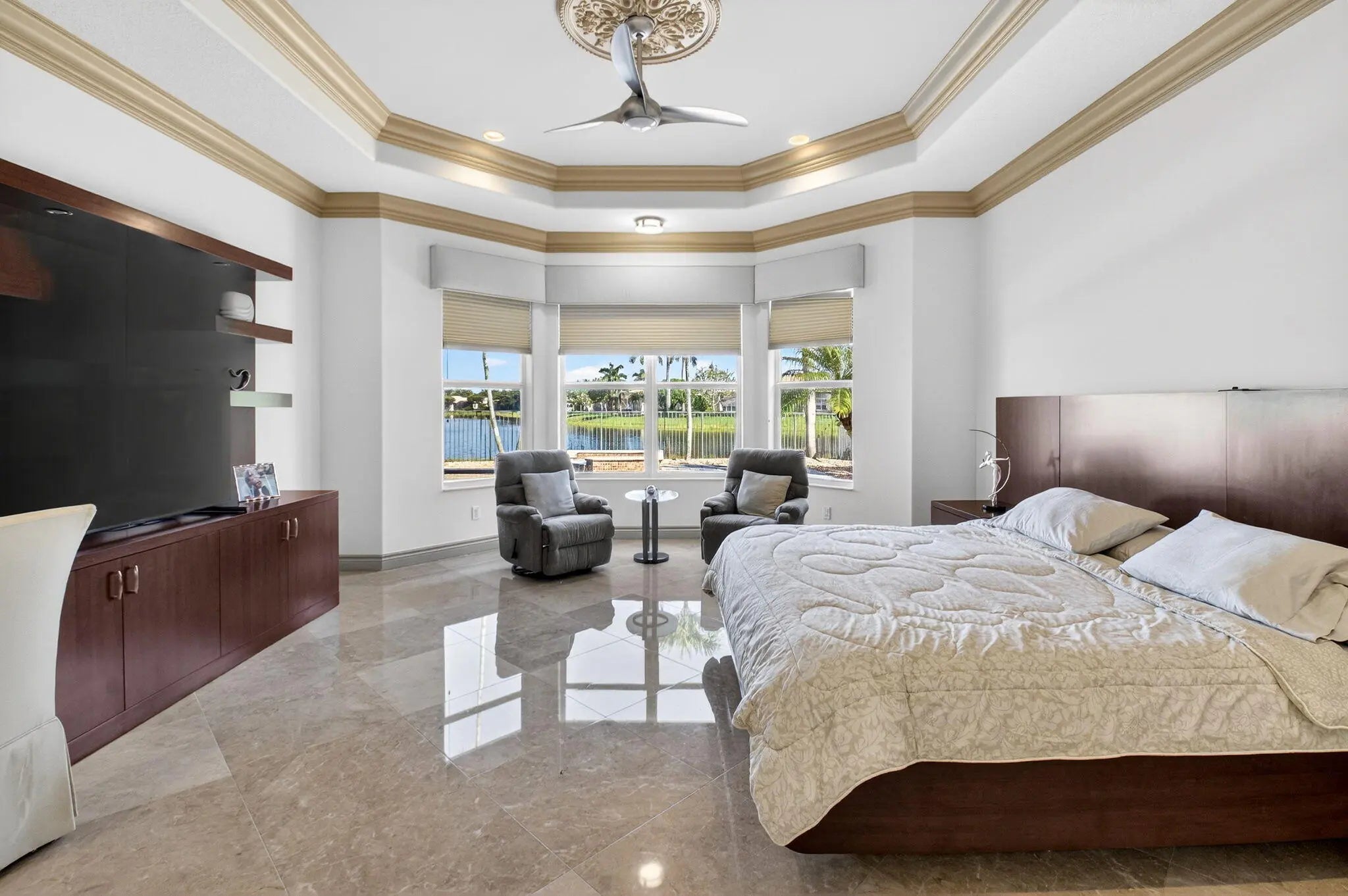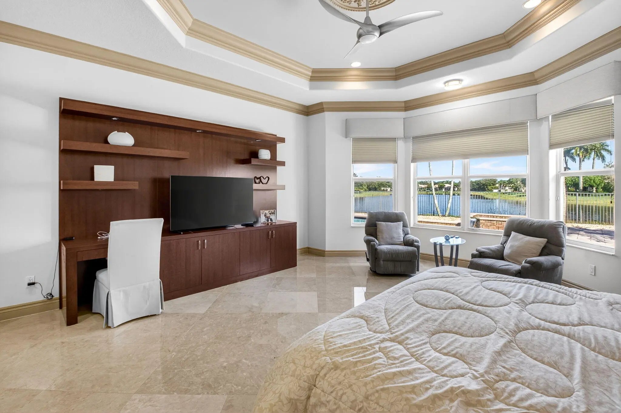 SPECTACULAR VIEWS FROM THIS STUNNING AND DESIRABLE PAMPLONA MODEL ON THE GRAND LAKE WITH POOL, SPA & SCREENED IN PATIO. ENTER THIS LOVELY HOME THROUGH A GATED COURTYARD TO THE DOUBLE DOORS THAT OPEN TO A BEAUTIFUL FOYER WITH MARBLE FLOORS THAT FLOW TO THE ENDLESS LAKE VIEWS. GREAT ROOM OPEN CONCEPT WITH DOUBLE TRAY CEILING AND MOLDING, RECESSED LIGHTING, TRANSOM WINDOW & LARGE SLIDER DOORS THAT OPEN TO THE ENCLOSED LANAI. THE OVERSIZED KITCHEN ADJOINS A NOOK AREA & FORMAL DINING. THE KITCHEN HAS WOOD CABINETS W/ PULL OUTS, SS APPLIANCES, GRANITE COUNTERS, RECESSED LIGHTS & UNDER MOUNT CABINET LIGHTING. TONS OF STORAGE! ENJOY BREAKFAST W/ SPECTACULAR LONG LAKE VIEWS. PRIMARY BEDROOM SUITE HAS 2 HUGE WALK-IN FITTED CLOSETS. PRIMARY BATH RETREAT W/ A SOAKING TUB AND SPACIOUS SHOWER. MORE..