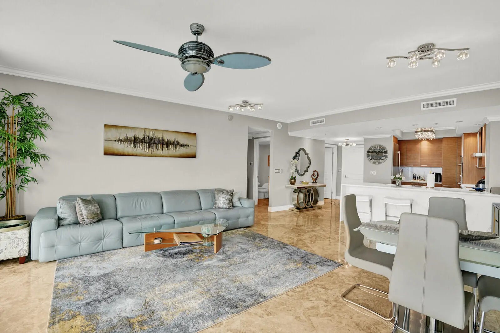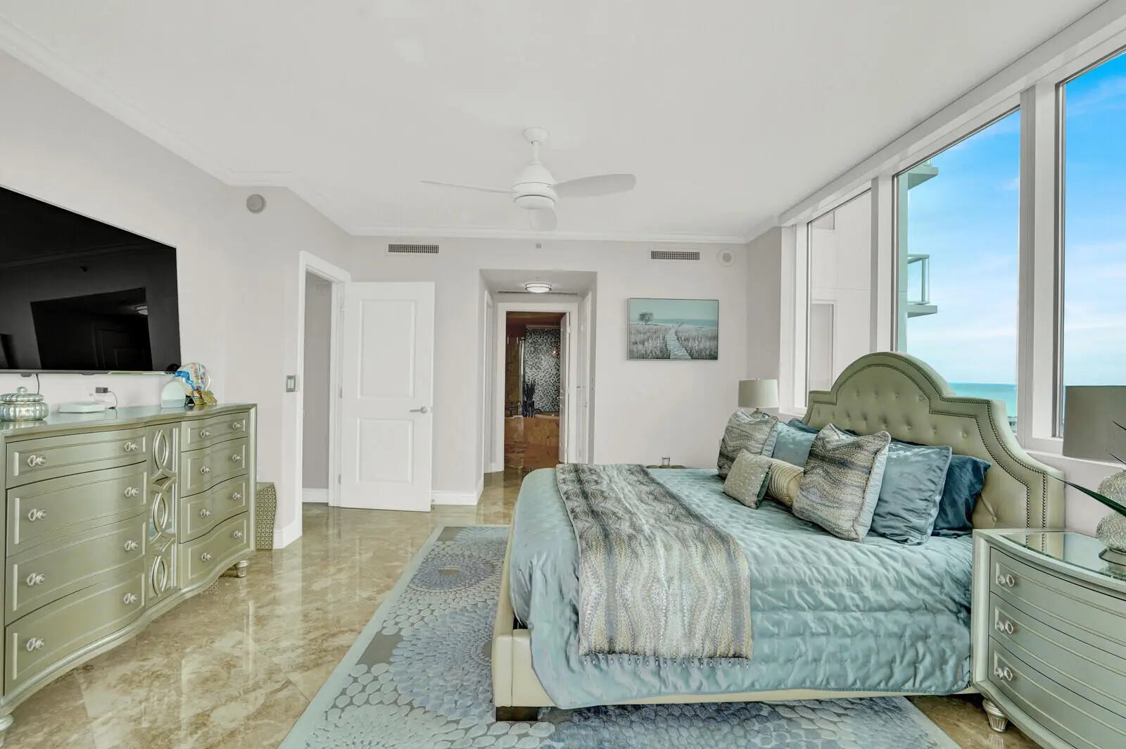 Welcome to The Plaza at Oceanside! Spectacular sun-drenched highly sought-after southwest corner sky residence ''14'' line with panoramic ocean, intracoastal, city, sunset and skyline views. Beautiful high-end new finishes and renovations thru-out : complete new porcelain flooring incl. on huge terrace, new waterfall quartz counters and backsplash, all new Thermador appliances, new designer lighting, plus many more. World-class amenities include a HUGE resort-style pool, 2 championship tennis courts, ocean-view state-of-the-art fitness center with his/hers sauna and spa, complementary breakfast served at the News Cafe, ocean-view social room and wine lounge, billiards room, golf simulator and more..