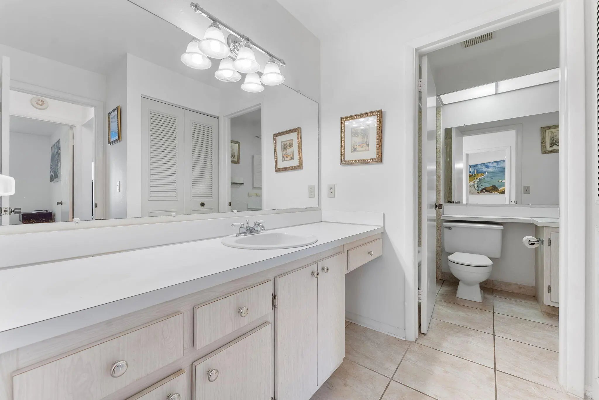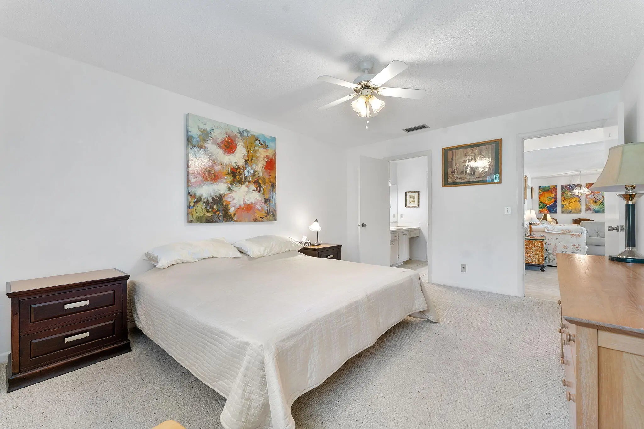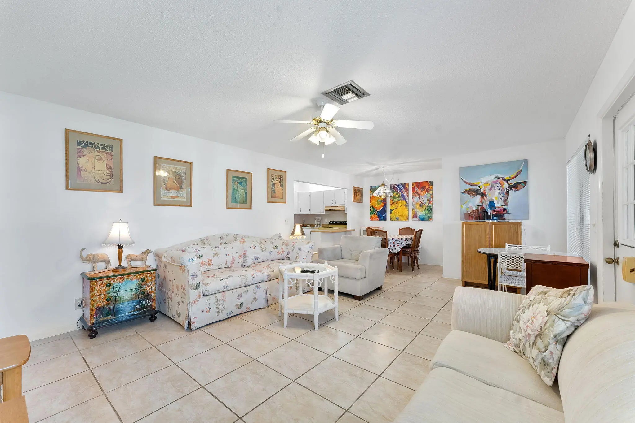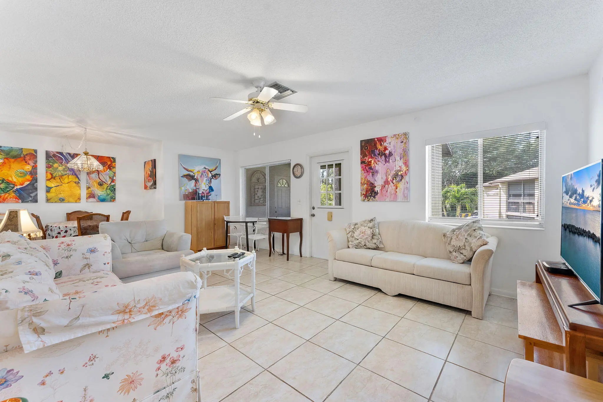 Welcome to this charming 2-bedroom, 1-bathroom condo offering a blend of comfort and potential. The open-concept living and dining area features cool tile flooring and an abundance of natural light, creating a welcoming space for entertaining. The kitchen is equipped with a stainless steel refrigerator, white cabinetry, and a convenient breakfast bar for casual dining.Retreat to the spacious primary suite, with a ceiling fan, and a private vanity area with ample lighting. A generously sized second bedroom provides flexibility for guests or a home office. Step out to the enclosed Florida room, a versatile tiled space perfect for relaxing year-round. With ample closet storage and a functional layout, this home is ready for your personal touch.