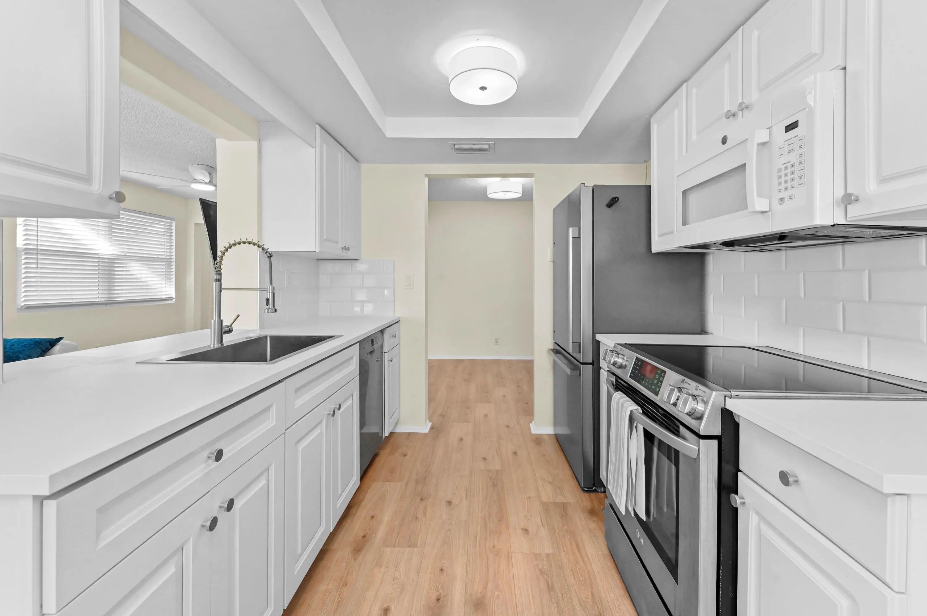 This move-in ready, newly renovated and spacious three bedroom, two bath home has wonderful surprises at every turn. There is 1800-square feet of gracious living, including new flooring throughout, as well as a completely updated galley style kitchen with bonus prep space, new wood laminate floors throughout, new A/C & tankless water heater, and new lighting and ceiling fans. Laundry room includes a full size washer and dryer, storage space and a folding station. The two primary bedrooms each have oversized closets and en-suite bathrooms with new tile, vanities, and walk-in showers. With the extra third bedroom and bonus family room this is the perfect home for entertaining and hosting family and friends.