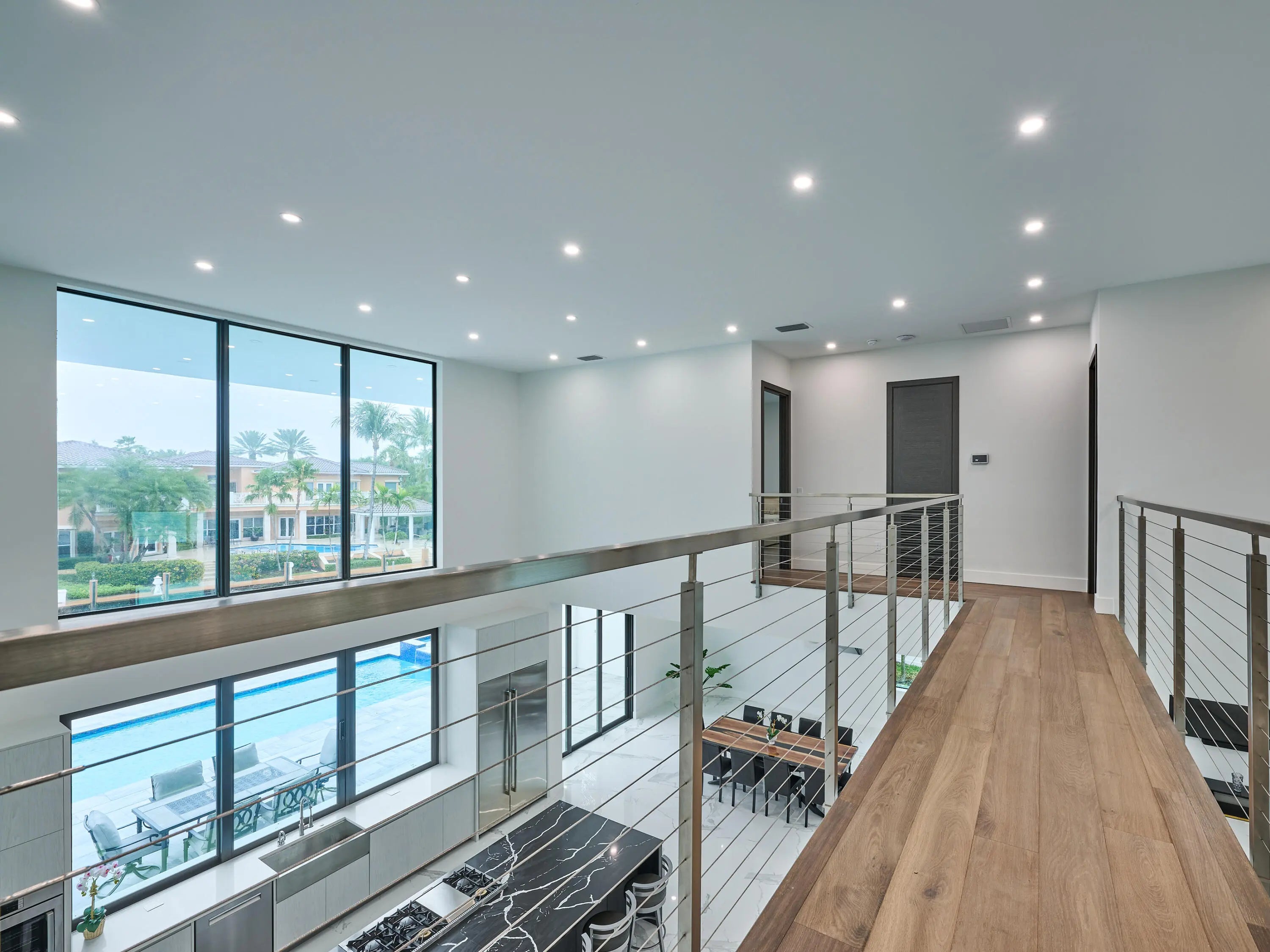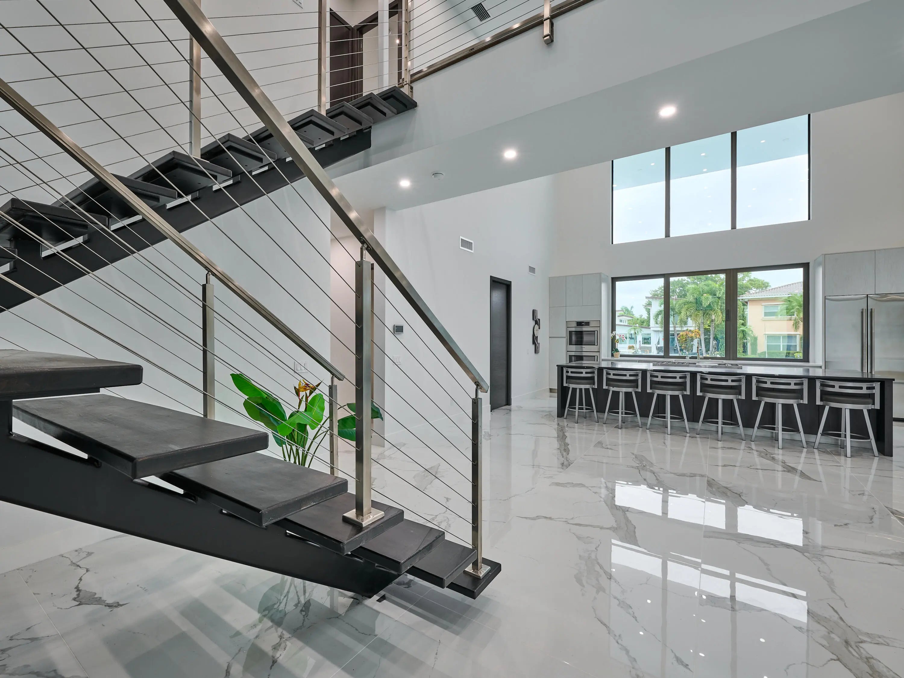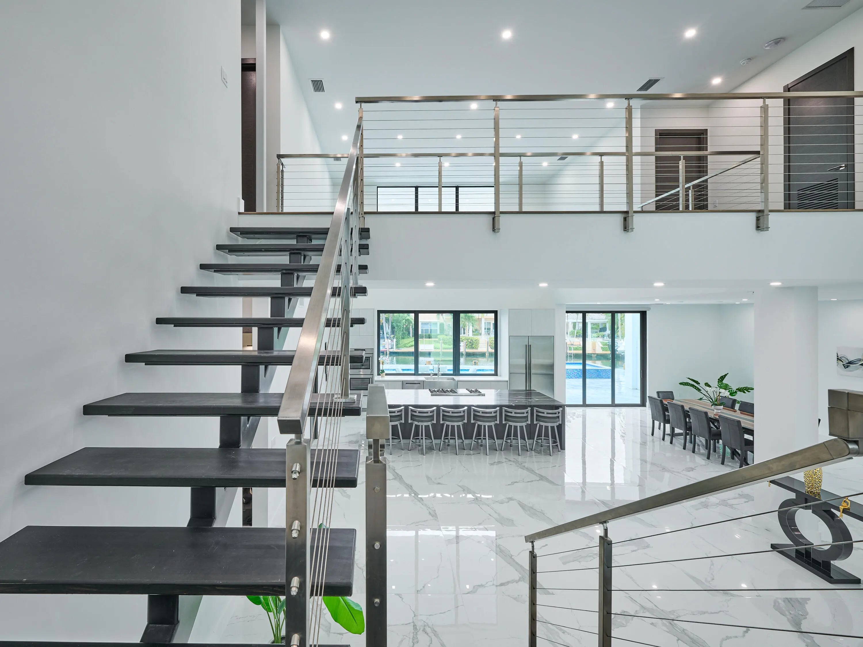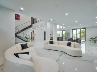 This exquisite, just-completed 2025 modern waterfront masterpiece offers turnkey coastal luxury in the heart of South Florida. Spanning approximately 4,500 square feet over two sunlit levels, the home delivers breathtaking ocean-access water views from nearly every room, seamlessly integrating indoor and outdoor spaces for a private resort-like experience. Soaring ceilings, expansive floor-to-ceiling impact-resistant glass, and automated motorized shades flood the interiors with abundant natural light. The gourmet chef's kitchen serves as the home's centerpiece, boasting an oversized double-slab black island, top-tier professional appliances, a gas cooktop, and elegant design perfect for intimate meals or large-scale entertaining. Upstairs, warm hardwood flooring leads to the luxurious