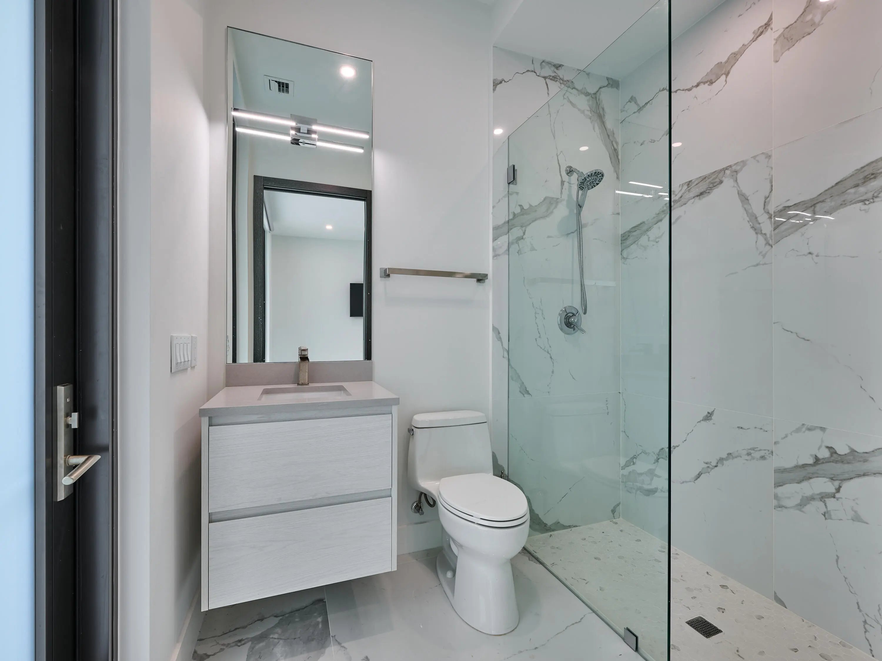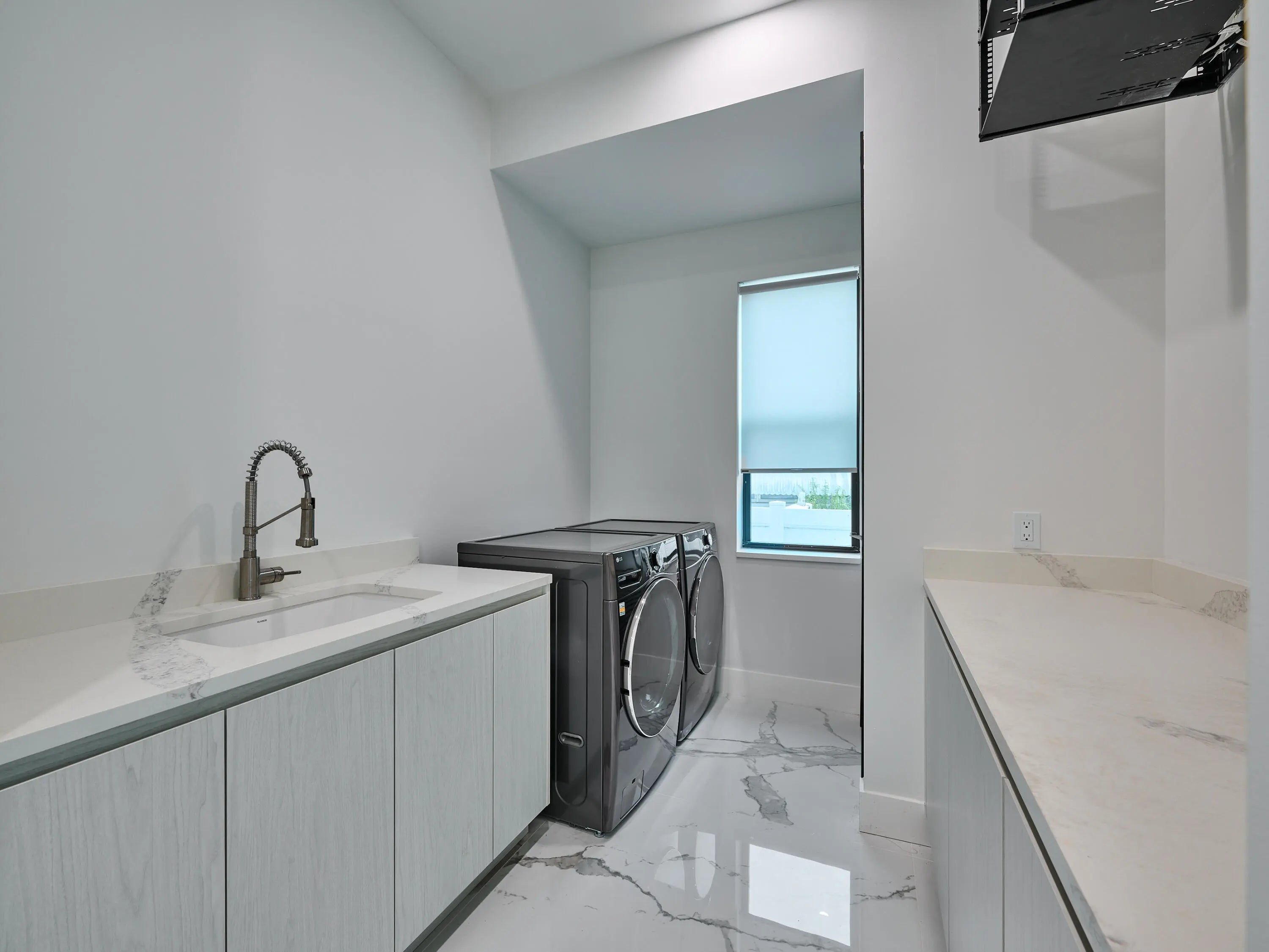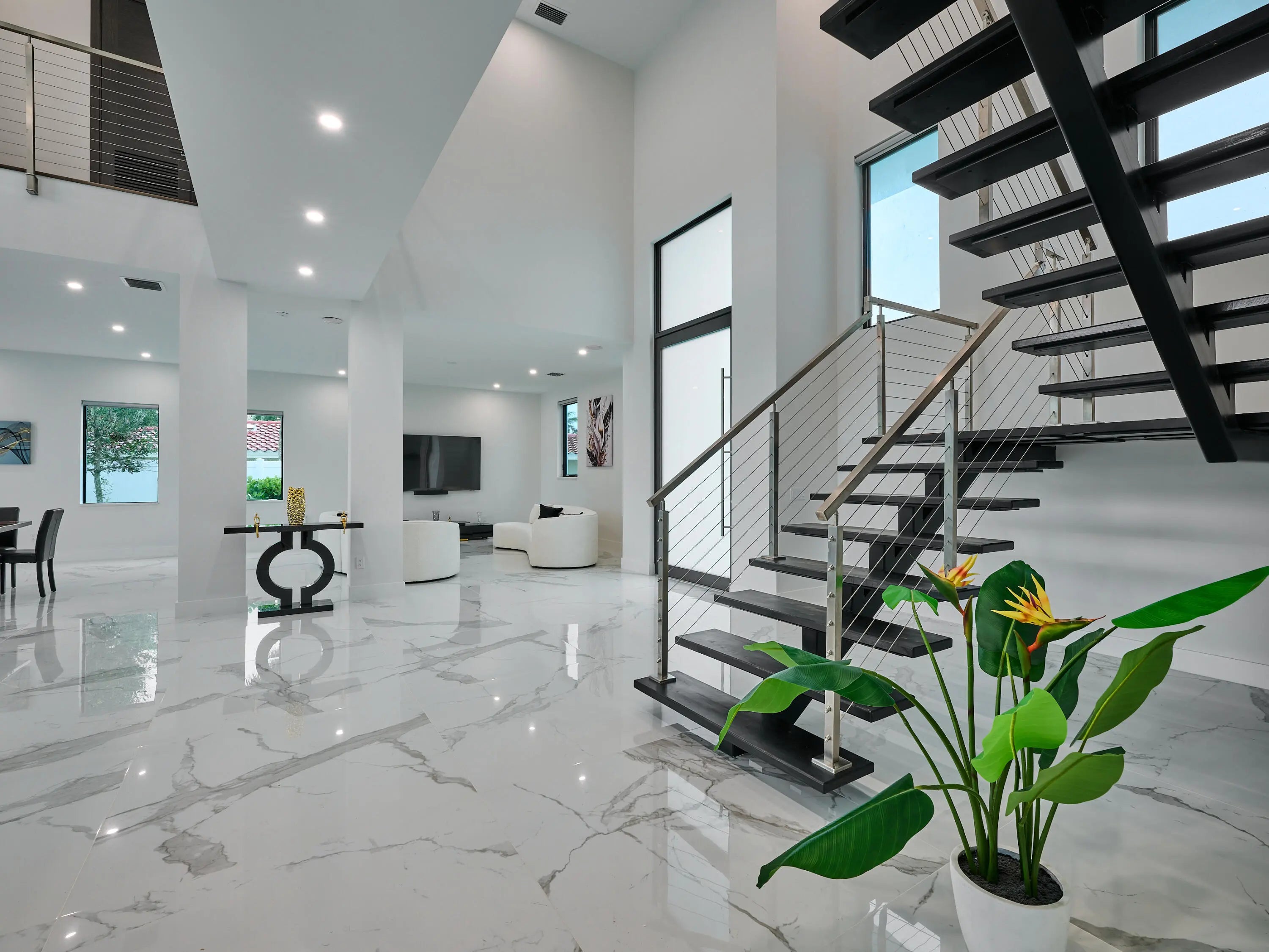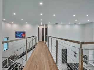 This exquisite, just-completed 2025 modern waterfront masterpiece offers turnkey coastal luxury in the heart of South Florida. Spanning approximately 4,500 square feet over two sunlit levels, the home delivers breathtaking ocean-access water views from nearly every room, seamlessly integrating indoor and outdoor spaces for a private resort-like experience. Soaring ceilings, expansive floor-to-ceiling impact-resistant glass, and automated motorized shades flood the interiors with abundant natural light. The gourmet chef's kitchen serves as the home's centerpiece, boasting an oversized double-slab black island, top-tier professional appliances, a gas cooktop, and elegant design perfect for intimate meals or large-scale entertaining. Upstairs, warm hardwood flooring leads to the luxurious
