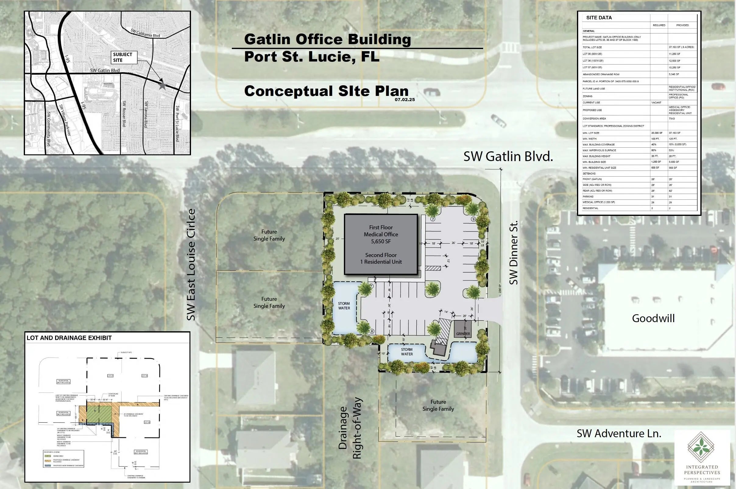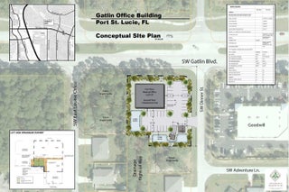 Owner Financing Considered. Hard Corner suitable for Professional Office/Medical Office with option for a residential unit on second floor located on busy SW Gatlin Blvd in Port St. Lucie.Pre-App meeting with city has resulted in the attached preliminary site plan showing 5,650 square-feet of office (first floor) and 990 square feet of residential (second floor).Will require city to abandon drainage ROW (no issues from city at pre-app) to develop this plan as shown.Priced to sell -- straight land deal. Not looking to wait for approvals at this price.