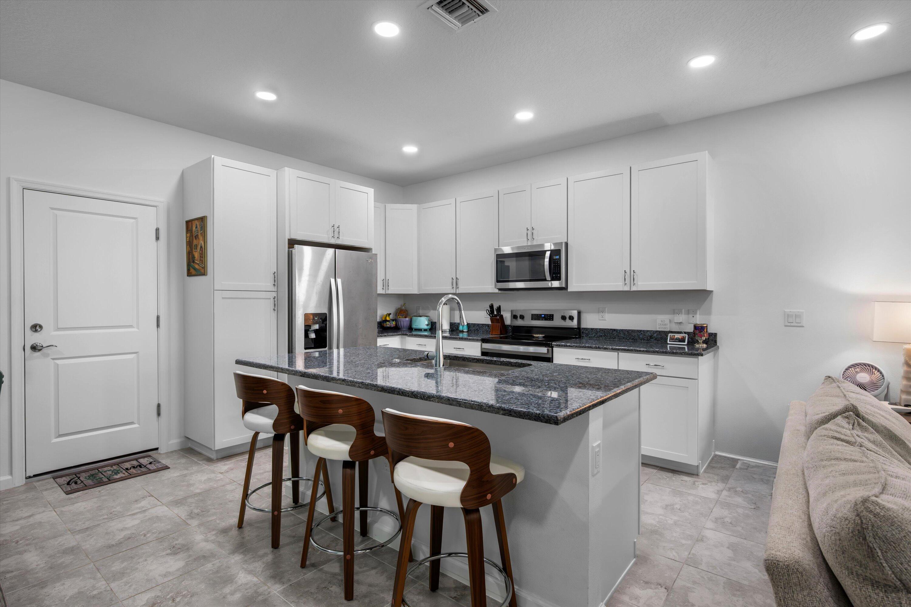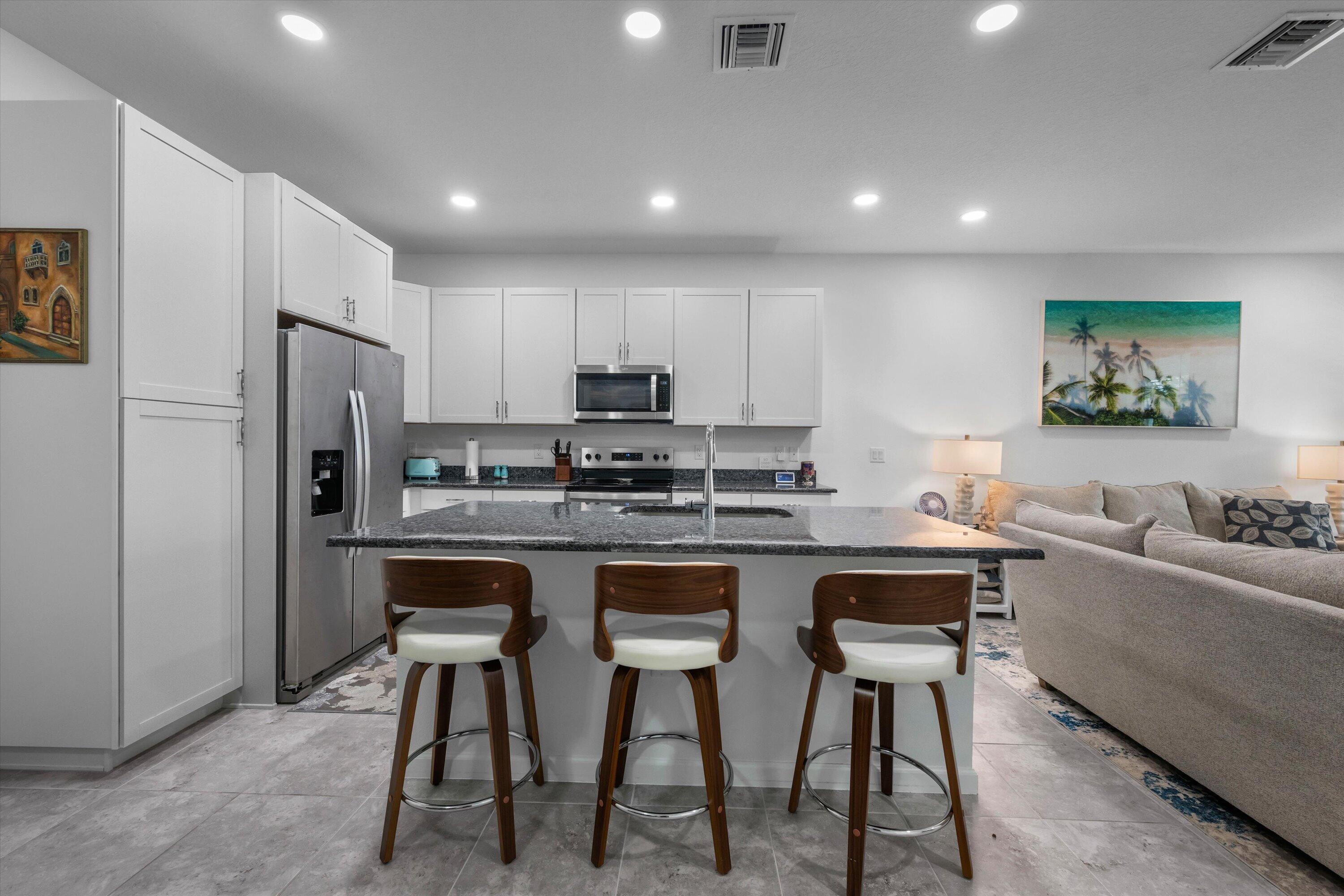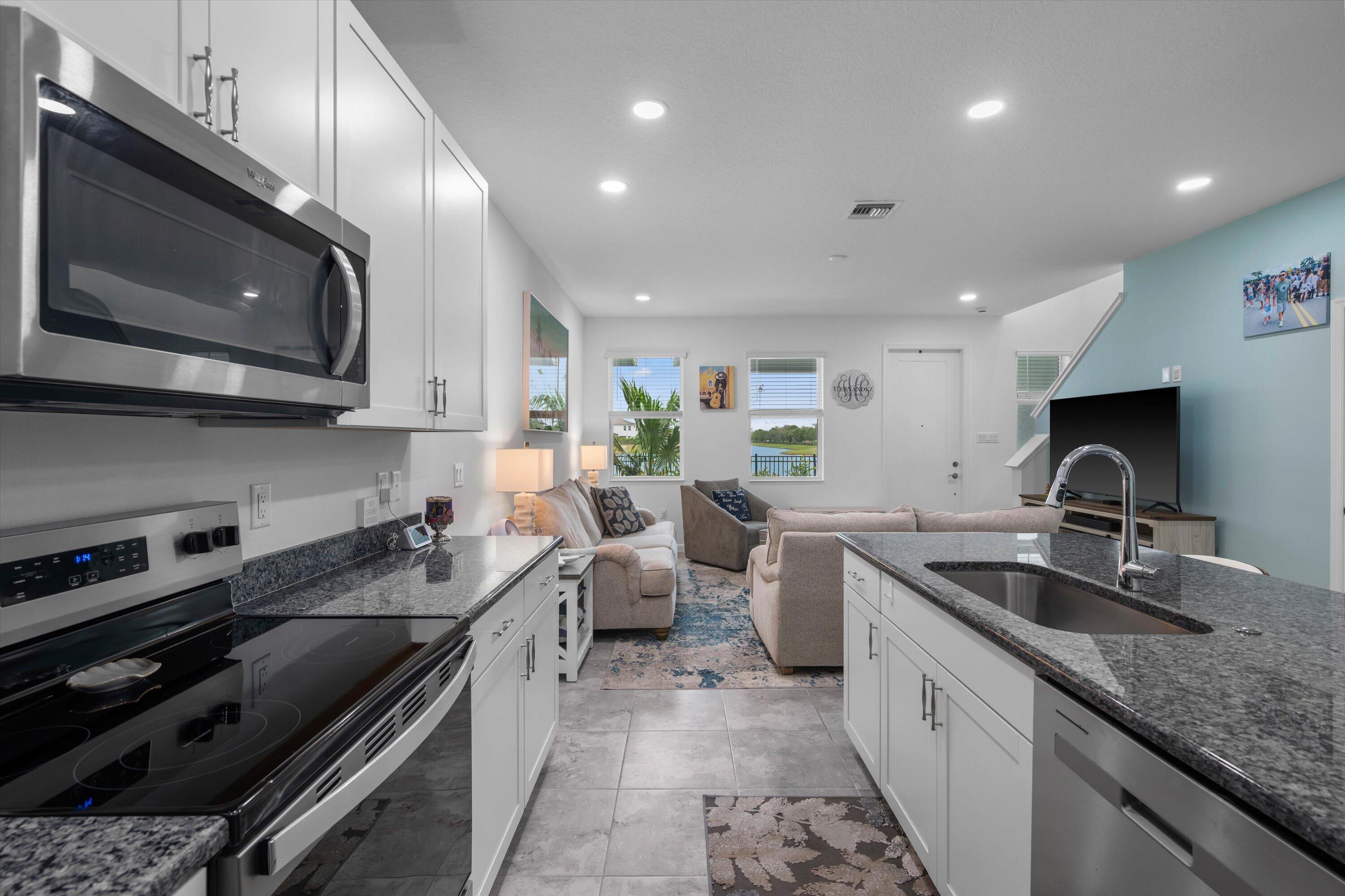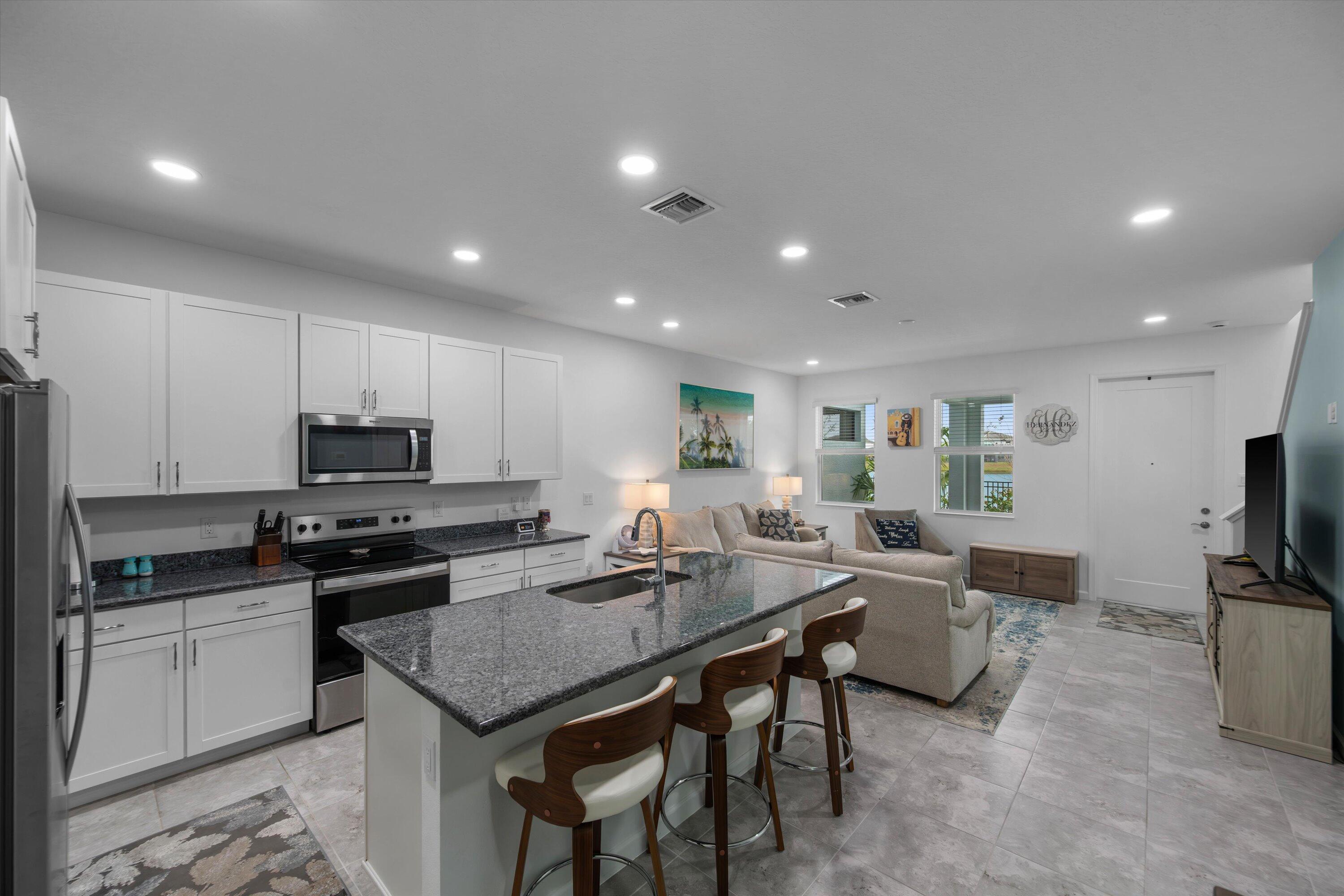 Welcome to this beautifully maintained 3-bedroom, 2.5-bath Rose townhome in the highly desirable Terraces community of Westlake! Offering 1,540 sq ft of living space plus a 2-car garage, this home welcomes you with a charming front porch--perfect for morning coffee while enjoying a stunning long lake view and breathtaking sunrises.Inside, you're greeted by a bright living room with recessed lighting and an open, functional layout. The kitchen features crisp white cabinetry, gorgeous gray-blue granite countertops, stainless steel appliances, and a large island with white shaker cabinetry and seating for threeideal for entertaining. A convenient downstairs powder bath and a designated dining area with direct access to the garage complete the first floor. Upstairs, the spacious primary suite is a true retreat with serene lake views and a private bath featuring dual sinks, granite countertops, white shaker cabinets, and a seamless glass-enclosed shower. Two additional generously sized bedrooms share a full bath with white shaker cabinetry, granite countertops, and a tub/shower combo. You'll also love the oversized upstairs laundry room with cabinetry, along with ample closet space throughout. Enjoy the Westlake lifestyle and the peaceful waterfront settingthis one checks all the boxes. Schedule your private showing today!