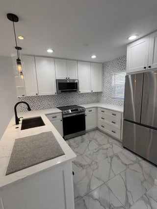 Buyer got denied! dont miss this opportunity for a turn key home LOW HOA! This unit is absolutely stunning. This single story beautifully renovated 1-bedroom, 1.5-bath villa has been thoughtfully updated from floor to ceiling. Enjoy porcelain flooring throughout and an open-concept kitchen enrobed in quartz countertops, white shaker cabinetry, and stainless steel appliances. Both bathrooms have been tastefully remodeled Principal room has a large walk in closet with ample space for all of your belongings. Relax in the serene Florida room, now fully enclosed with brand-new windows--an upgrade from the traditional screened enclosure--complete with a ceiling fan and A/C vent for year-round comfort. Enjoy the comforts of parking right in front of your unit, washers and dryers in the communit