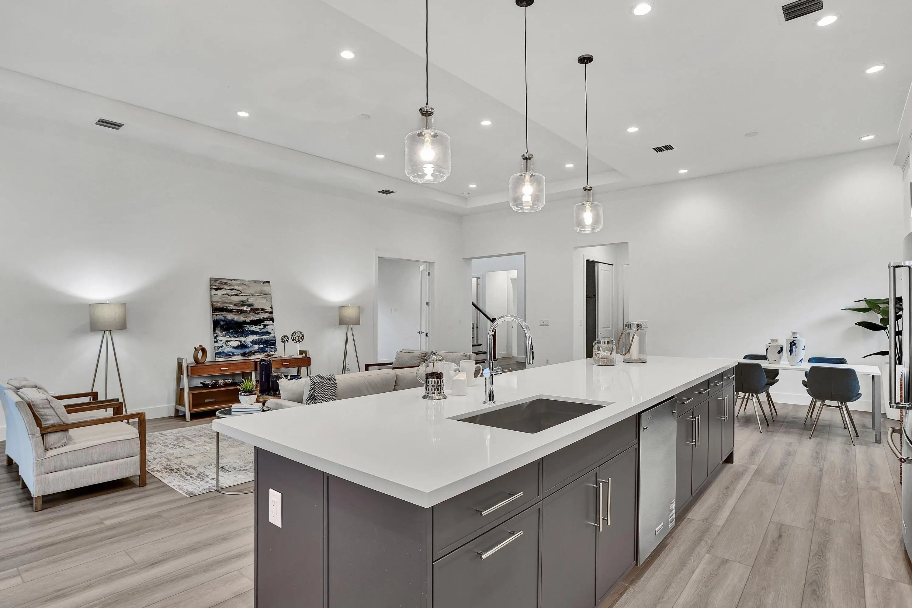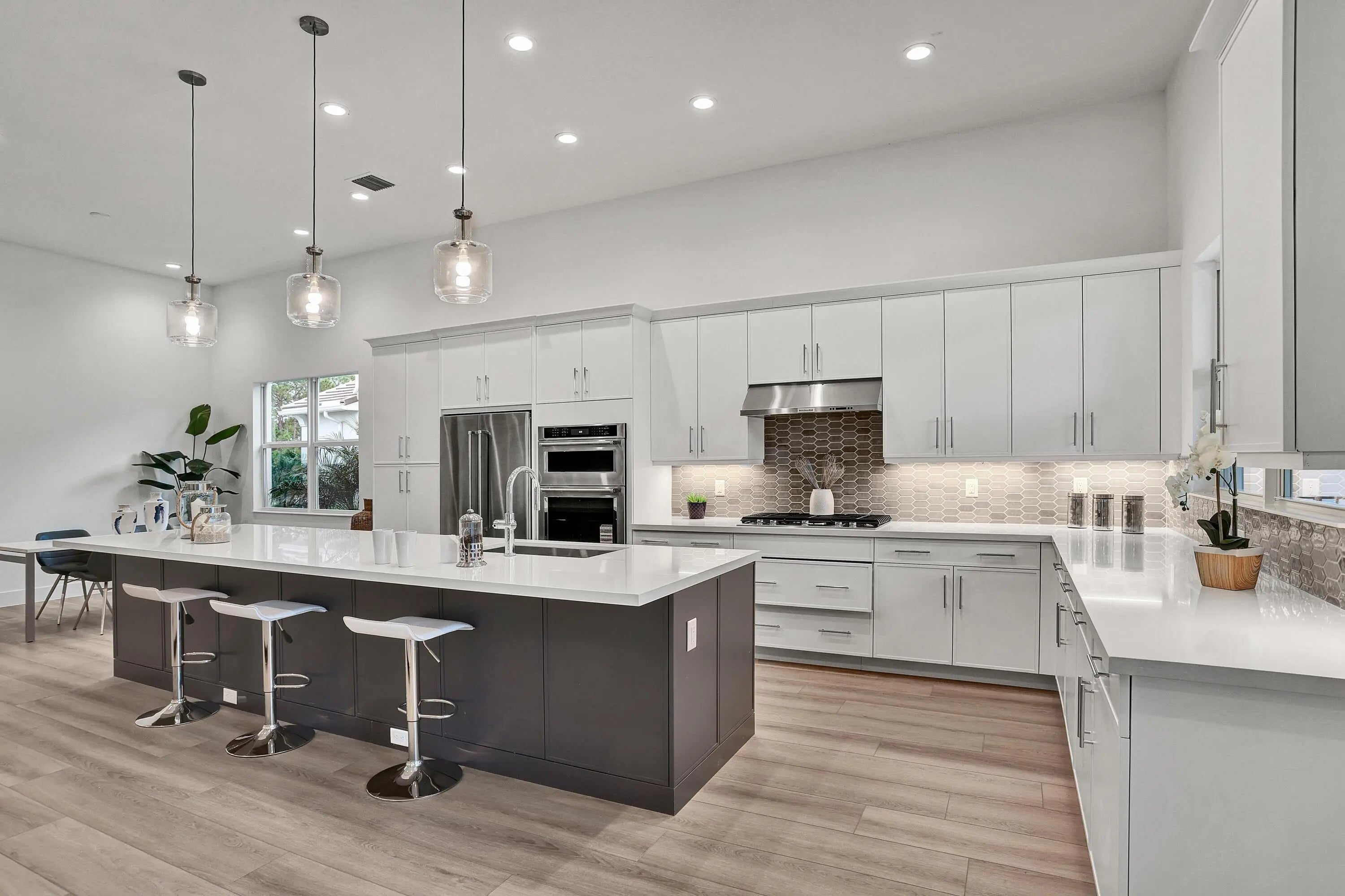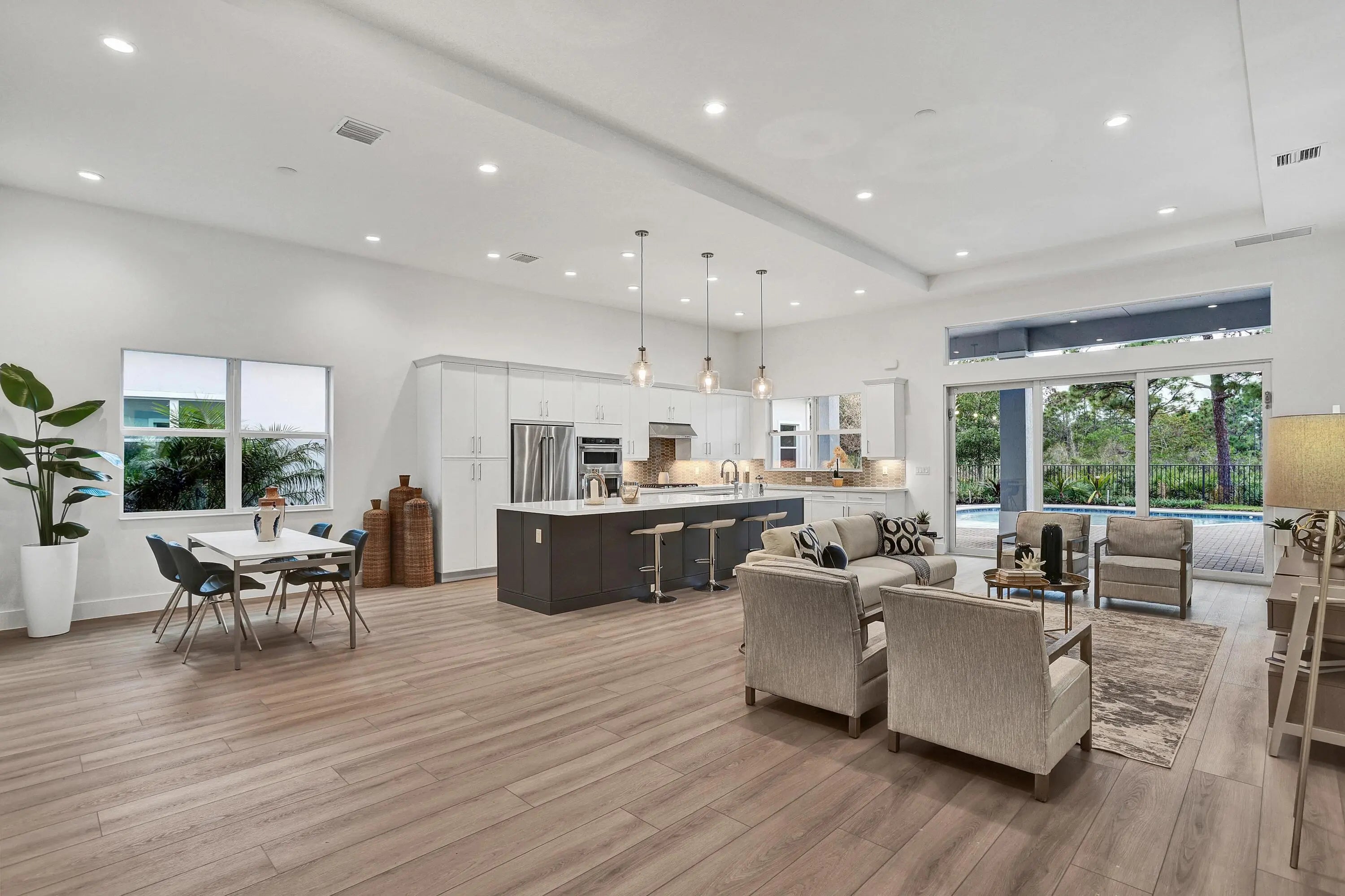 This is the Shearon floor plan by Toll Brothers, a thoughtfully designed 4-bedroom, 3.5-bath residence that blends refined elegance with effortless Florida living. A soaring foyer welcomes you into an open-concept layout ideal for both entertaining and everyday comfort. The great room features a tray ceiling and flows seamlessly to the covered lanai, showcasing tranquil preserve views.Luxury vinyl plank flooring extends throughout the main living areas, the primary suite, and the upstairs loft. The gourmet kitchen is a true centerpiece, appointed with KitchenAid appliances, a natural gas cooktop, a large center island with breakfast bar, wraparound countertops, and an inviting casual dining area.