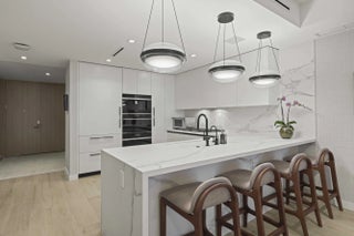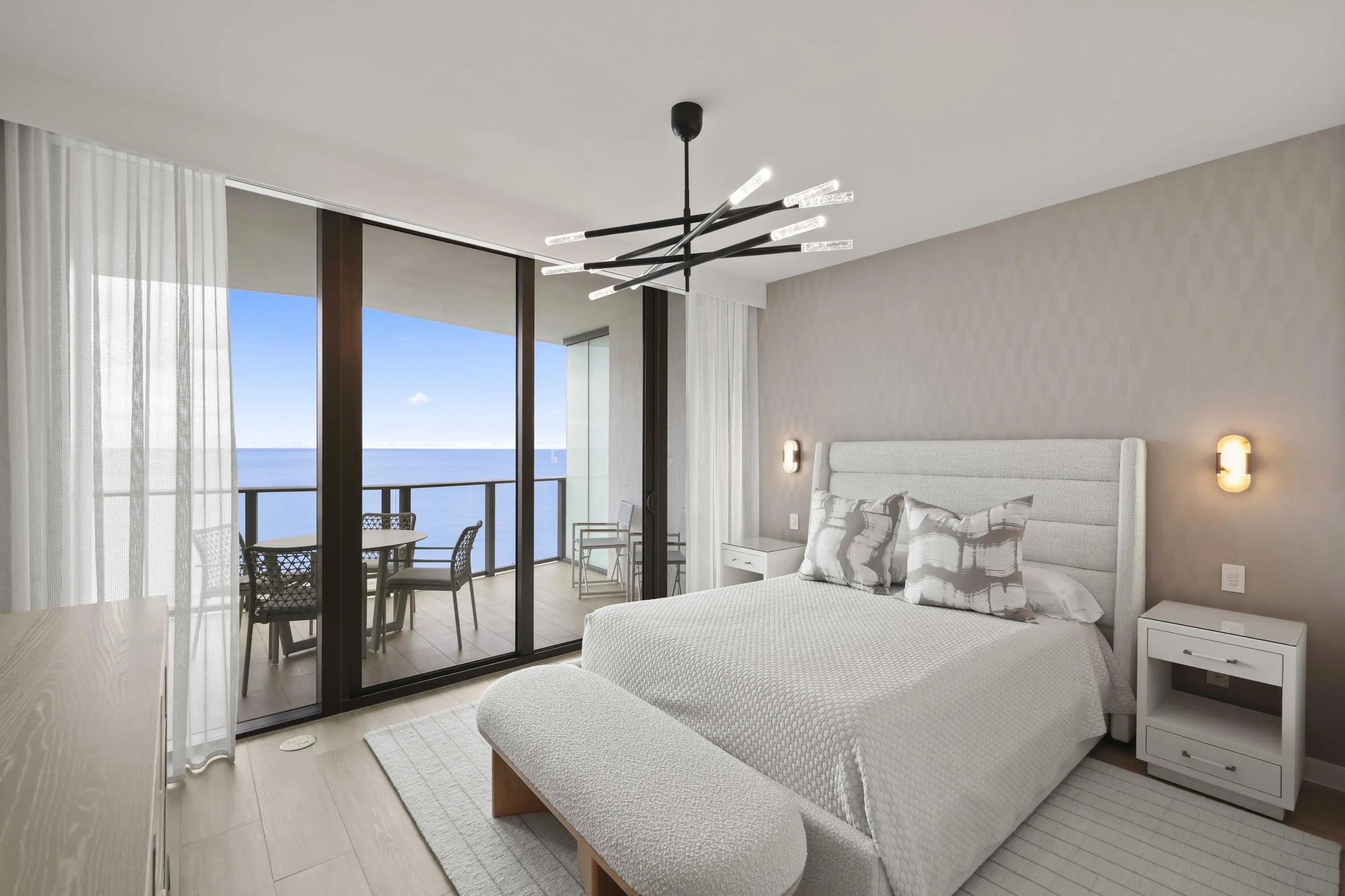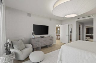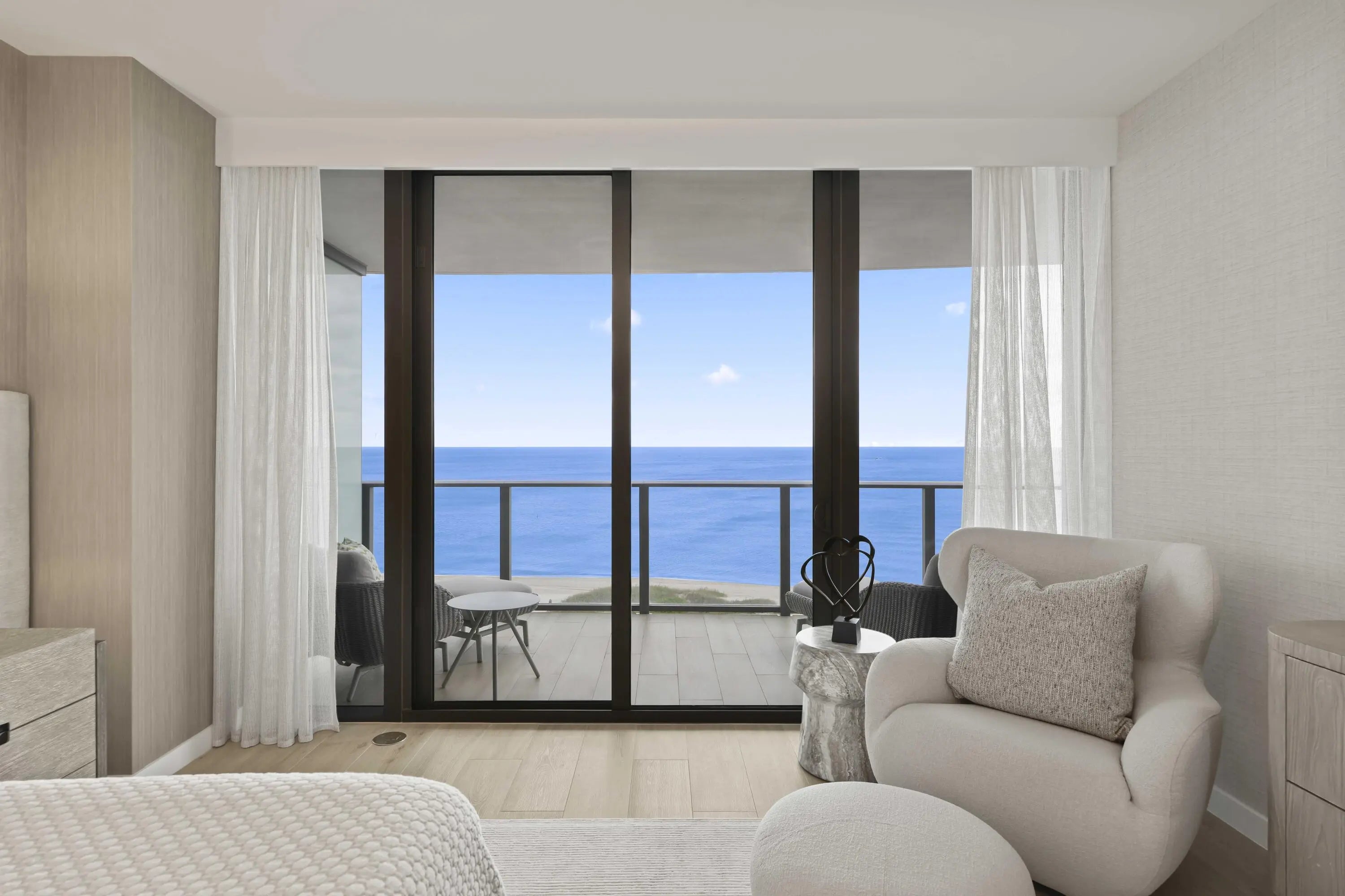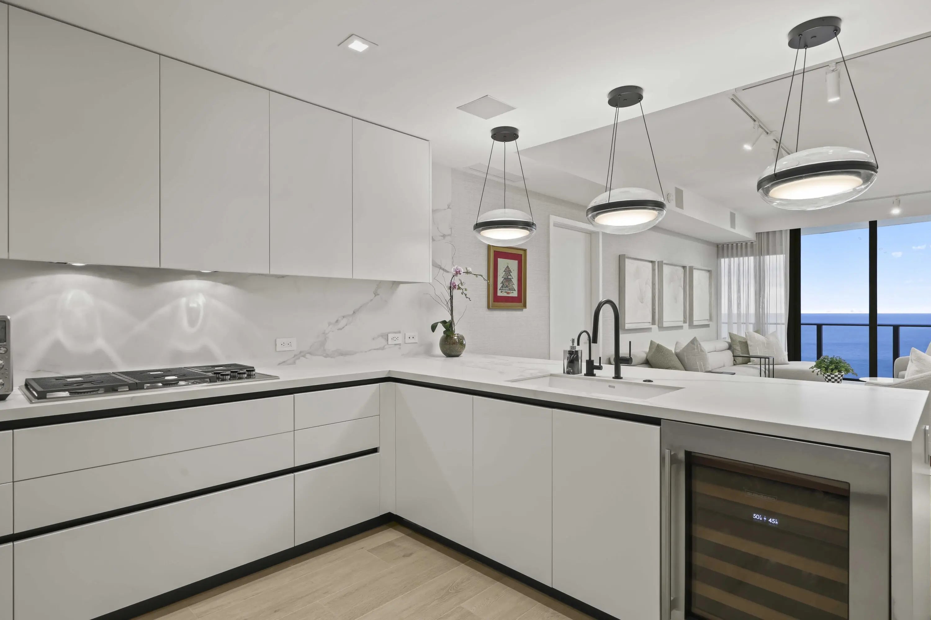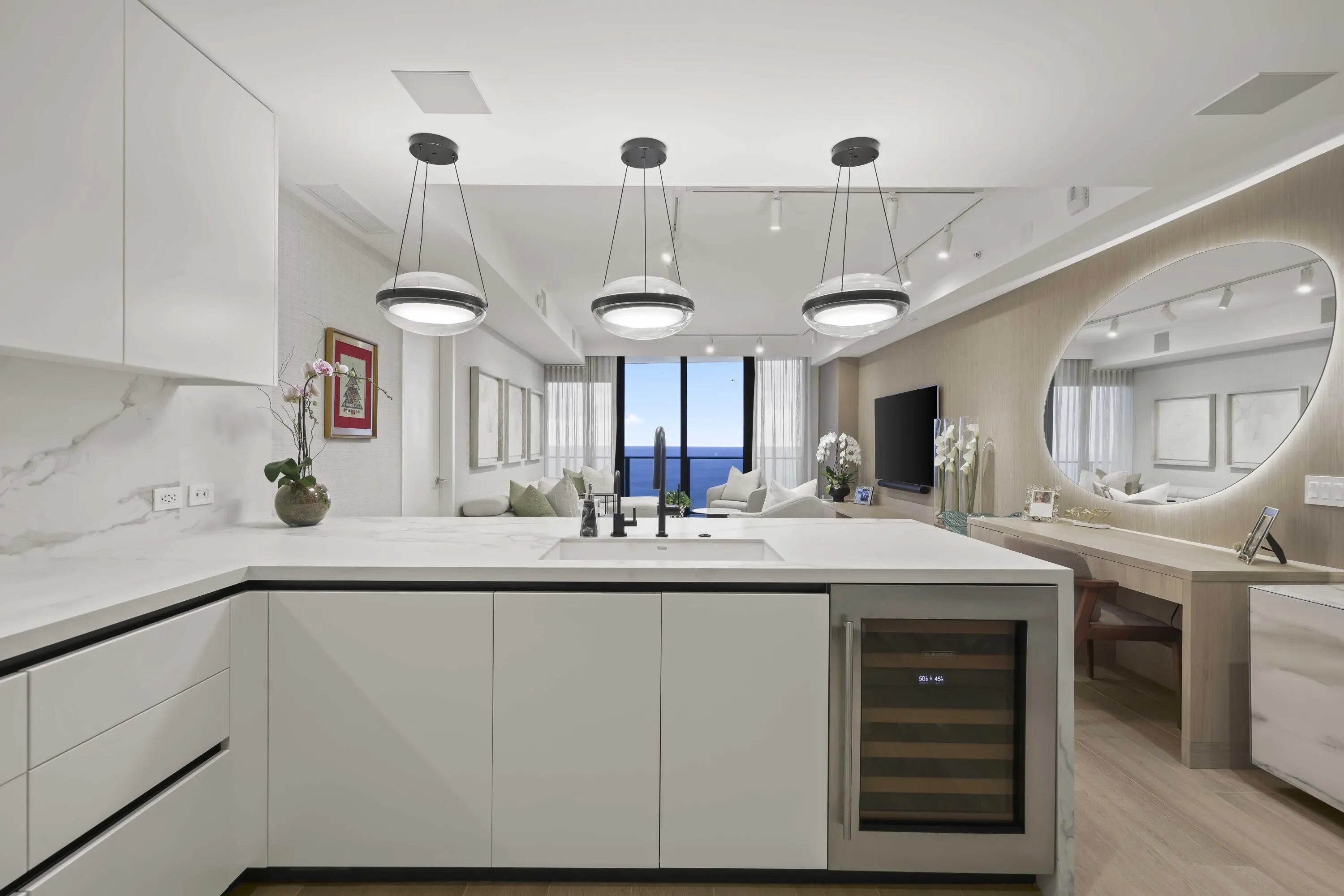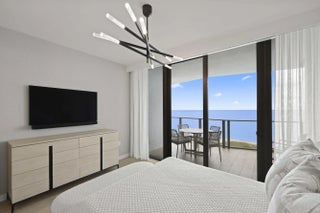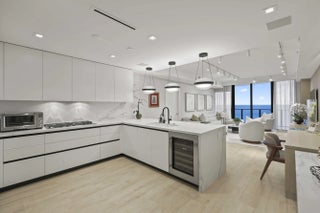 Turn-key, newer condo, exquisitely furnished Interiors by Steven G, with direct sapphire ocean views from a 43' sunrise balcony. The spacious 3-bedroom, 2.5-bath split floor plan features floor-to-ceiling glass, allowing you to hear the waves and watch the coastline glow while enjoying automated white sunshades, EcoBar smart A/C, WiFi speakers (6), and Tacora blonde porcelain plank floors throughout. The European matte-white kitchen with Calacatta-vein quartz + waterfall edge, Wolf/Sub-Zero appliances, touch-front fridge, Wolf coffee system, and Hans Grohe finishes is stunning. This is a five-star, pet-friendly building: concierge, 24/7 valet/security, sunrise/sunset pools, wine lounge, cafe, fitness studio, steam/sauna, club room, & BBQ. Walk to the Pompano Beach Pier and dining options.