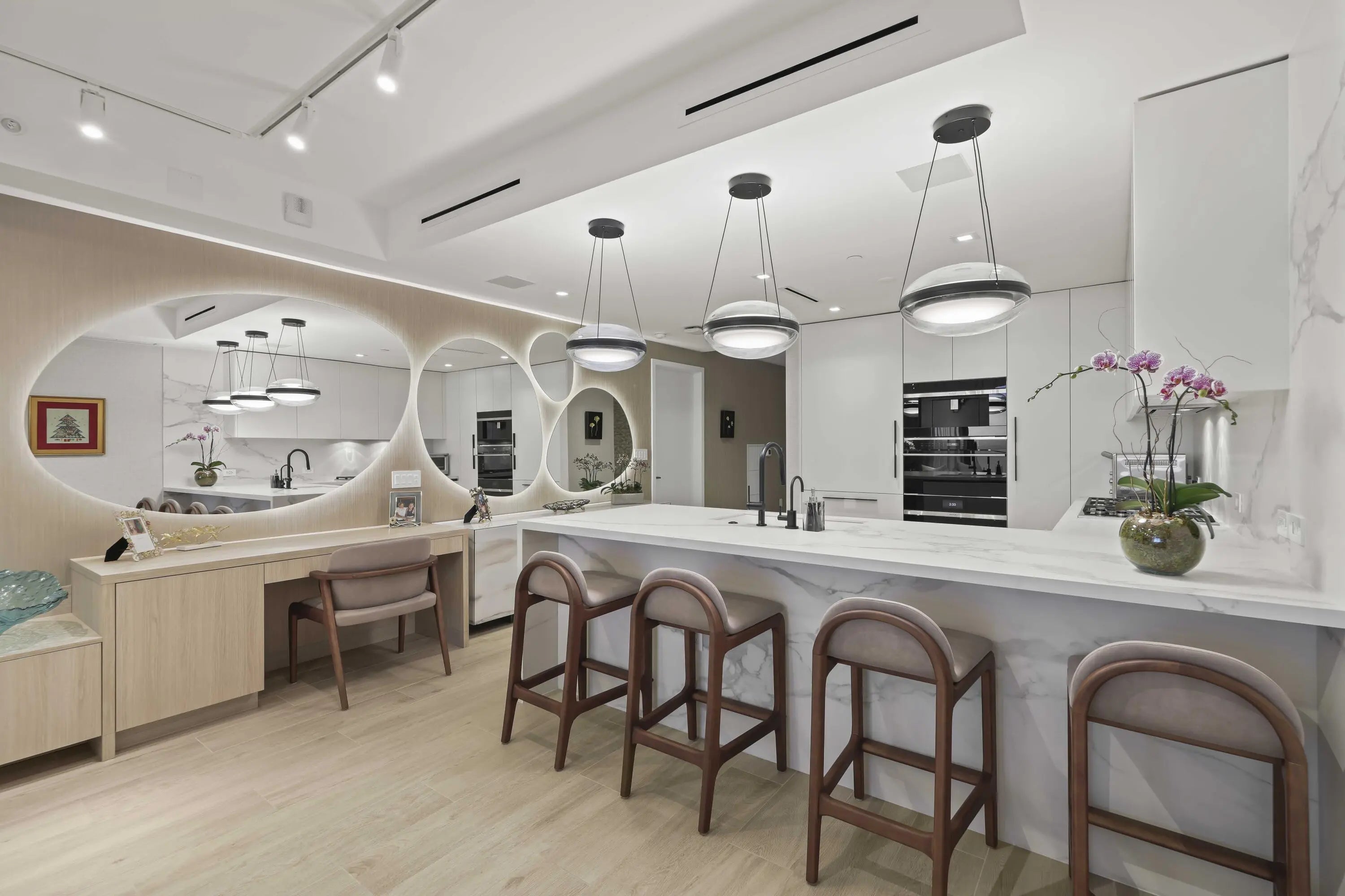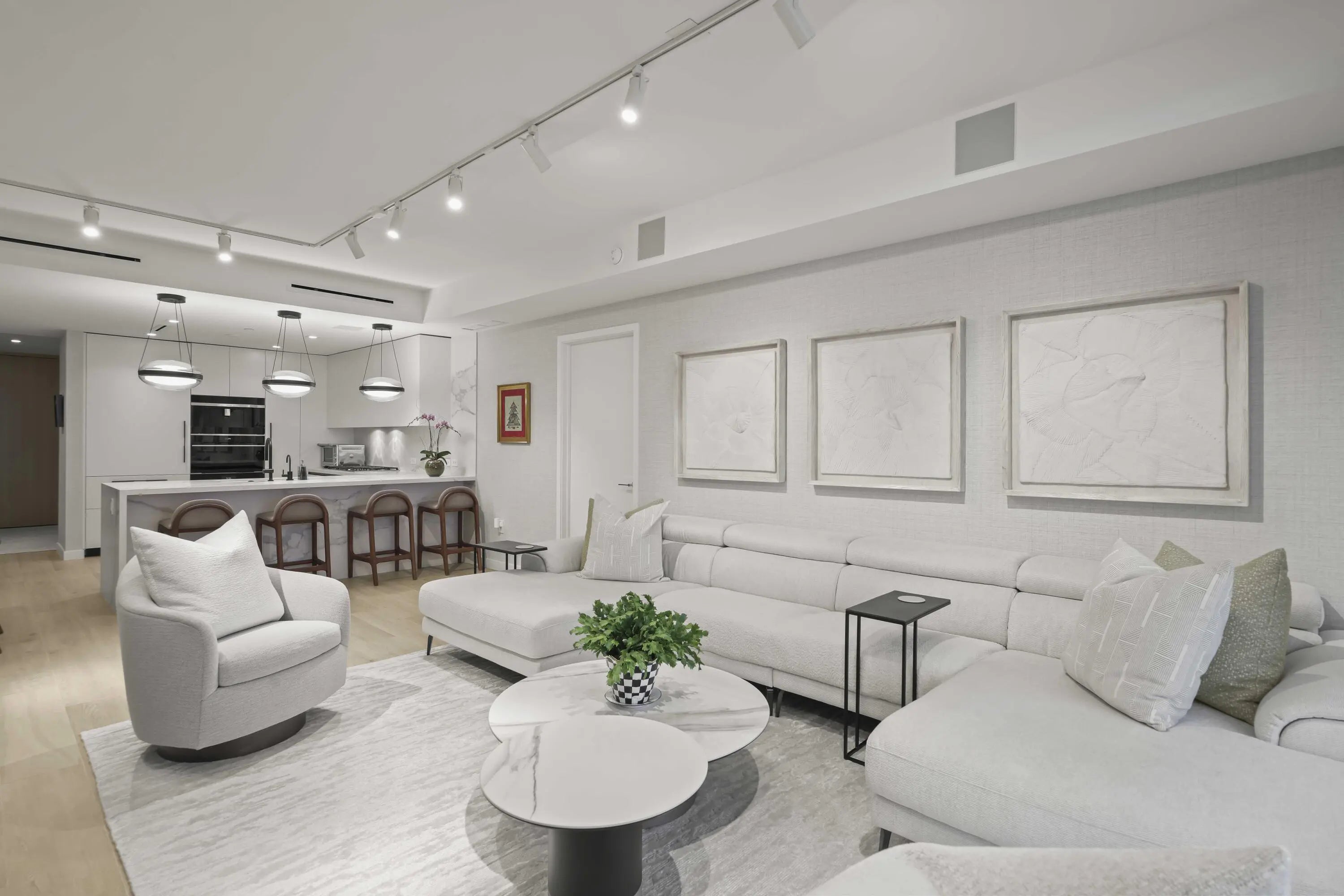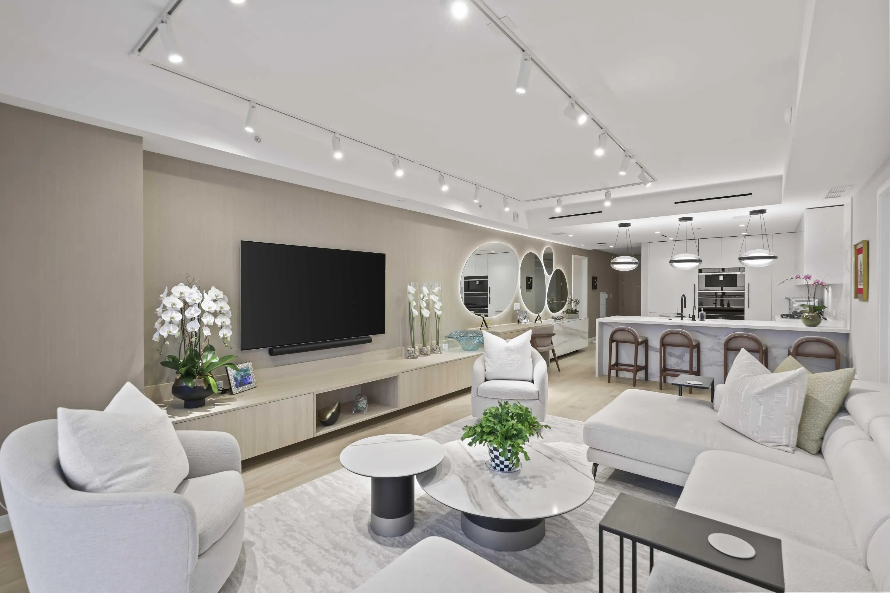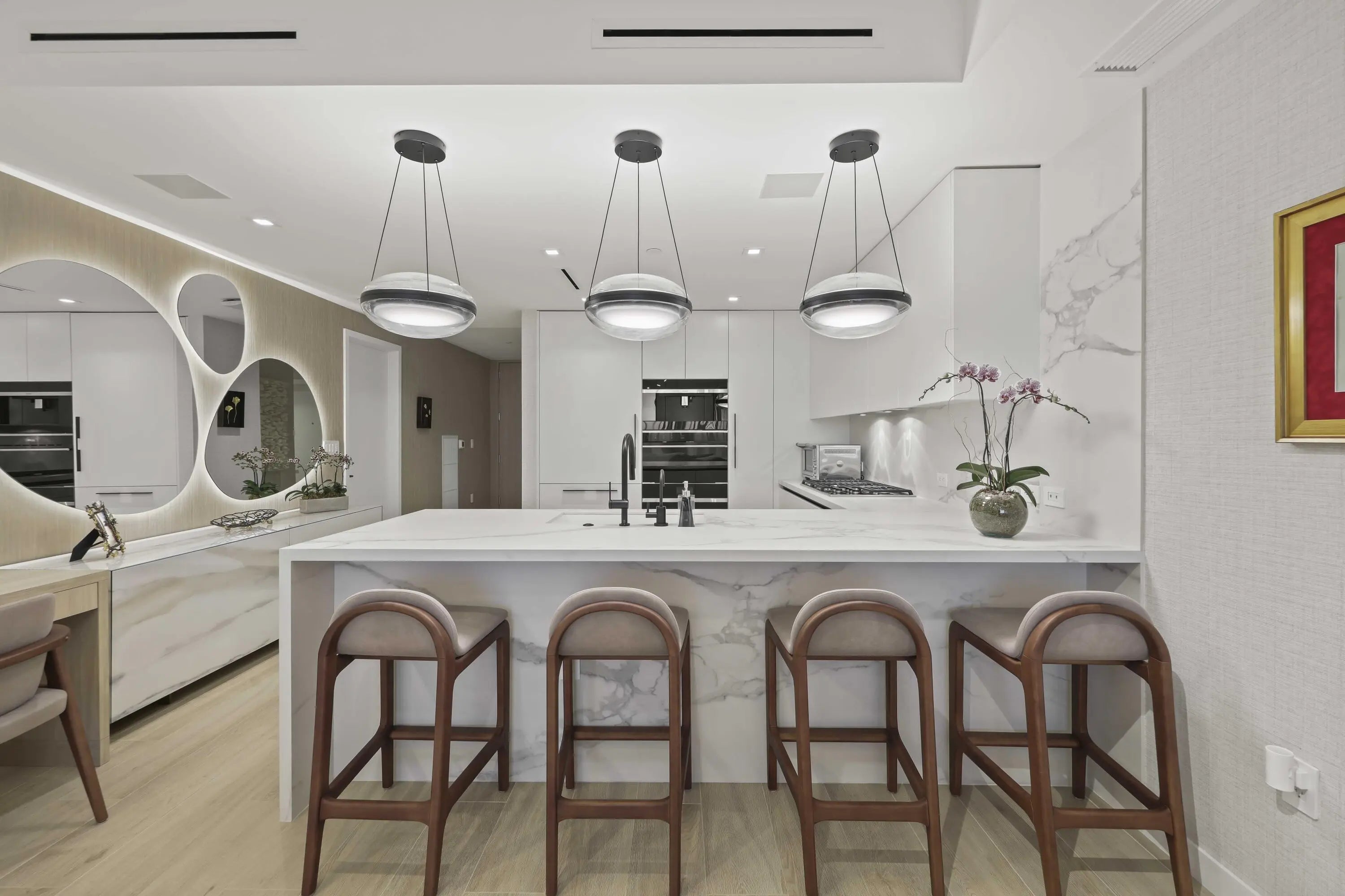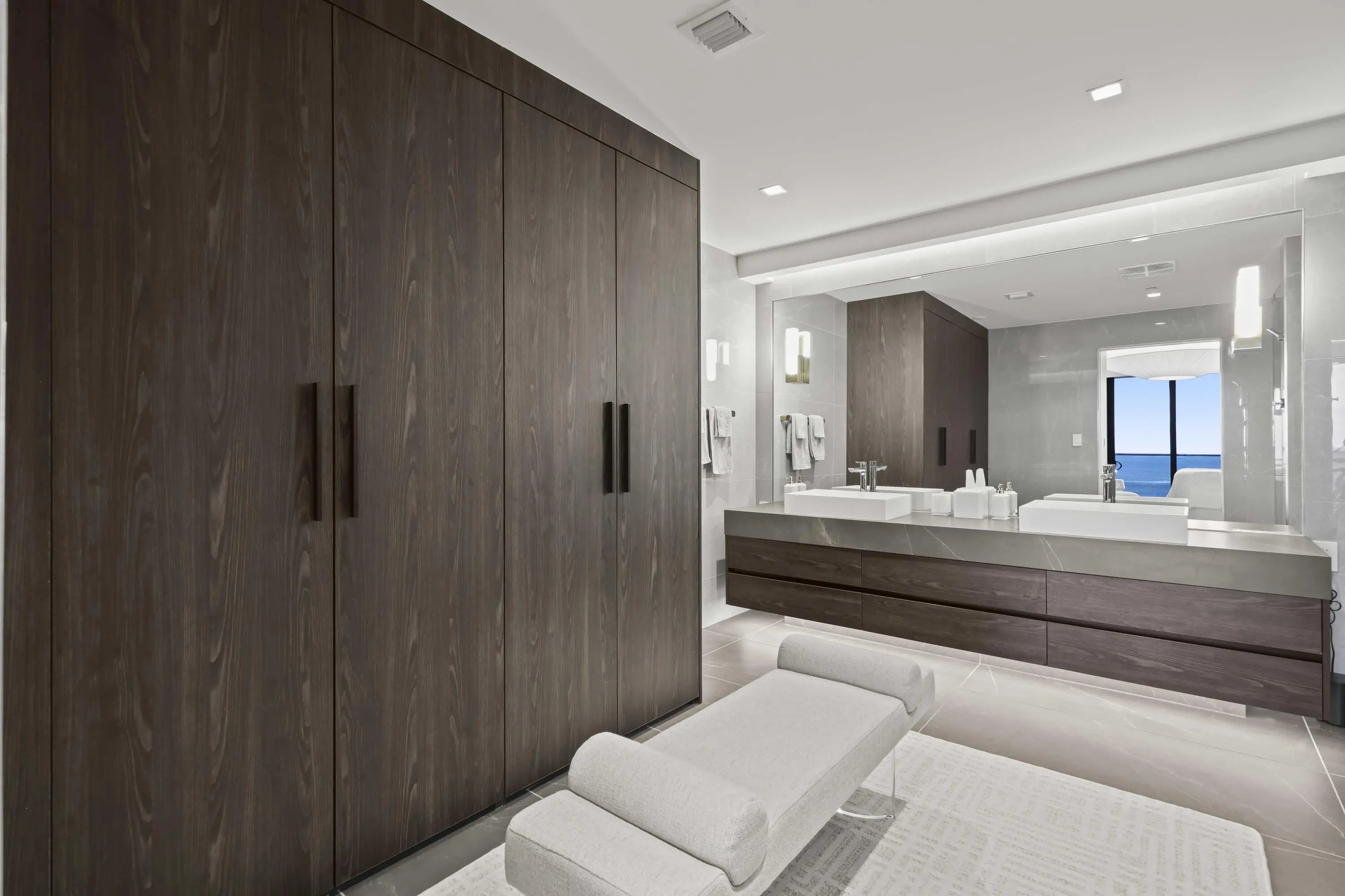 Turn-key, newer condo, exquisitely furnished Interiors by Steven G, with direct sapphire ocean views from a 43' sunrise balcony. The spacious 3-bedroom, 2.5-bath split floor plan features floor-to-ceiling glass, allowing you to hear the waves and watch the coastline glow while enjoying automated white sunshades, EcoBar smart A/C, WiFi speakers (6), and Tacora blonde porcelain plank floors throughout. The European matte-white kitchen with Calacatta-vein quartz + waterfall edge, Wolf/Sub-Zero appliances, touch-front fridge, Wolf coffee system, and Hans Grohe finishes is stunning. This is a five-star, pet-friendly building: concierge, 24/7 valet/security, sunrise/sunset pools, wine lounge, cafe, fitness studio, steam/sauna, club room, & BBQ. Walk to the Pompano Beach Pier and dining options.