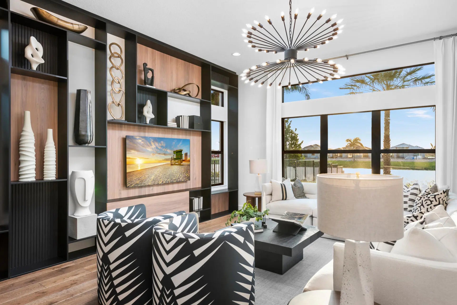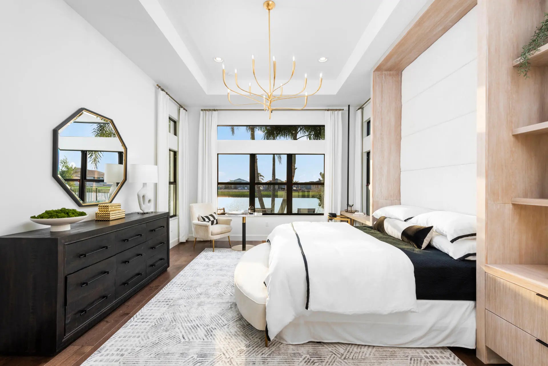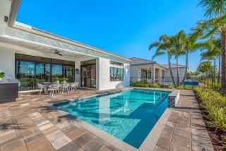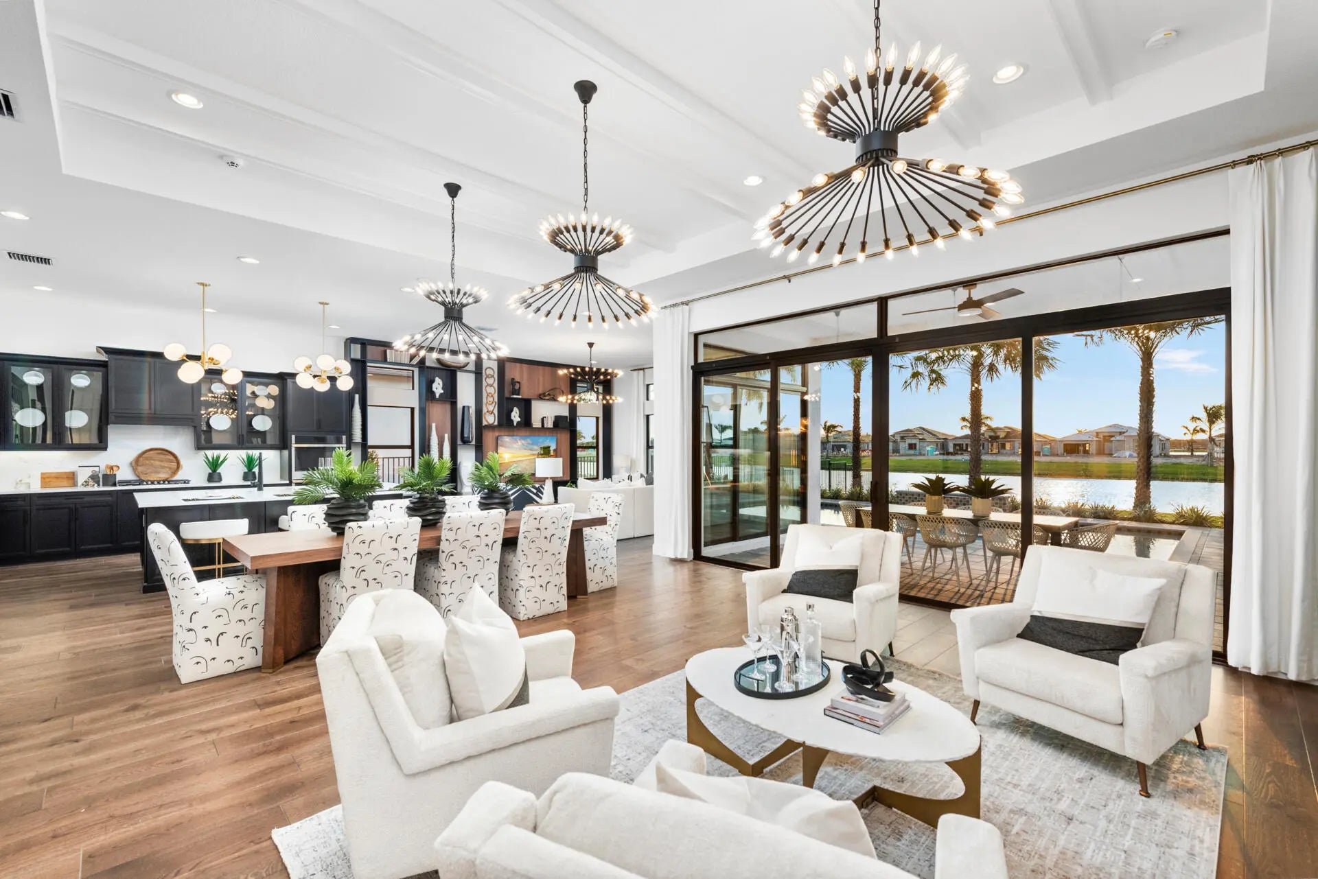 Fully-Furnished & Designer-Decorated Model Home with 3 Bedrooms, a Club Room, Family Room, Living Room, 3.5 Baths, Split 3-Car Garage, a Pool w/Sheer Descent and a Summer Kitchen on a stunning lakefront lot. The Sonoma model features 14-foot ceilings, rich engineered wood floors, a gourmet kitchen, with sleek matte black cabinetry, glass accents, a custom wood hood, and a 42'' built-in refrigerator. The primary suite features a floor-to-ceiling upholstered headboard, designer lighting, and a spa-style bath with a soaking tub. A stylish club room with custom built-ins and multiple TVs offers the perfect space for entertaining. Amenities include a full service restaurant, Indoor pickleball, 44,000 square foot clubhouse with a spa and salon, indoor/outdoor bar, multiple pools, tennis & more.