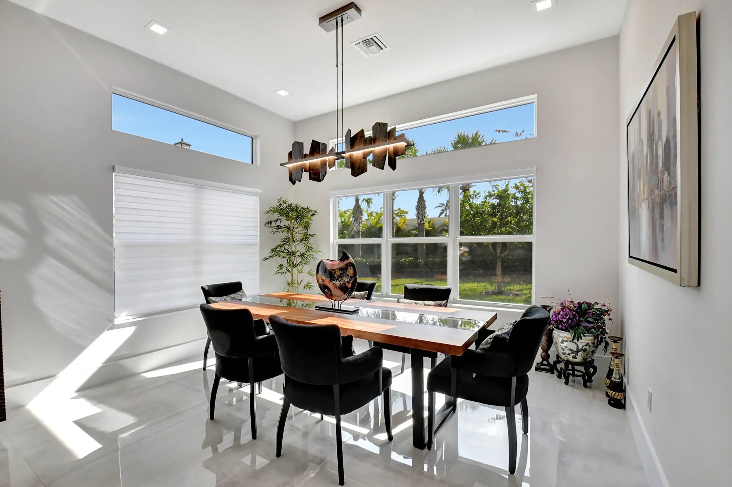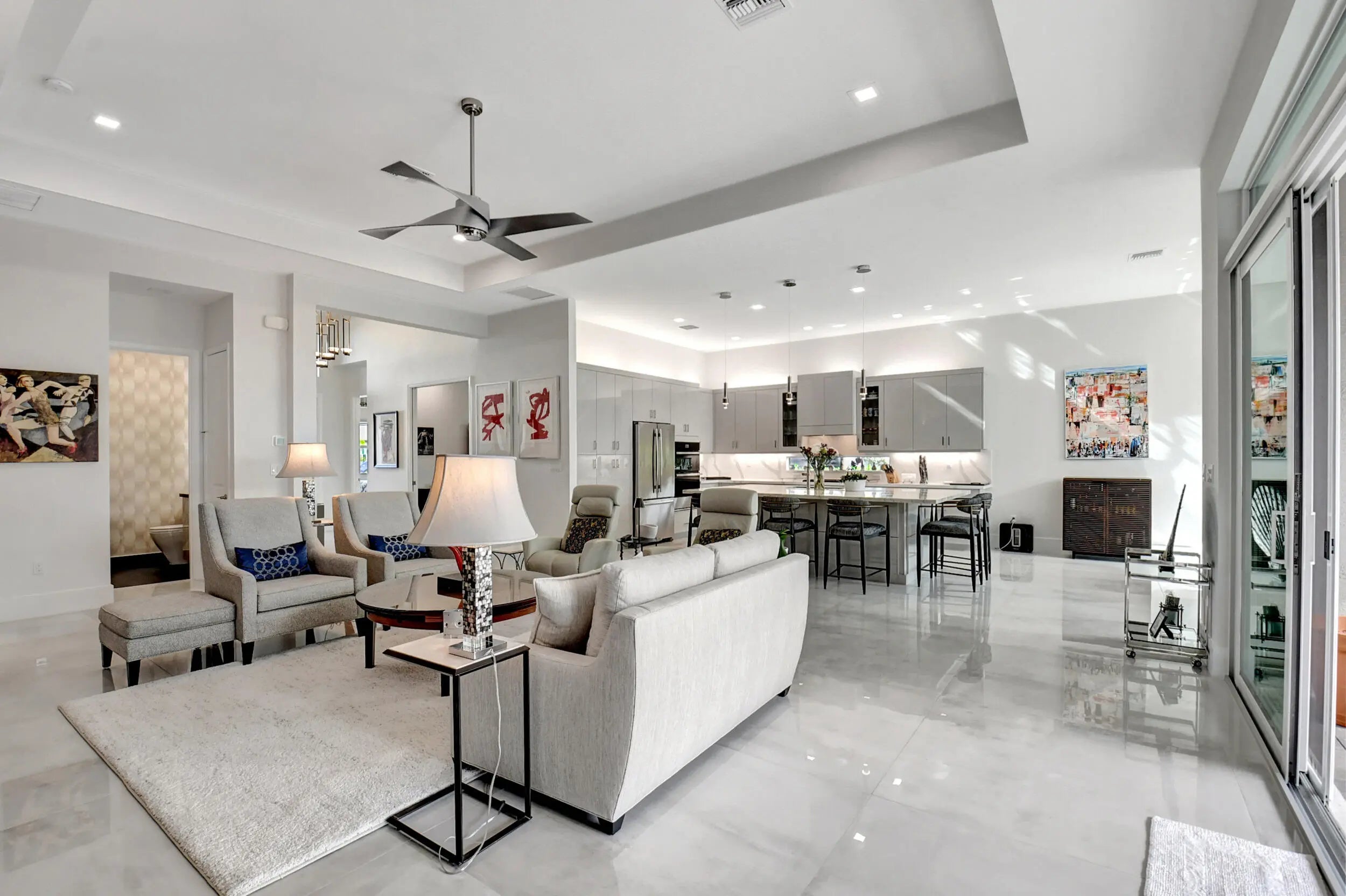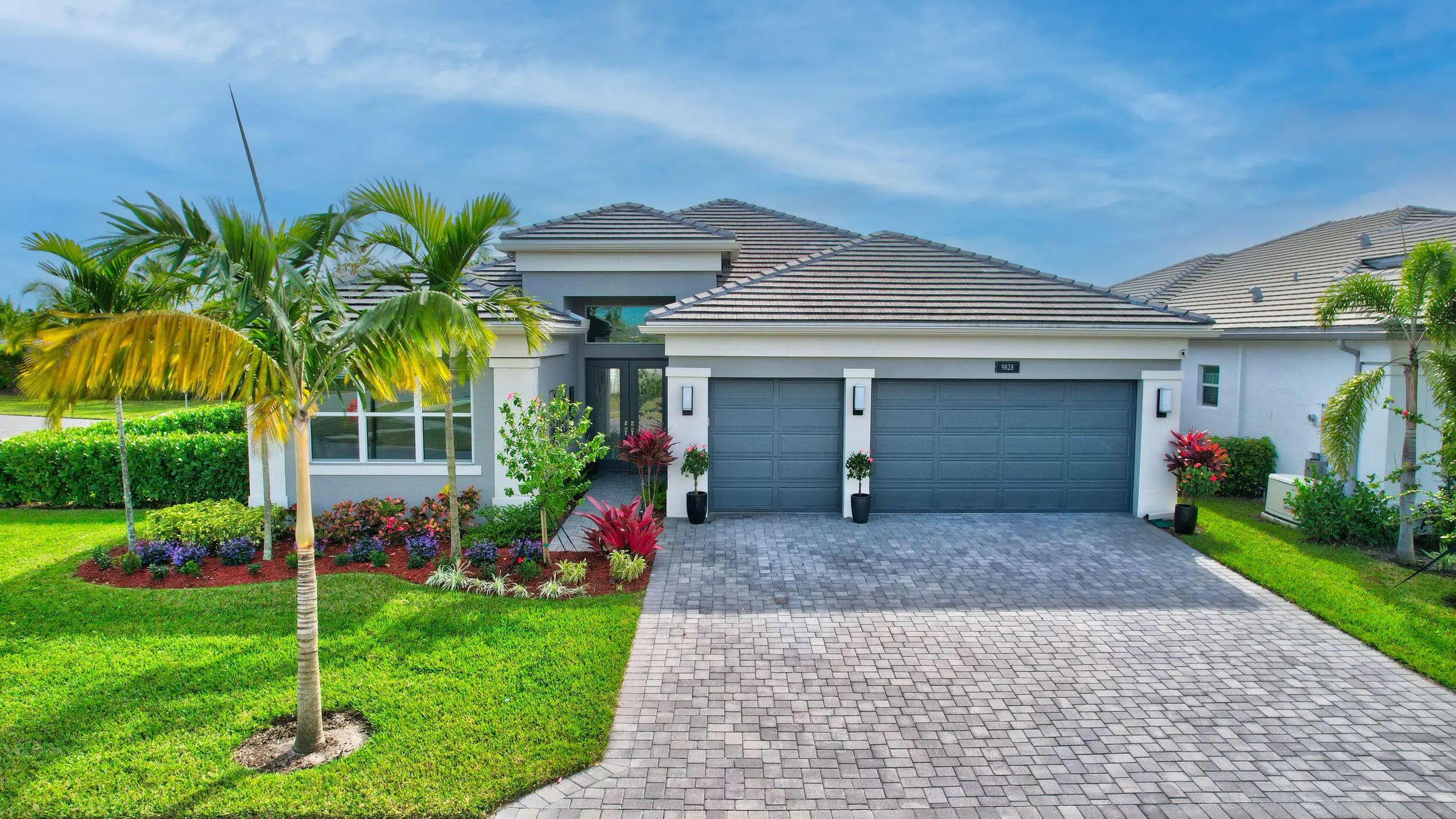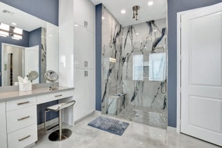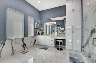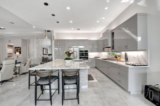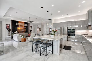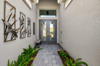 Paradise Unparralled Awaits you! Welcome to your stunning 3 bd/3 1/2 bath, plus office/den, 3 car garage, corner lot, expanded Jade model in Valencia Sound. This vibrant 55+ resort community just a few miles from the beach offers an array of amenities with pickleball courts, pools, tennis courts and a 40K Sq Ft club house complete with restaurant, bistro and bar. This home is more than just a place to live: it's a Masterpiece. Completely transformed by the owners into a designer home, it boasts elegance and sophistication that surpasses any model. Luxury and comfort blend seamlessly. As you walk up the expanded front walkway adorned with pavers and enter through the glass etched front doors you are greeted with magnificent 48''x48'' porcelain floors throughout the home.
