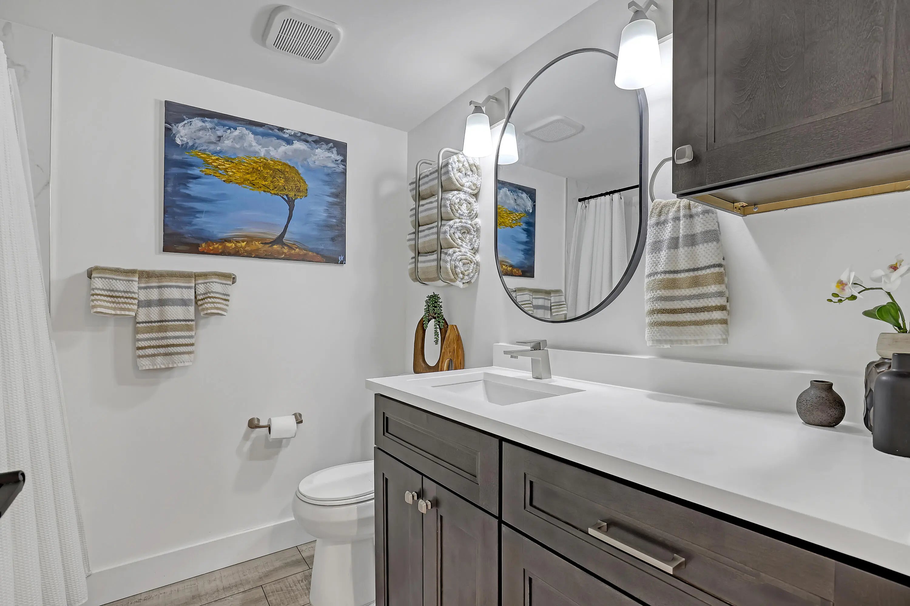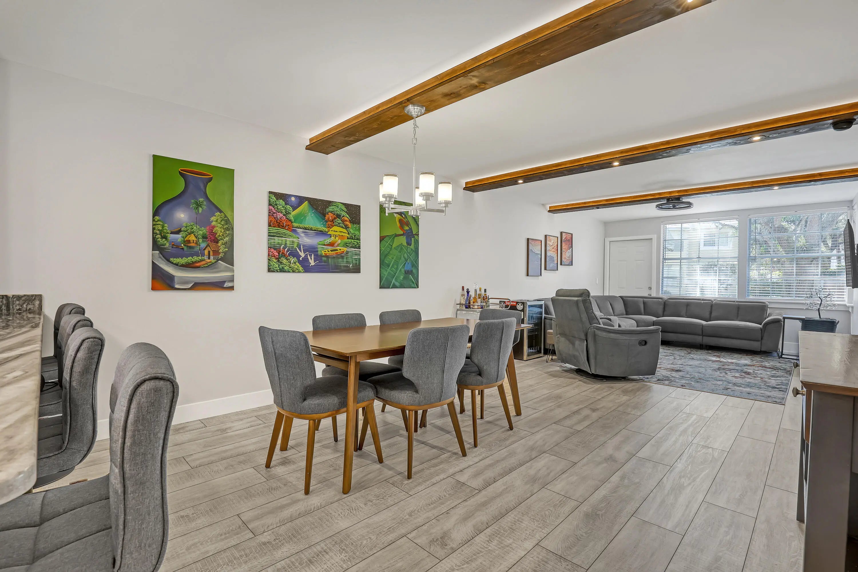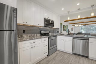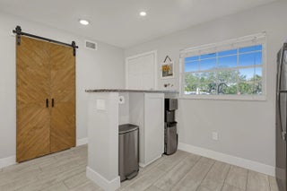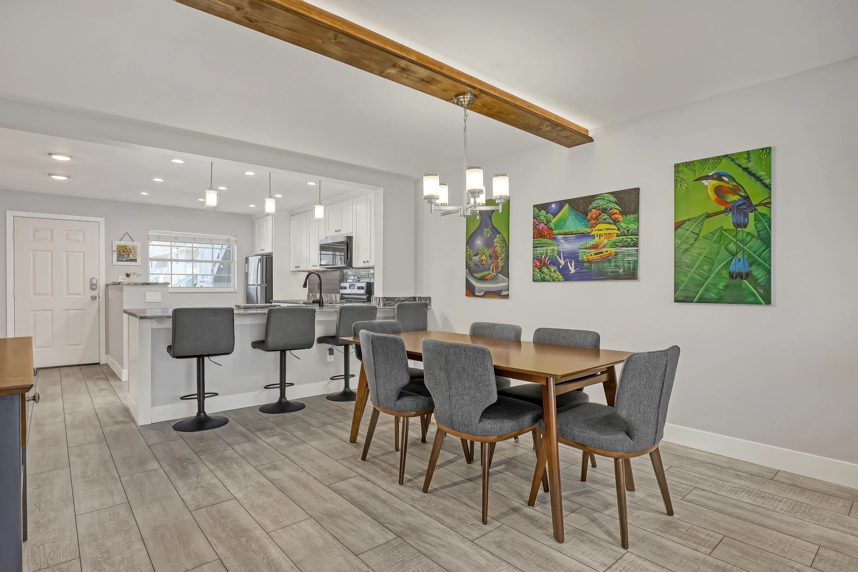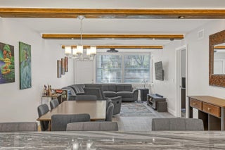 Welcome to this beautifully updated, light-filled corner unit with thoughtful upgrades throughout. High ceilings with exposed beams feature indirect LED cove lighting and recessed lighting, creating a warm, modern ambiance. The updated kitchen offers stainless steel appliances, granite countertops, and a spacious island, perfect for everyday living and entertaining. A split-bedroom floor plan provides added privacy, while luxury vinyl flooring runs throughout for a clean, cohesive look.The primary suite features an updated shower with bench, quartz countertops, and an LED mirror. The guest bathroom has been tastefully updated with a modern tile surround and quartz countertops.