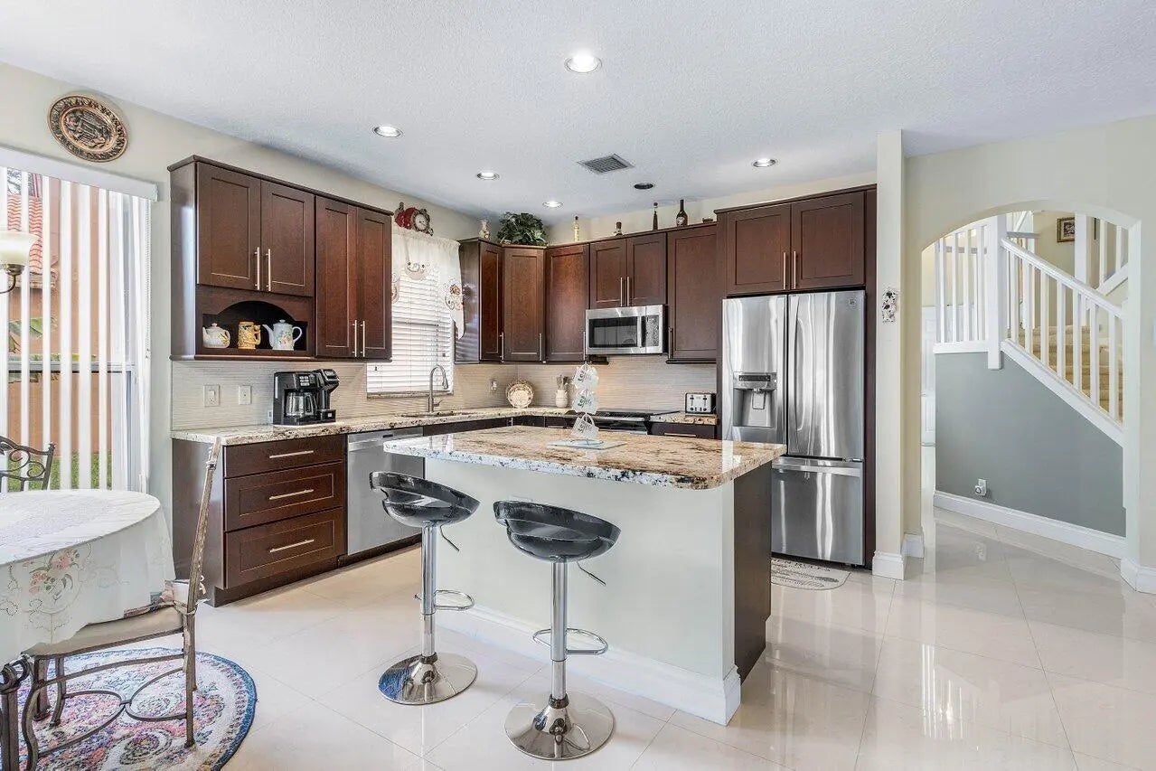 Rare lakefront home in man-gated, pet-friendly Mizner Pointe! Lakefront here is rarely available. 4BR/3.5BA with 2,675 SF living (3,104 total) and a main-level primary suite. Bright open layout w/ volume ceilings, crown molding, tile & recessed lighting. Upstairs: 3 bedrooms + 2 full baths incl. one en-suite. Screened patio with serene lake views; backyard fruit trees (mango, avocado, banana, pineapple). Updates: NEW 2023 roof, new gutters, fresh paint, 2019 A/C, Nest thermostat & ADT. 2-car garage and a spacious driveway for extra parking. No membership required + low HOA. Resort amenities: clubhouse, gym, pool, tennis & playground. Minutes to Boca's best dining/shopping, beaches, Turnpike & I-95. A-rated schools. Schedule today! Some photos virtually staged (clearly marked).