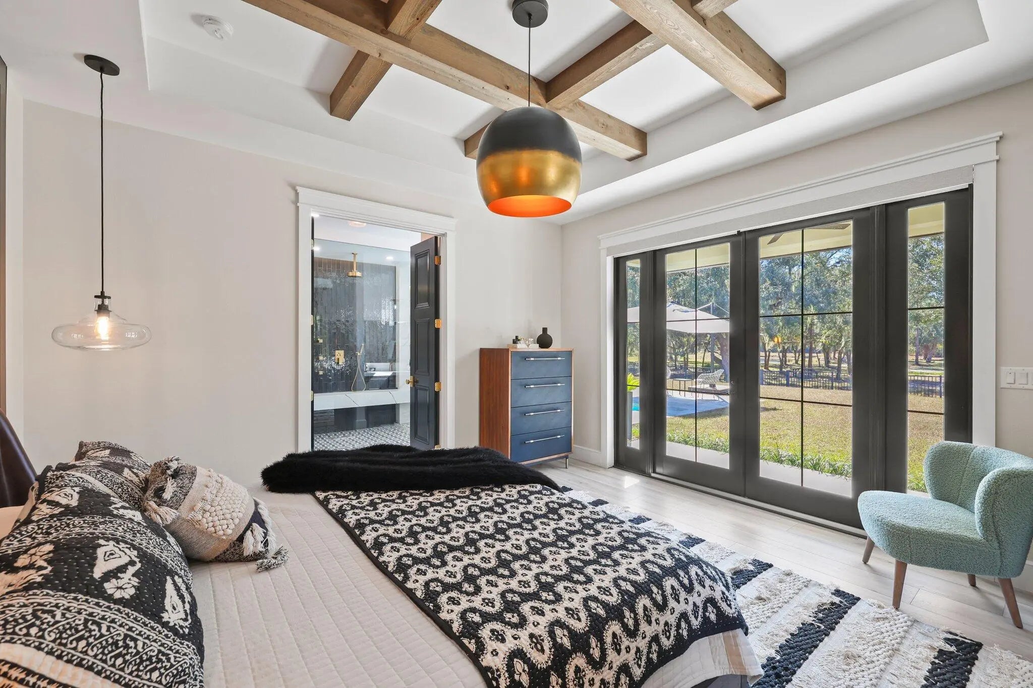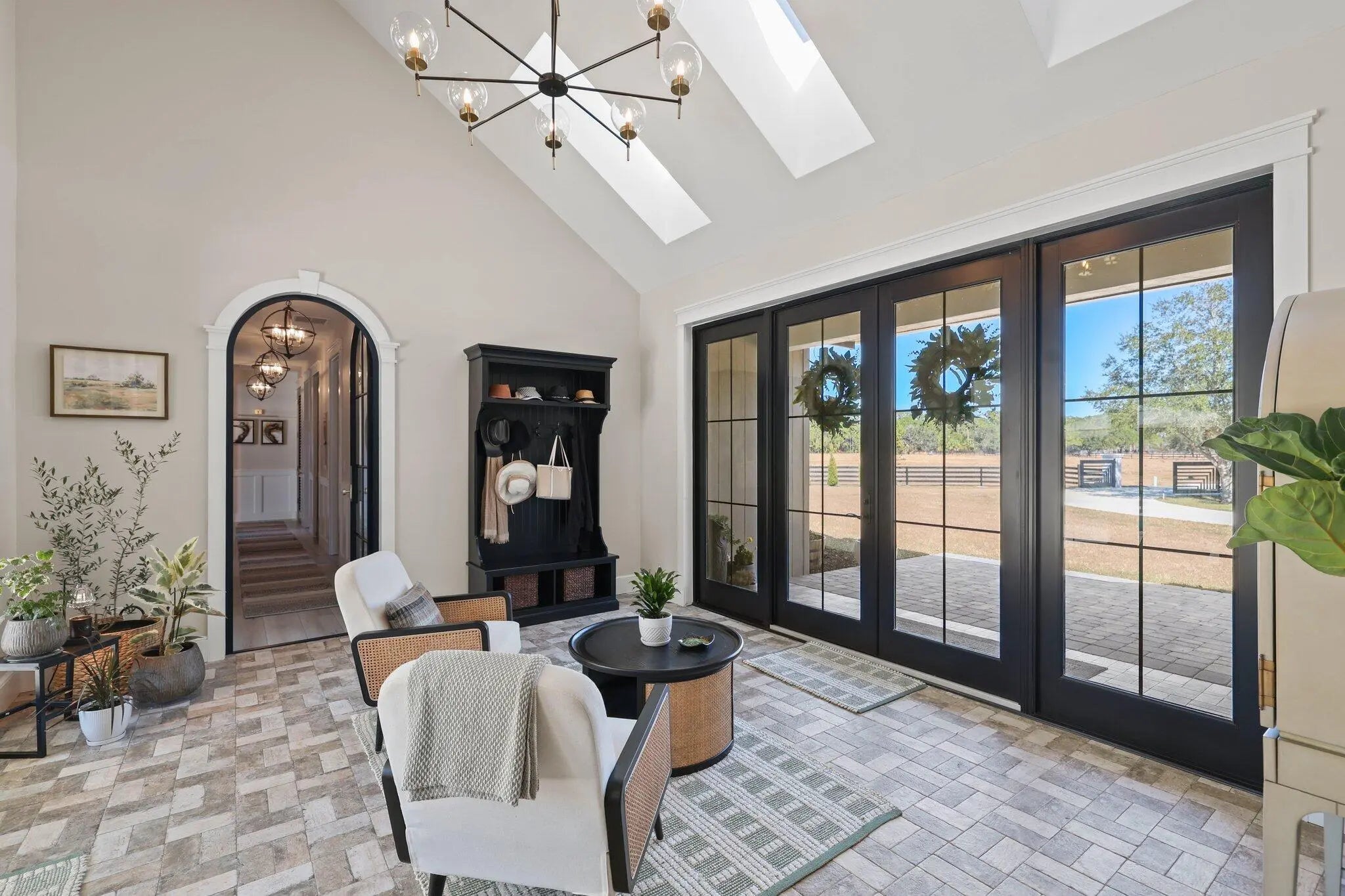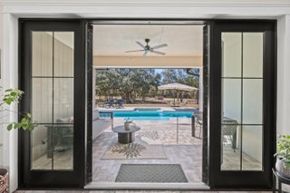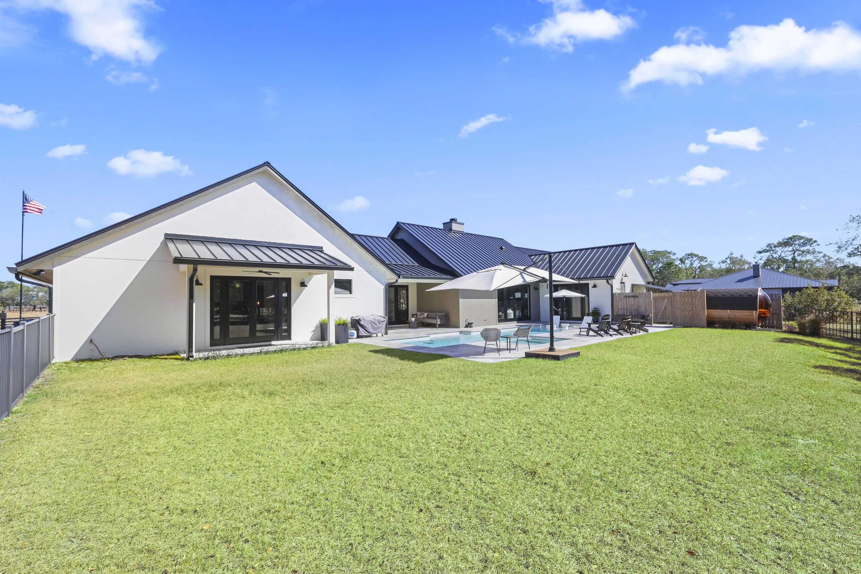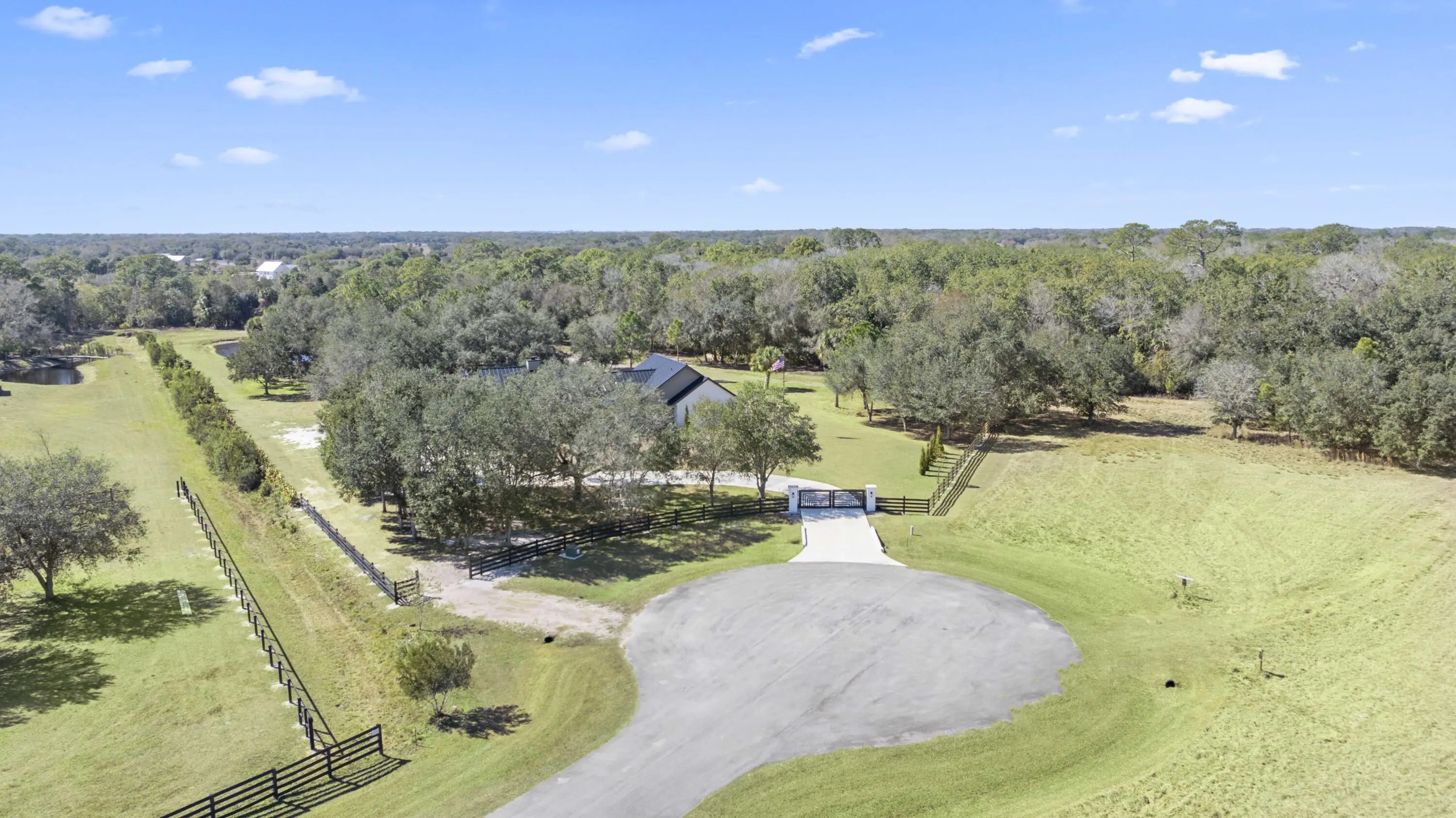 This rare, tranquil custom estate offers a blend of country living and sophisticated lifestyle in a healthy natural, spa inspired setting. Located in the highly sought out Bridlewood Ranches, a private, gated equestrian community, this exquisite 4 bedrooms/2 full 2 half bathroom luxury home was built in 2024. It is Located on 5+ acres on a cul de sac and was built with intention by owners, showcasing exceptional craftsmanship and attention to detail. Features include a standing-seam metal roof, oversized garage, hurricane-impact windows and doors and a stunning kitchen with 11' island and smart home functionality. The fully equipped, mirrored gym features professional equipment with seamless outdoor spaces including heated pool, integrated spa, and outdoor 6 person sauna/wet