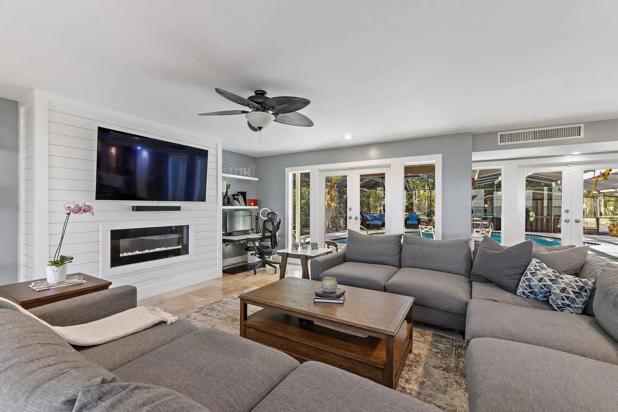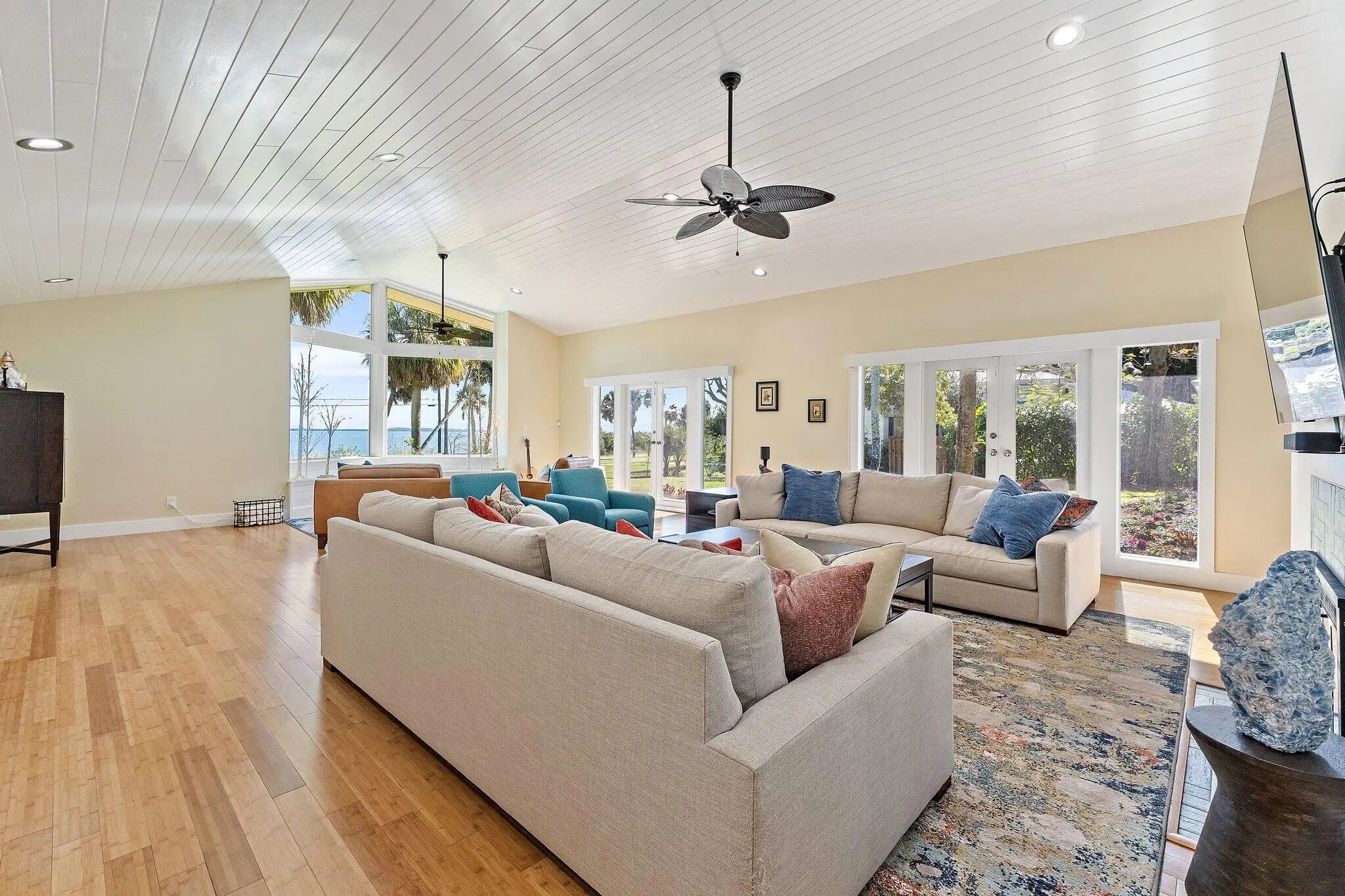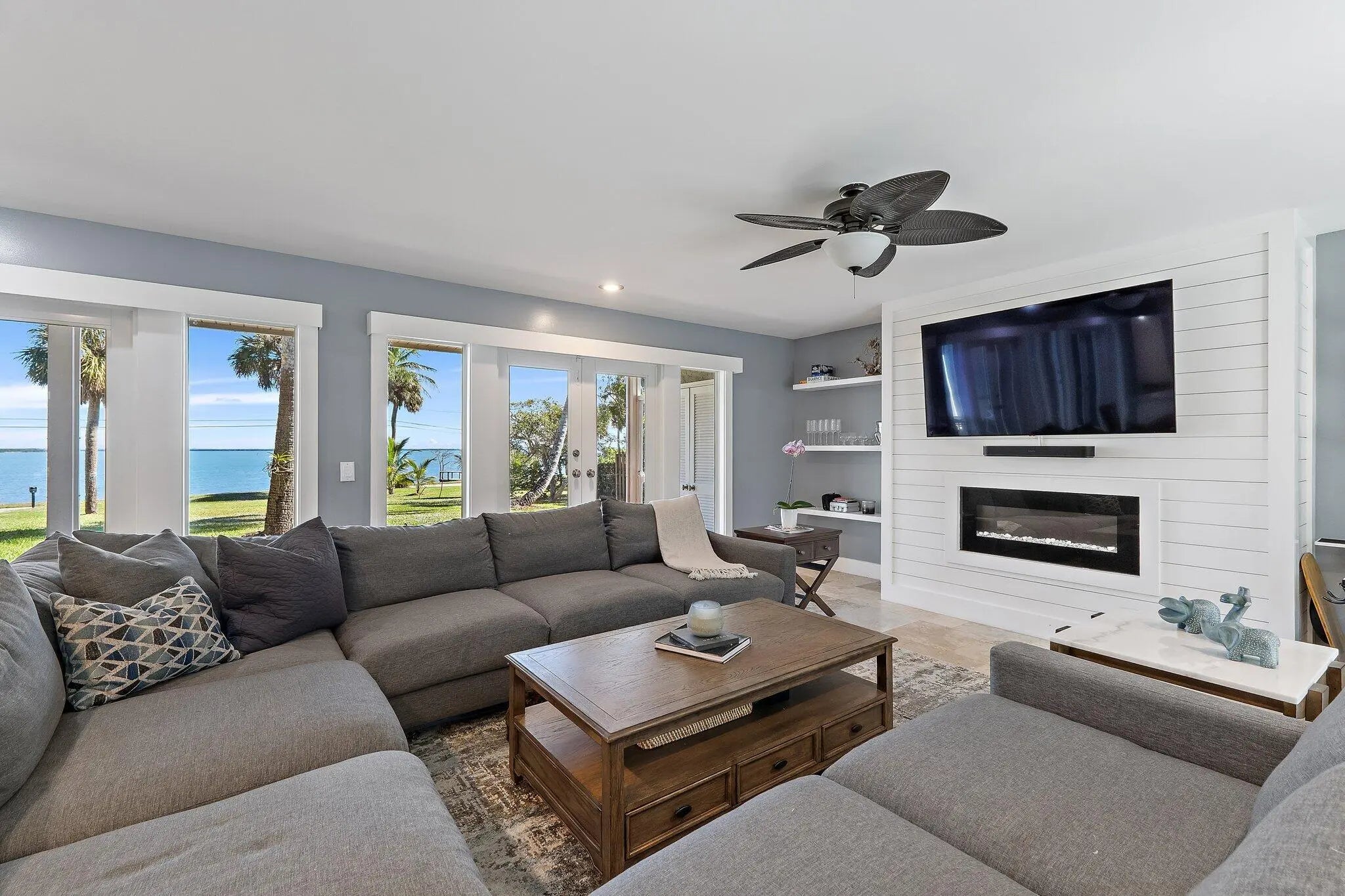 Discover the serenity of waterfront living in this private residential retreat, where breathtaking views of the scenic Indian River are enjoyed from nearly every room. Seamlessly blending timeless beauty with contemporary sophistication, the home underwent an extensive renovation from 2021-23, featuring a gourmet kitchen, spa-inspired bathrooms, full impact windows, a seamless metal roof, 2 wood burning fireplaces including one in the primary suite, a whole house generator, and updated septic system. Thoughtful details enhance everyday living, with custom built-in shelving in every bedroom closet to maximize space and minimize clutter. The open-concept kitchen and living areas create an entertainer's dream, ideal for gathering with family and friends in a light-filled setting. Step outsi
