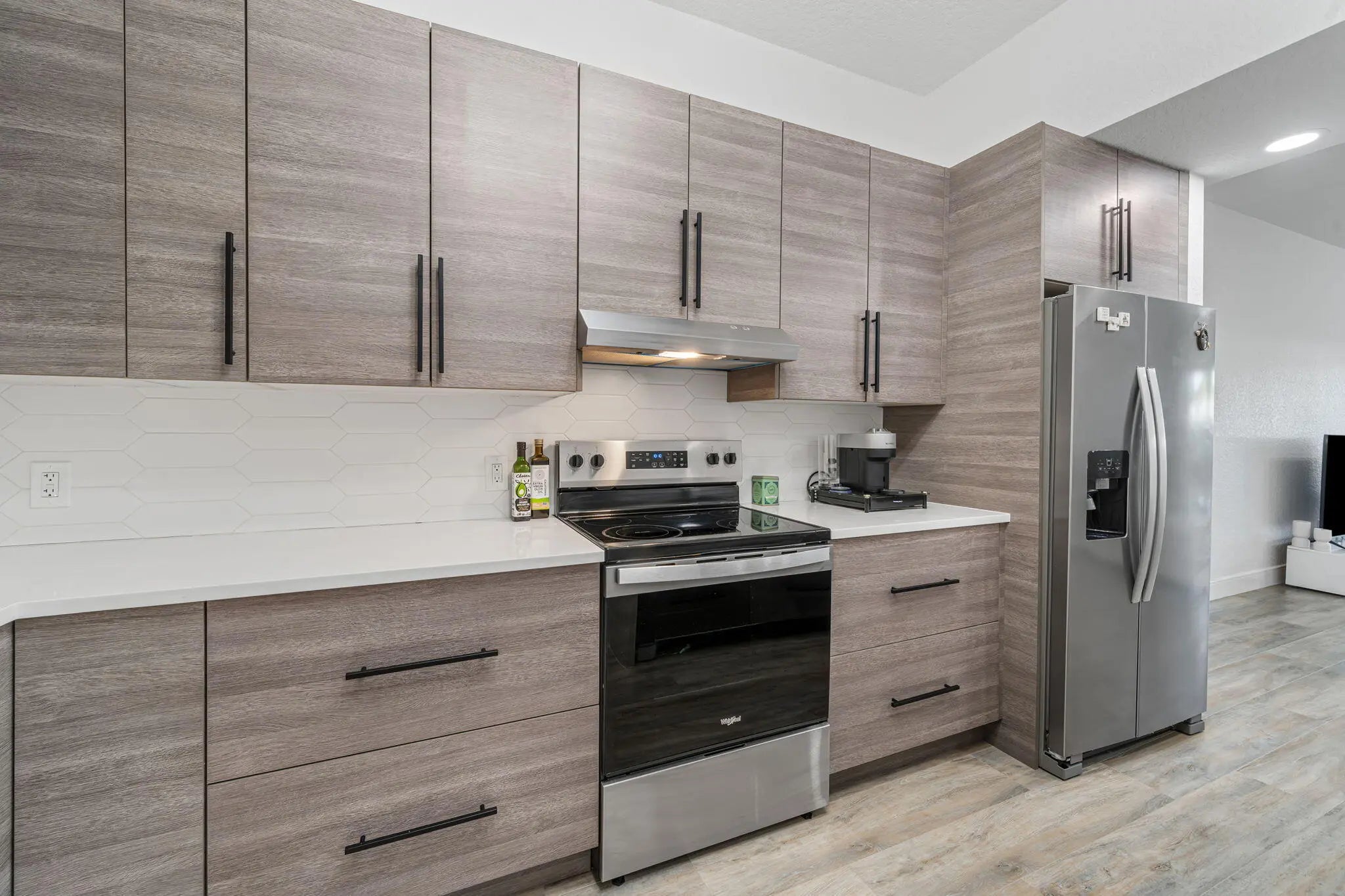 Extensively renovated unit featuring approximately $70,000 in upgrades. Open-concept kitchen with wall removal, built-in waterfall island, and granite countertops (2024). Fully renovated bathrooms with modern vanities and mirrors, Italian tile, glass shower doors, 68'' soaking tub, Bluetooth speaker in primary bath, and upgraded copper plumbing (2024).Luxury vinyl flooring with soundproof underlayment throughout. Complete professional mold remediation completed. Brand-new Whirlpool appliances including refrigerator, stove, dishwasher, and in-suite washer/dryer.Turnkey property offering modern finishes and functional open layout. Ideal for end users or investors seeking a fully updated unit.